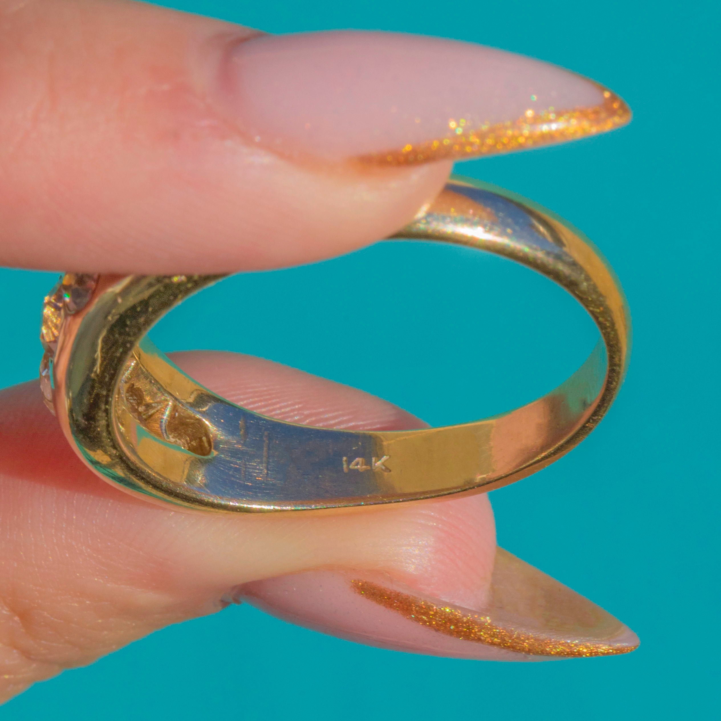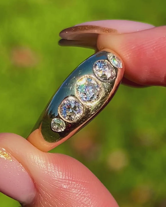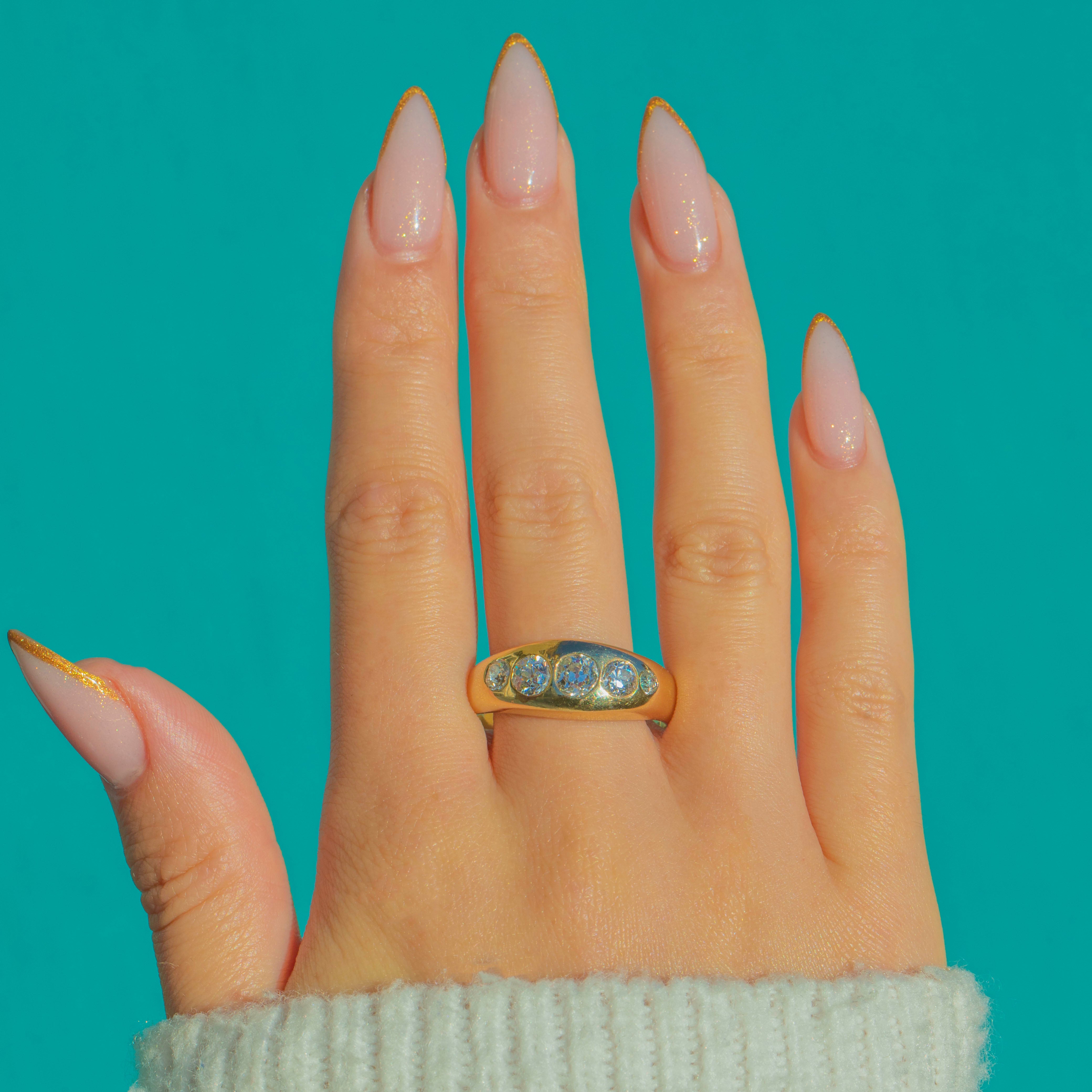 This bold and beautifully executed vintage ring showcases a glorious spread of old cut Diamonds, flush-set into a thick, gleaming band of 14ct Gold. Brimming with antique charm, each Diamond displays the crisp facets, high crowns and lively brilliance that make old cuts so enduringly beloved.