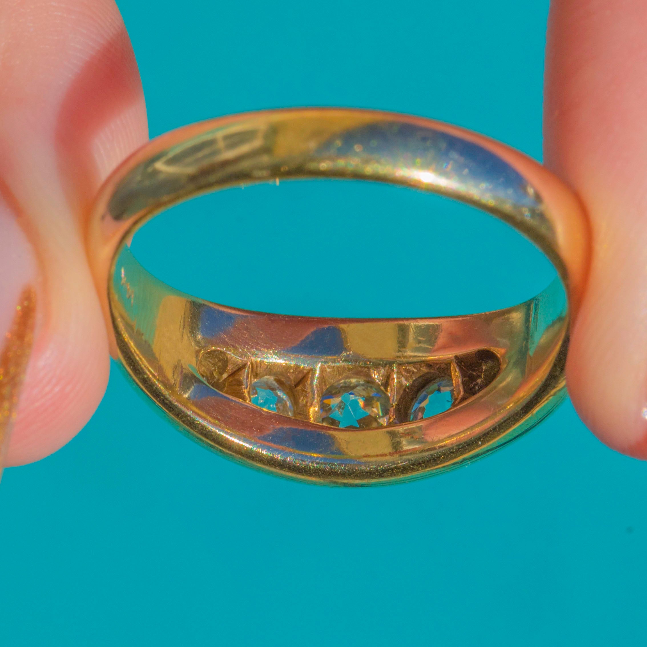 VERY GOOD-EXCELLENT: The Diamonds are bright, clear and well-cut with no chips or damage. The flush settings are secure and enhance their antique sparkle beautifully. The Gold is smooth with only light wear. The ring has been resized up several sizes in the past, giving the band a slightly elliptical shape; this is purely cosmetic, not visible when worn, comfortable on the finger, and safe to resize again.