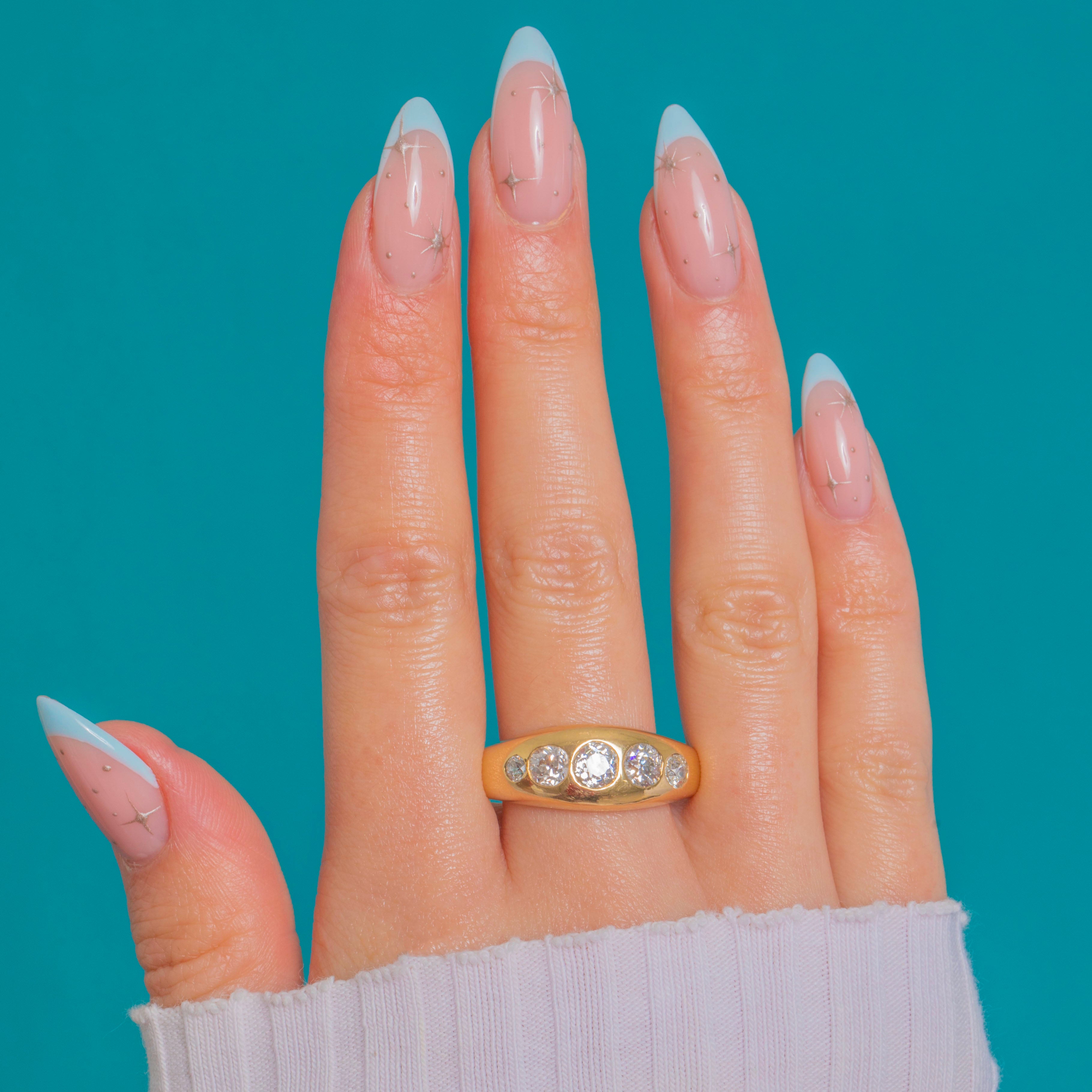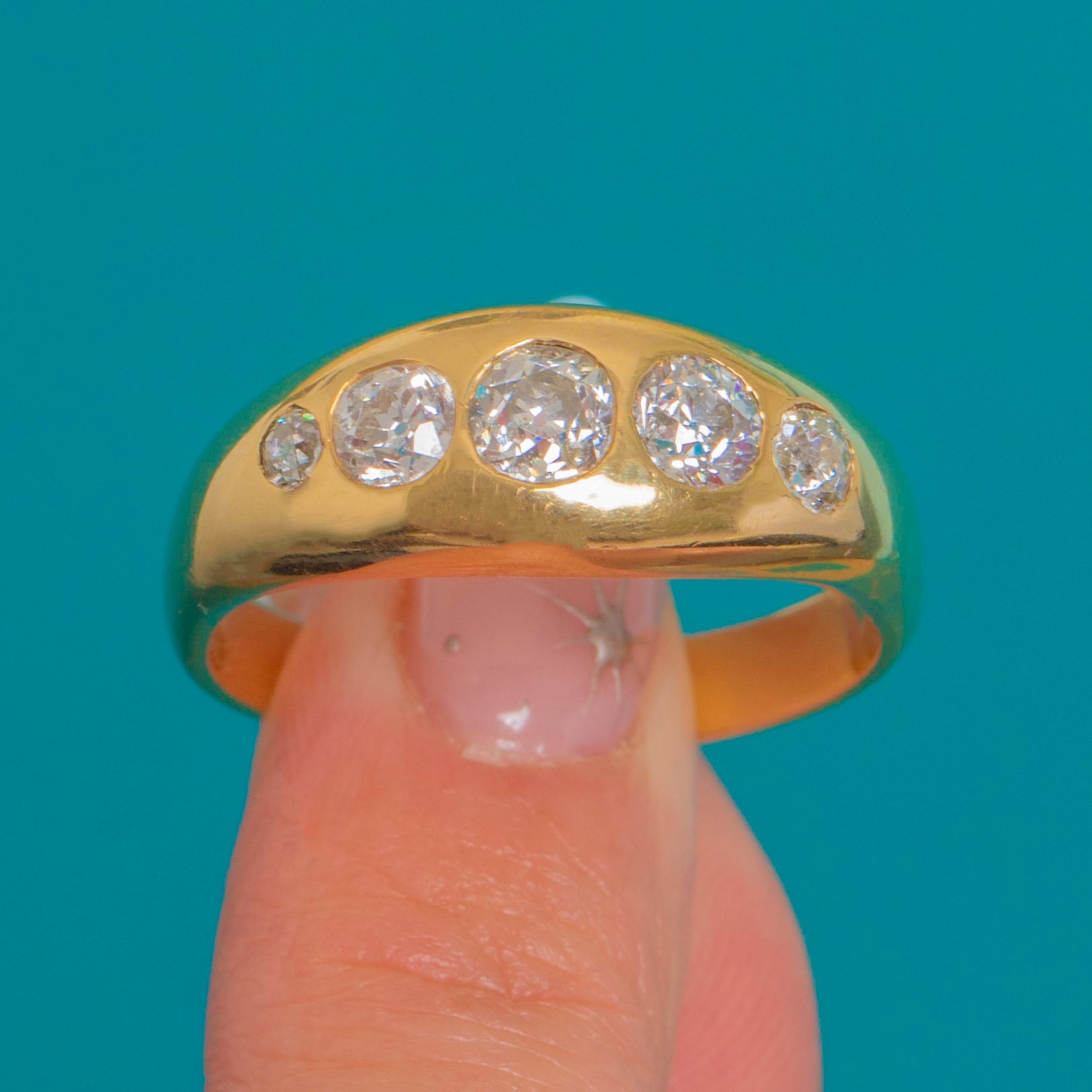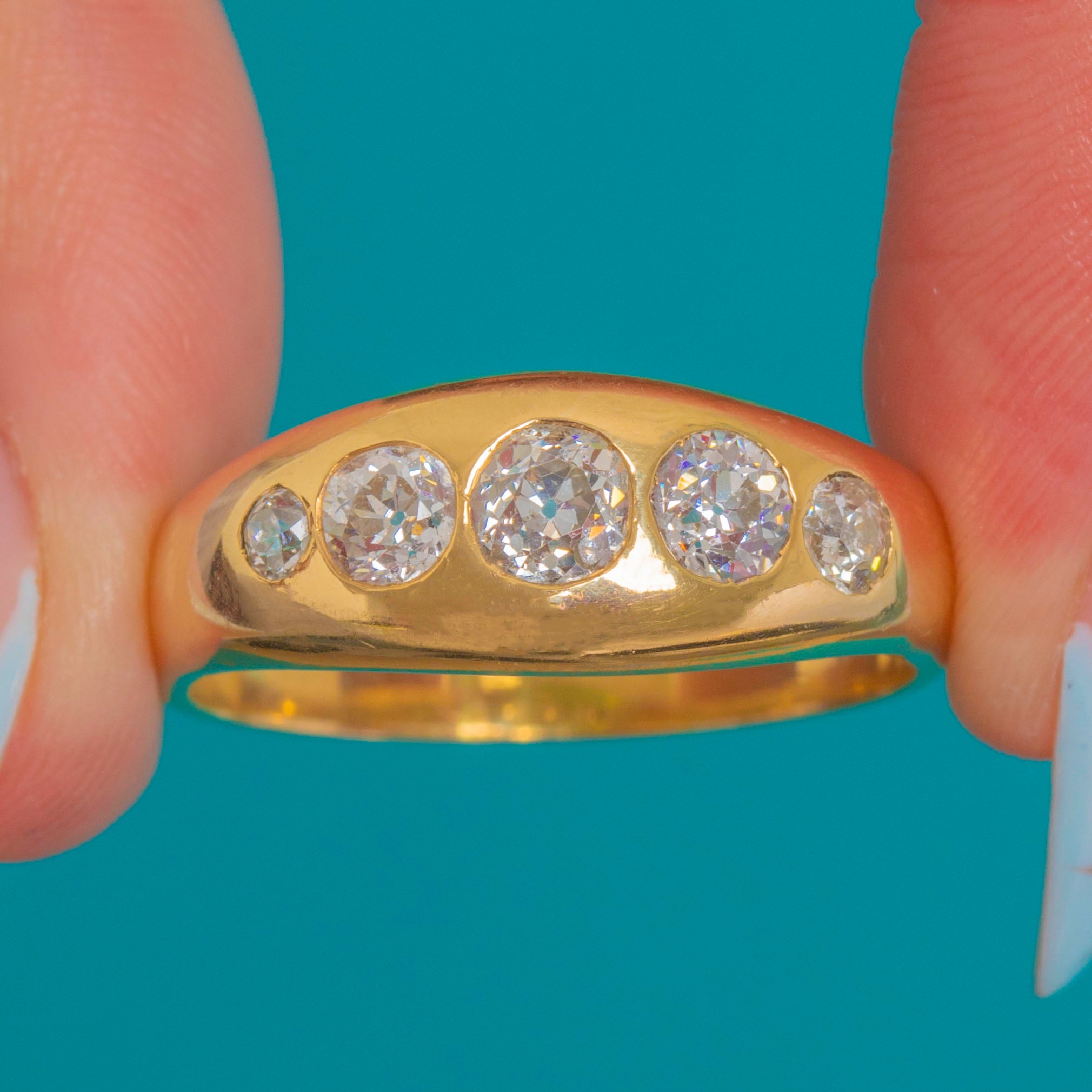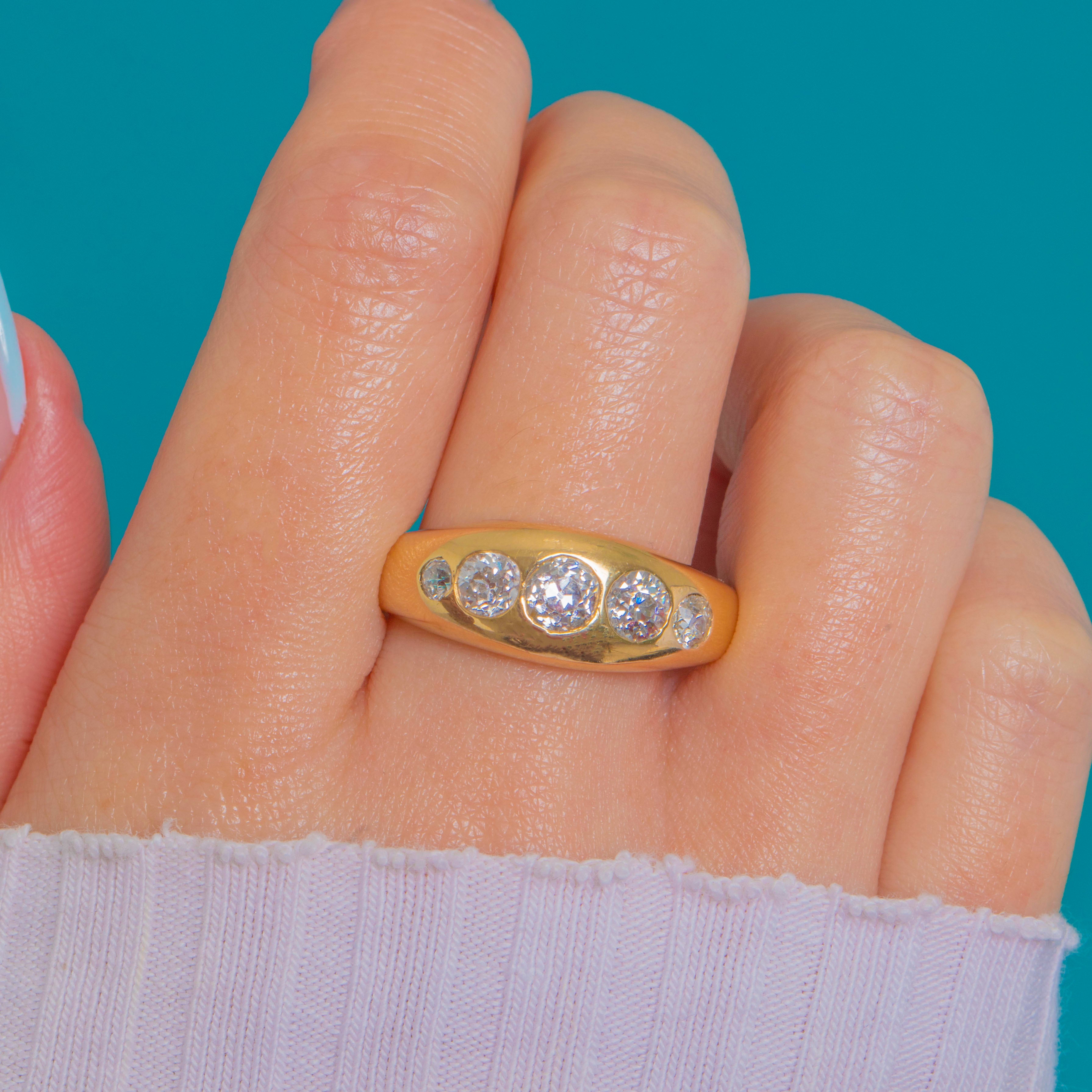 The graduated arrangement of stones gives the ring a strong, sculptural presence, with a central Diamond of approximately 0.45ct framed by a pair of 0.30ct stones and two outer accent Diamonds. The smooth, weighty Gold enhances their sparkle, creating a sleek and luxurious everyday statement piece.