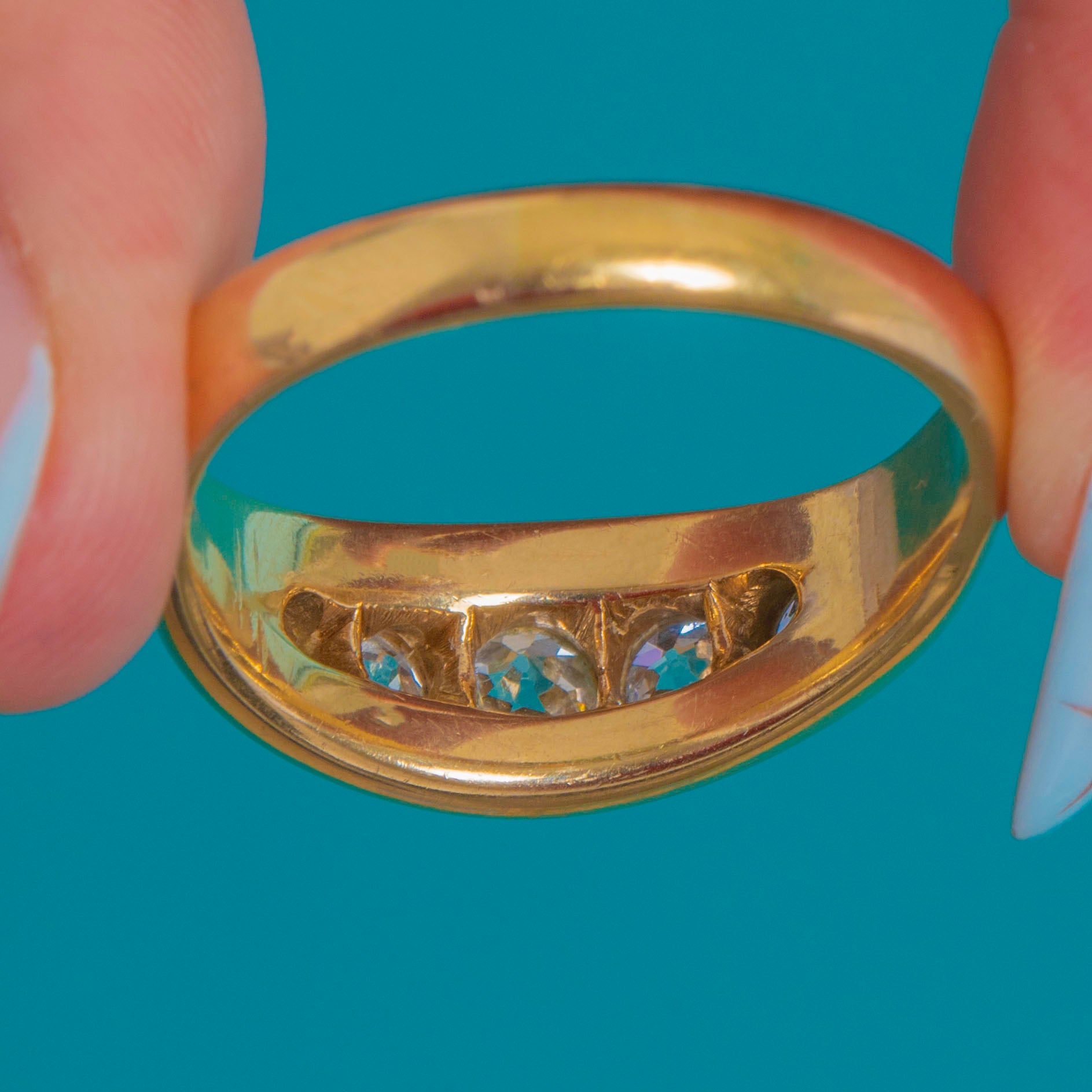 This bold and beautifully executed vintage ring showcases a glorious spread of old cut Diamonds, flush-set into a thick, gleaming band of 14ct Gold. Brimming with vintage charm, each Diamond displays the crisp facets, high crowns and lively brilliance that make old cuts so enduringly beloved.