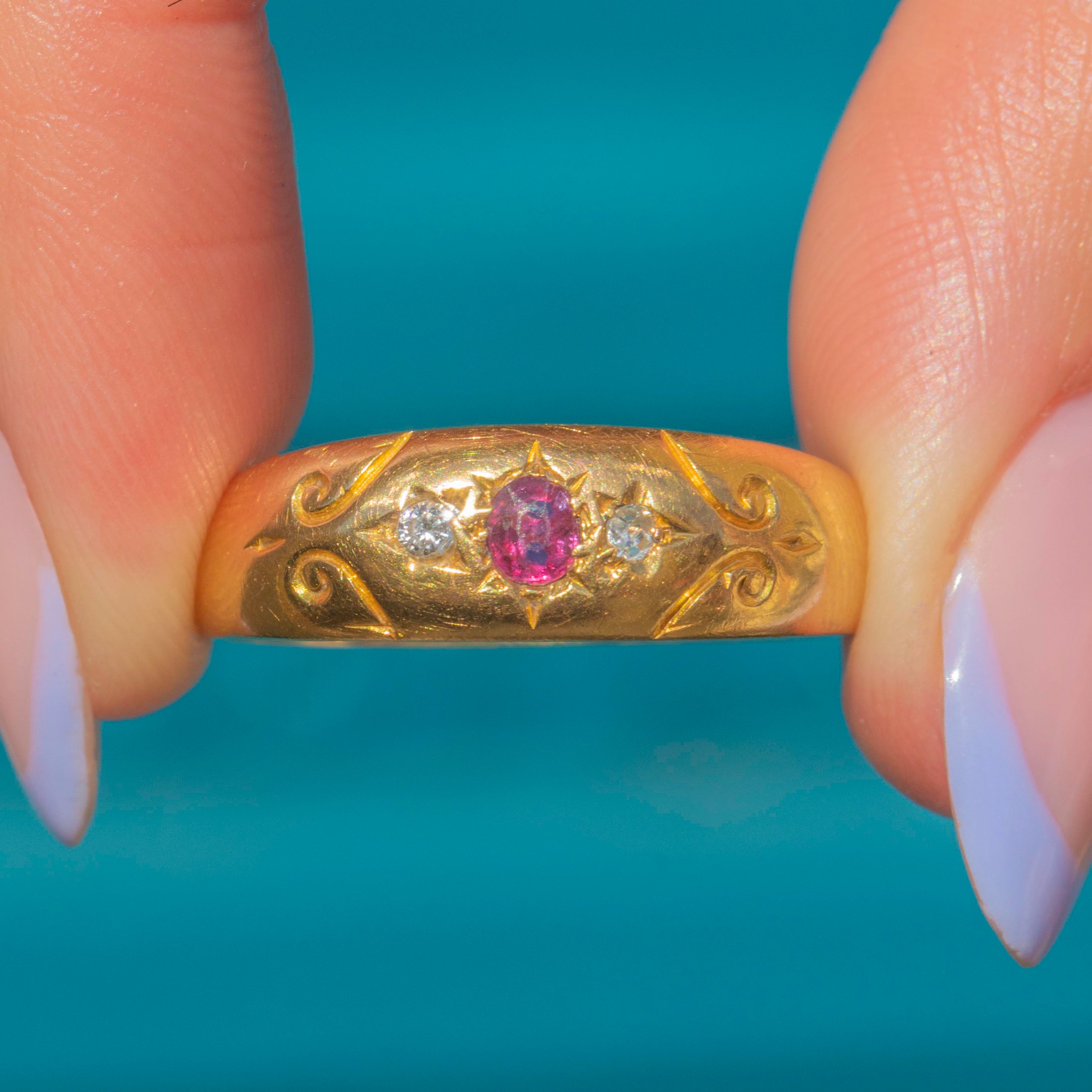 VERY GOOD: This chunky 18ct Gold Ruby Diamond gypsy ring is in very good condition. The Gold has a rich saturation and the engraved details have remained defined. Under close inspection, there is a minor chip to the Ruby and one of the Diamonds has some fleabites, but this does not detract from the overall impact of the ring and they are all secure in their settings. There is a faint reseize mark on the back of the band, but the band is robust and feels comfortable to wear. The hallmarks are fully legible, allowing us to accurately date this gorgeous antique trilogy ring to 1901!