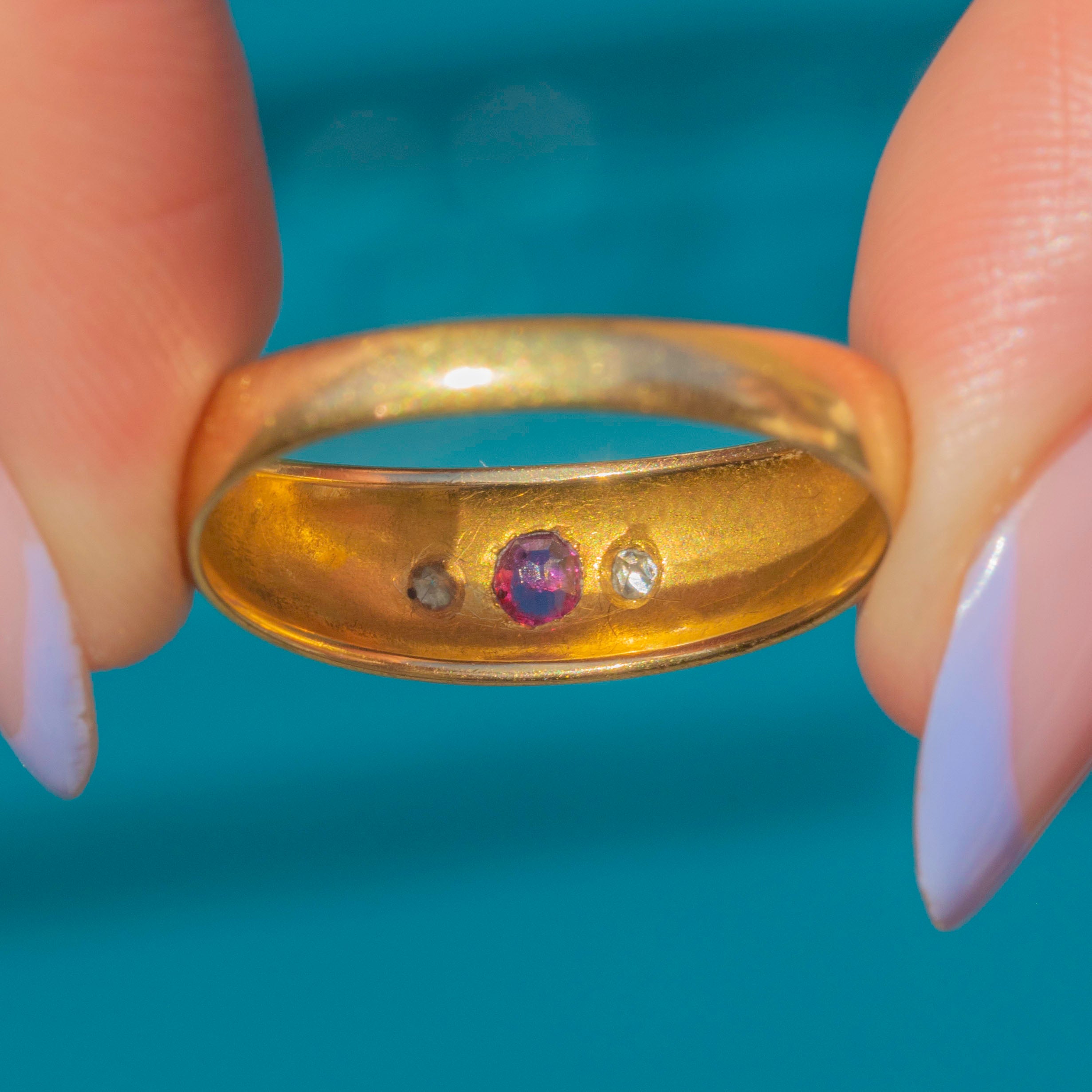 VERY GOOD: This chunky 18ct Gold Ruby Diamond gypsy ring is in very good condition. The Gold has a rich saturation and the engraved details have remained defined. Under close inspection, there is a minor chip to the Ruby and one of the Diamonds has some fleabites, but this does not detract from the overall impact of the ring and they are all secure in their settings. There is a faint reseize mark on the back of the band, but the band is robust and feels comfortable to wear. The hallmarks are fully legible, allowing us to accurately date this gorgeous antique trilogy ring to 1901!