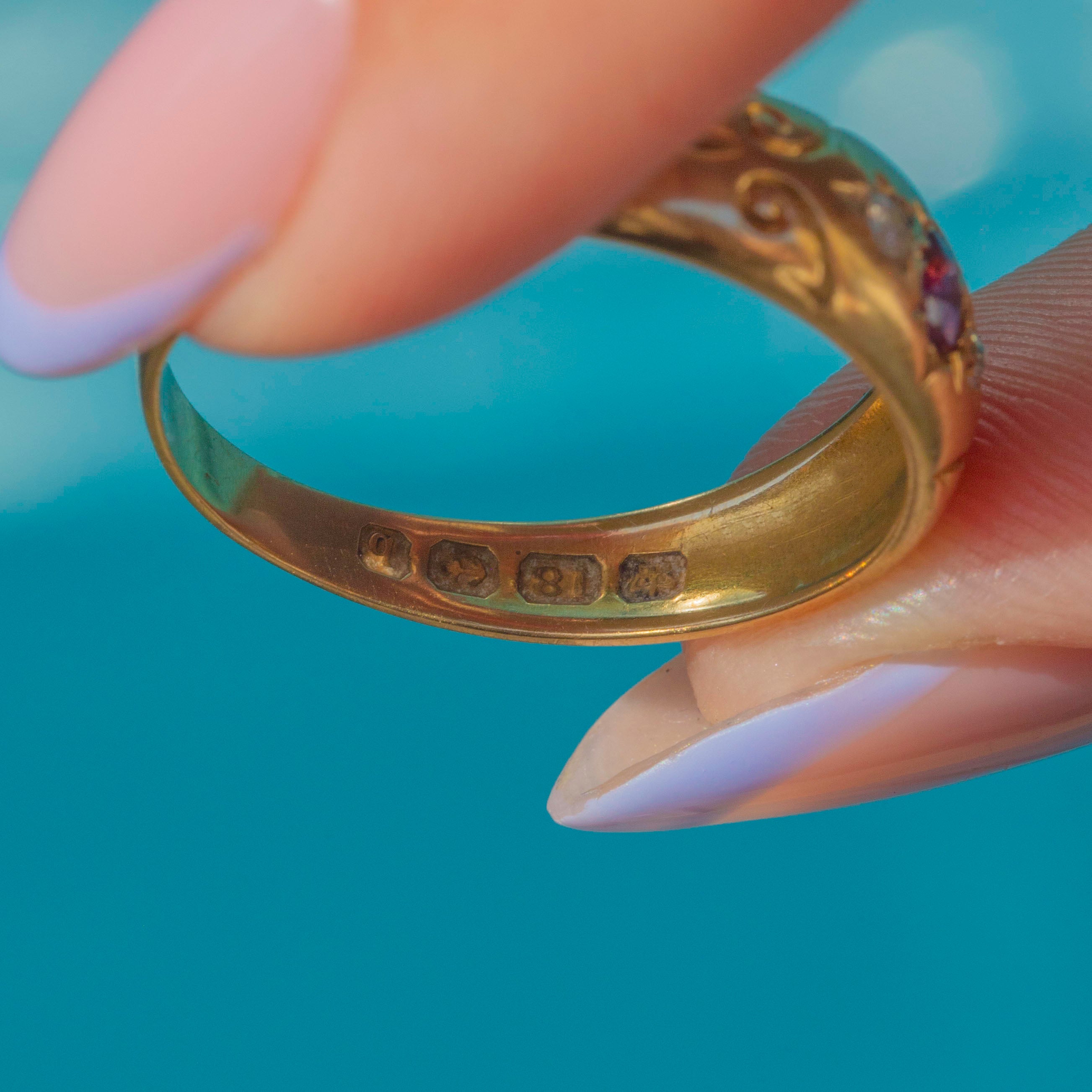 VERY GOOD: This chunky 18ct Gold Ruby Diamond gypsy ring is in very good condition. The Gold has a rich saturation and the engraved details have remained defined. Under close inspection, there is a minor chip to the Ruby and one of the Diamonds has some fleabites, but this does not detract from the overall impact of the ring and they are all secure in their settings. There is a faint reseize mark on the back of the band, but the band is robust and feels comfortable to wear. The hallmarks are fully legible, allowing us to accurately date this gorgeous antique trilogy ring to 1901!