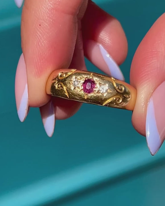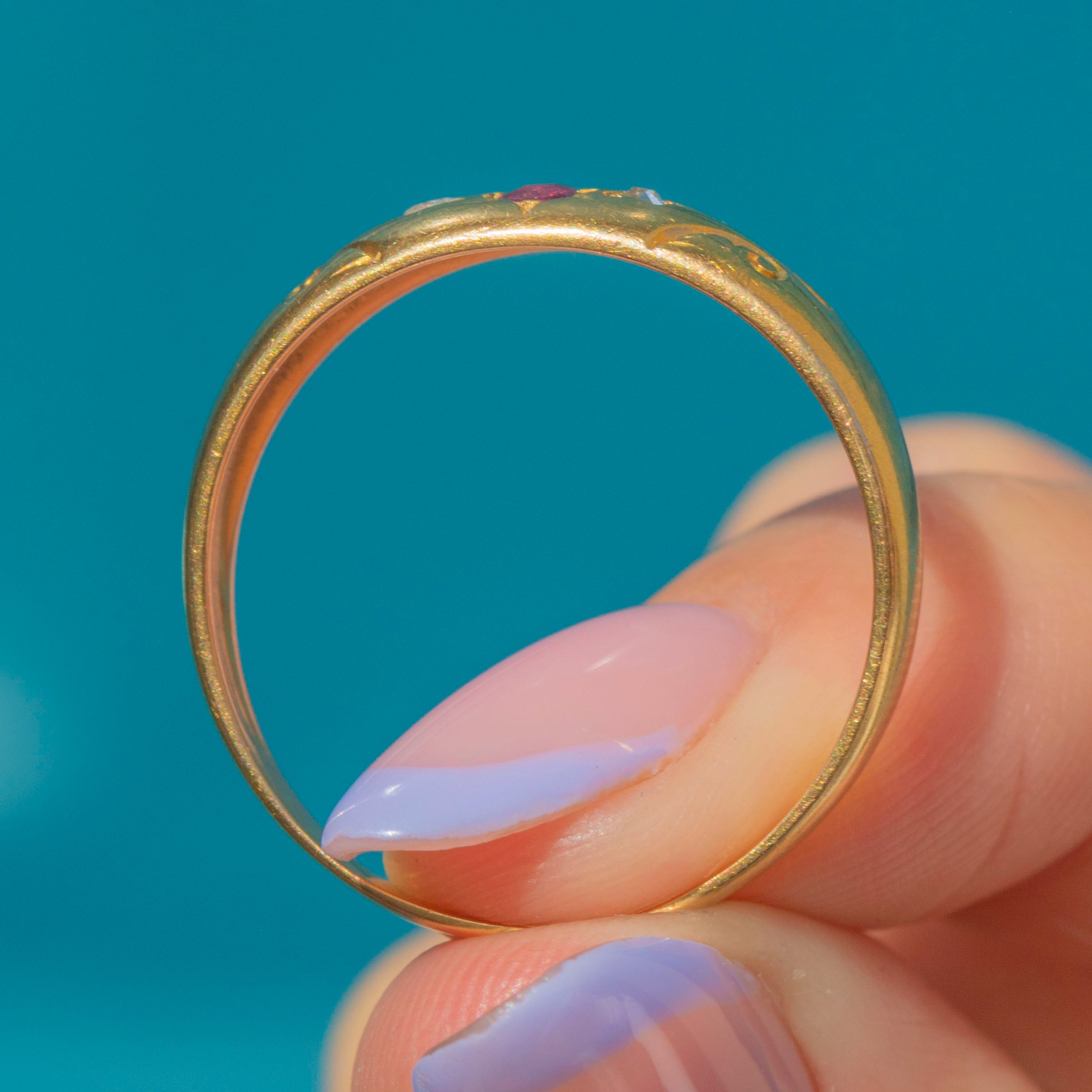 This chunky 18ct Gold Ruby Diamond gypsy ring will add a touch of celestial charm to your curated ring stack! Crafted from brightly saturated 18ct Gold, this Edwardian ring displays a glimmering gemstone trilogy across its centre and boasts a full set of English hallmarks dating to 1901.