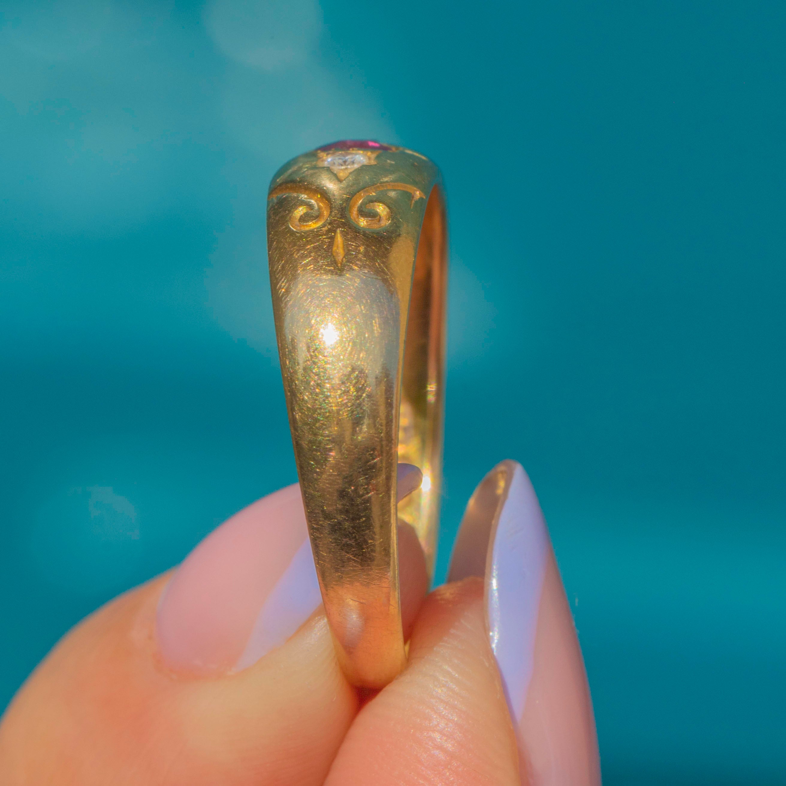 VERY GOOD: This chunky 18ct Gold Ruby Diamond gypsy ring is in very good condition. The Gold has a rich saturation and the engraved details have remained defined. Under close inspection, there is a minor chip to the Ruby and one of the Diamonds has some fleabites, but this does not detract from the overall impact of the ring and they are all secure in their settings. There is a faint reseize mark on the back of the band, but the band is robust and feels comfortable to wear. The hallmarks are fully legible, allowing us to accurately date this gorgeous antique trilogy ring to 1901!