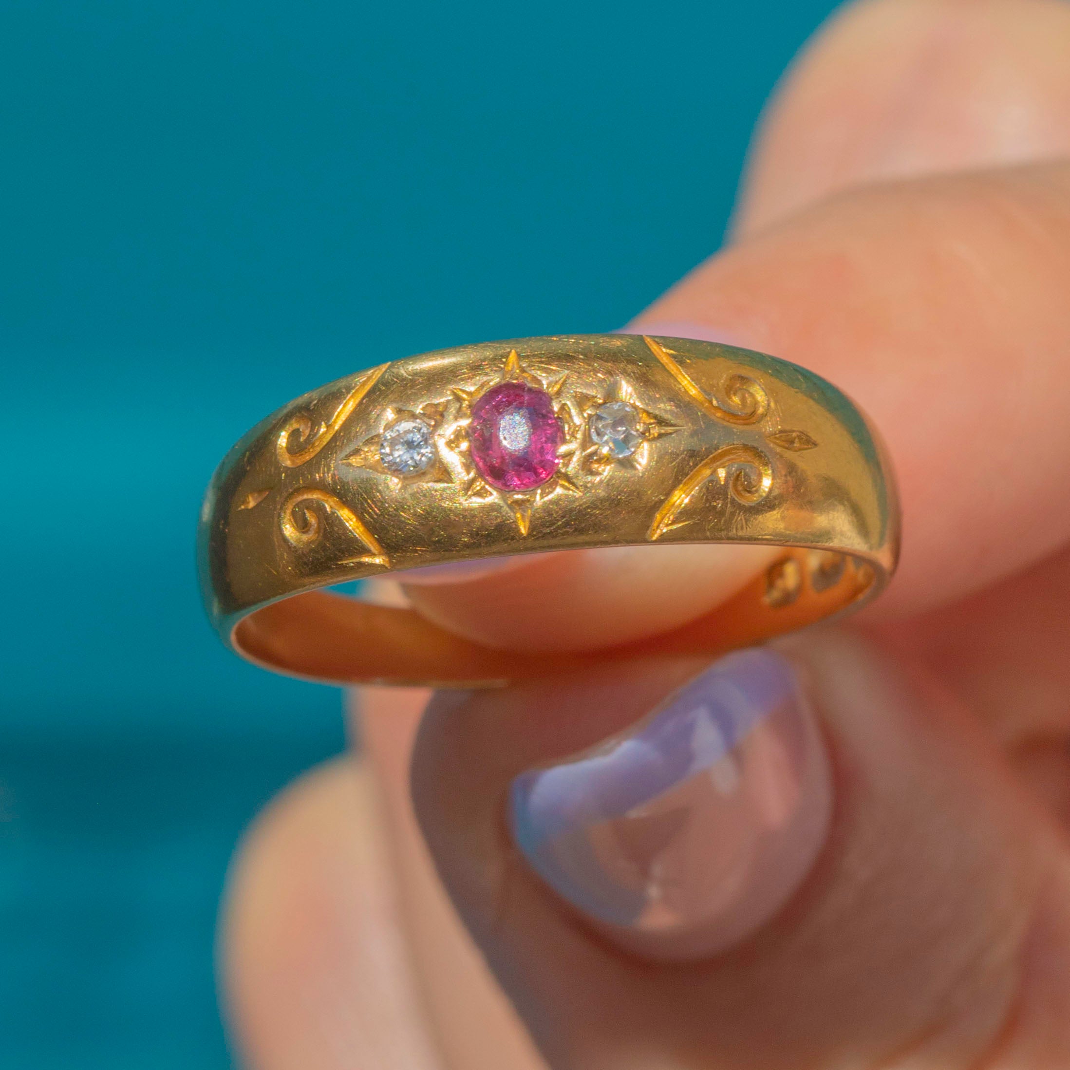 VERY GOOD: This chunky 18ct Gold Ruby Diamond gypsy ring is in very good condition. The Gold has a rich saturation and the engraved details have remained defined. Under close inspection, there is a minor chip to the Ruby and one of the Diamonds has some fleabites, but this does not detract from the overall impact of the ring and they are all secure in their settings. There is a faint reseize mark on the back of the band, but the band is robust and feels comfortable to wear. The hallmarks are fully legible, allowing us to accurately date this gorgeous antique trilogy ring to 1901!