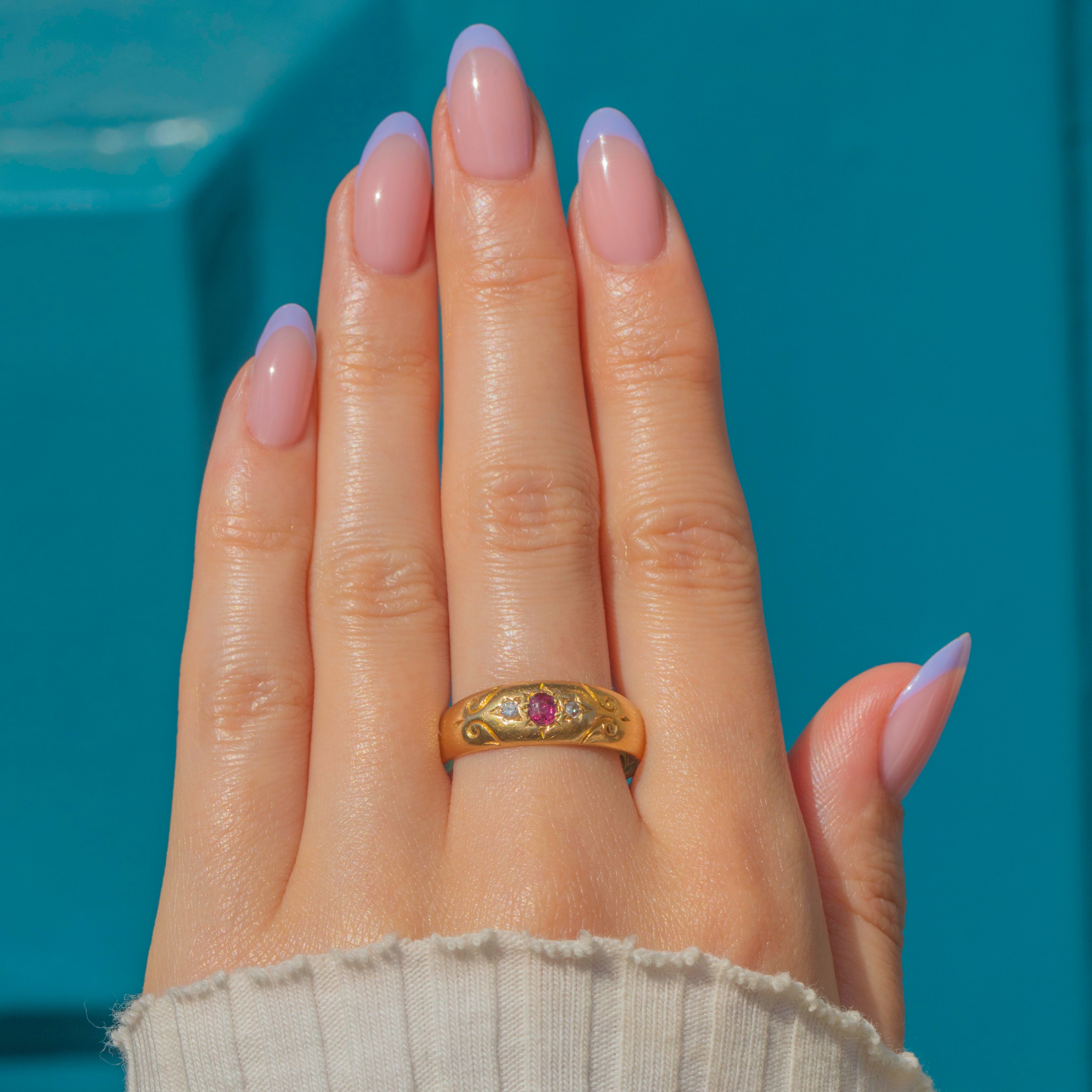 The fuchsia Ruby and subtly sparkling Diamonds are presented within stylistic star settings, framed by swirling engraved details. The low profile of this sumptuous Edwardian gypsy ring makes it perfect for everyday wear, whether worn alone or stacked amongst your other favourite jewels!