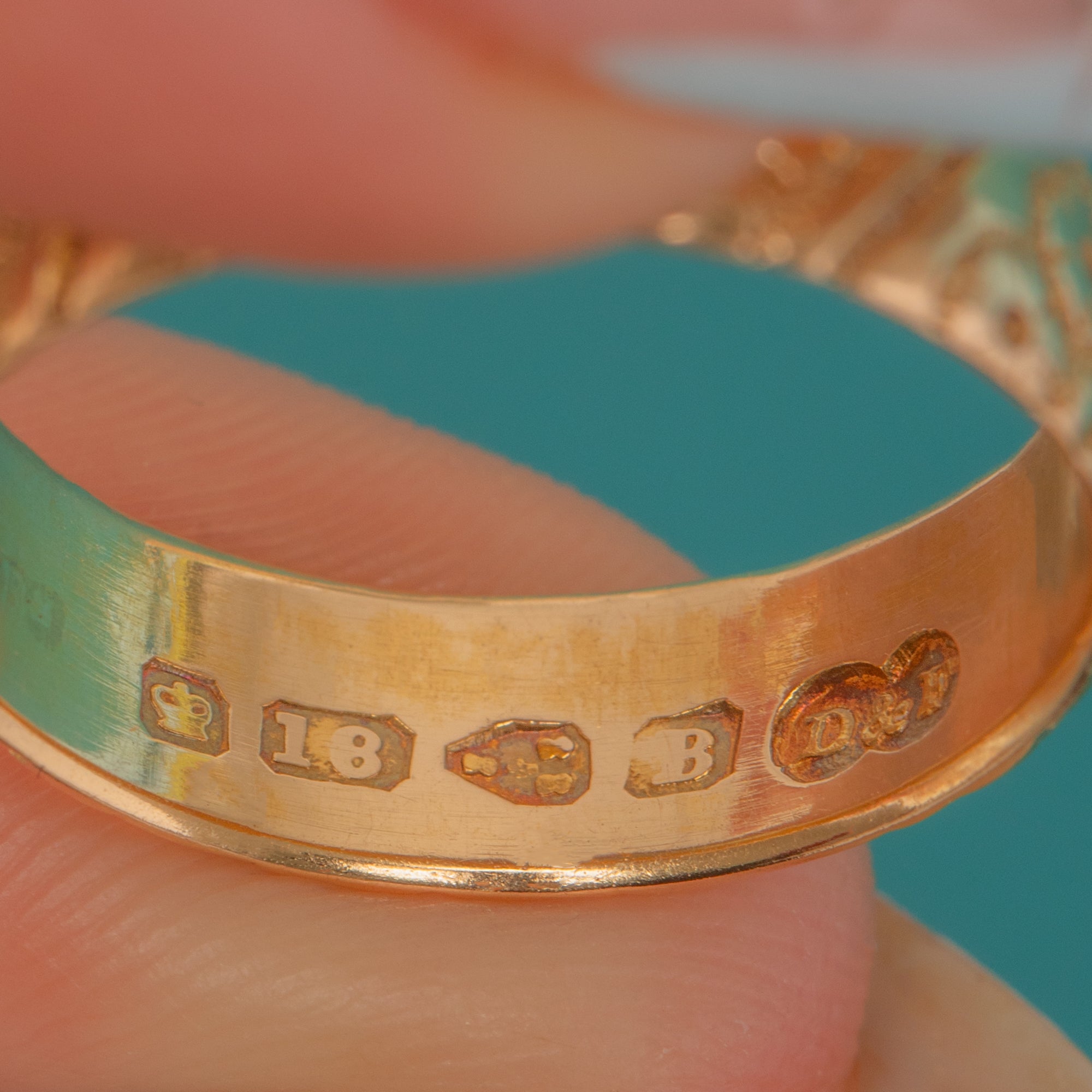 EXCELLENT: The hand-engraved decoration is crisp with only light surface wear and gentle softening to the highest points commensurate with age. The shank is round and sturdy with deeply struck, clear hallmarks inside; no evidence of resizing or repairs.