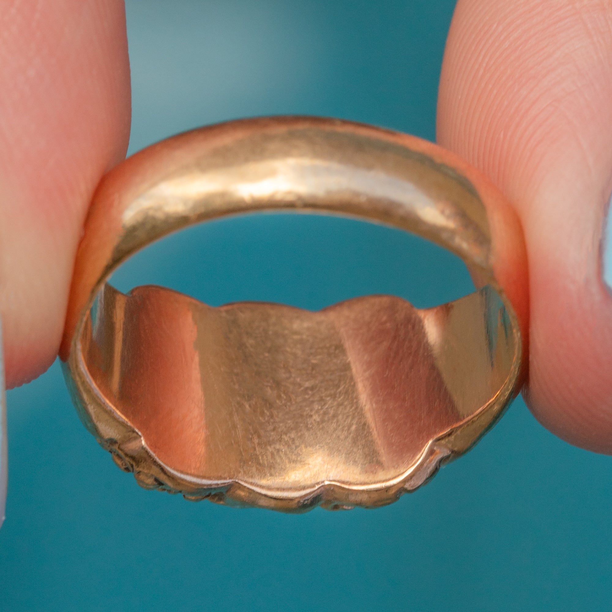 EXCELLENT. The Gold is bright with a gorgeous rosy hue, and the details have all remained crisp. The chunky ring band feels comfortable to wear and comes complete with a full set of antique hallmarks, allowing us to accurately date it to 1914!