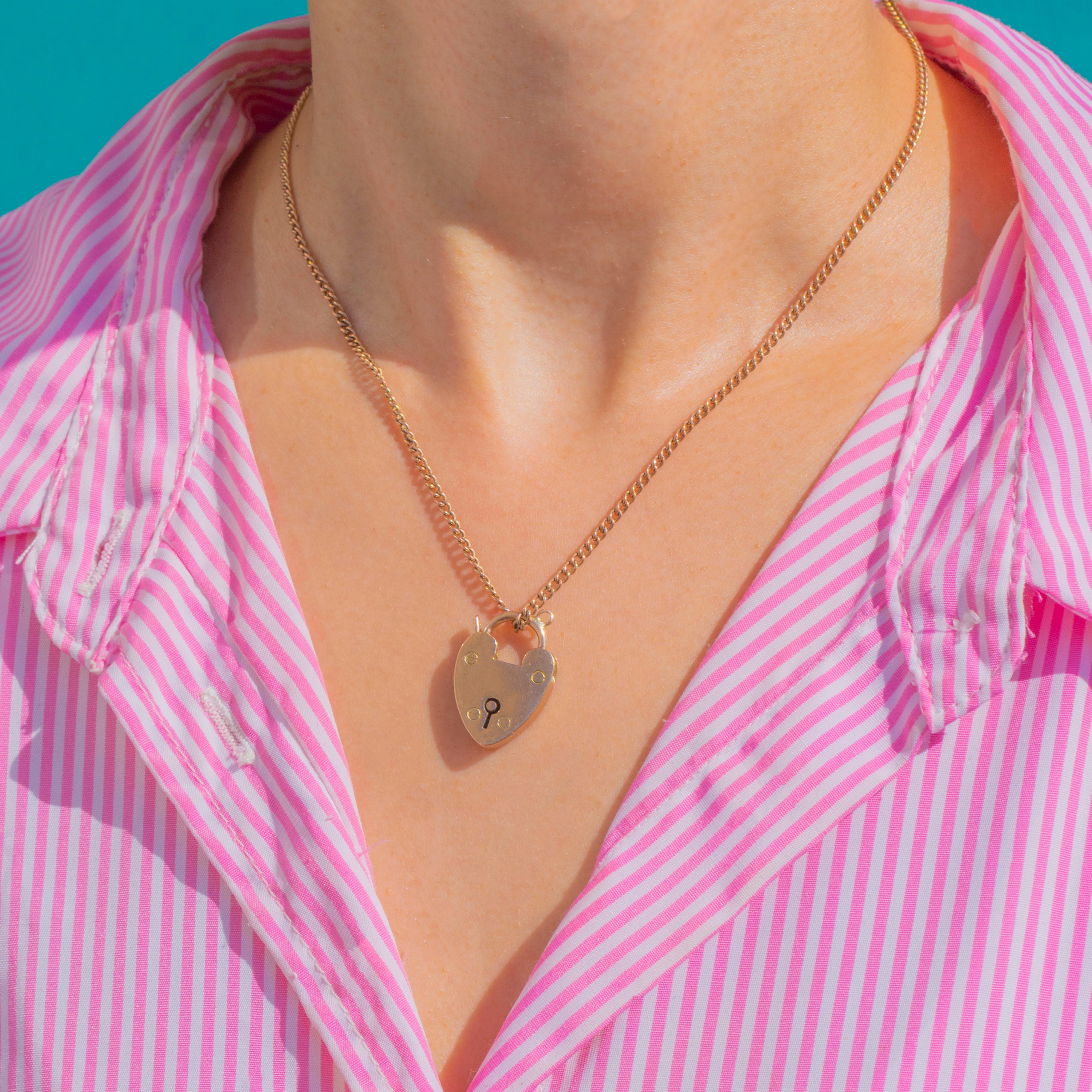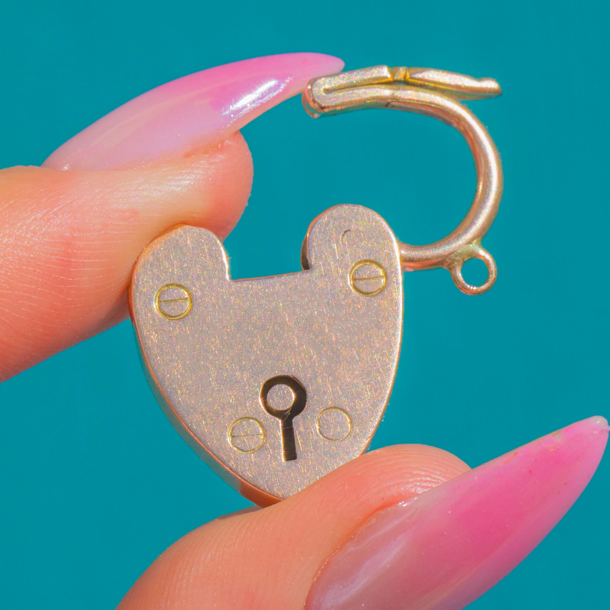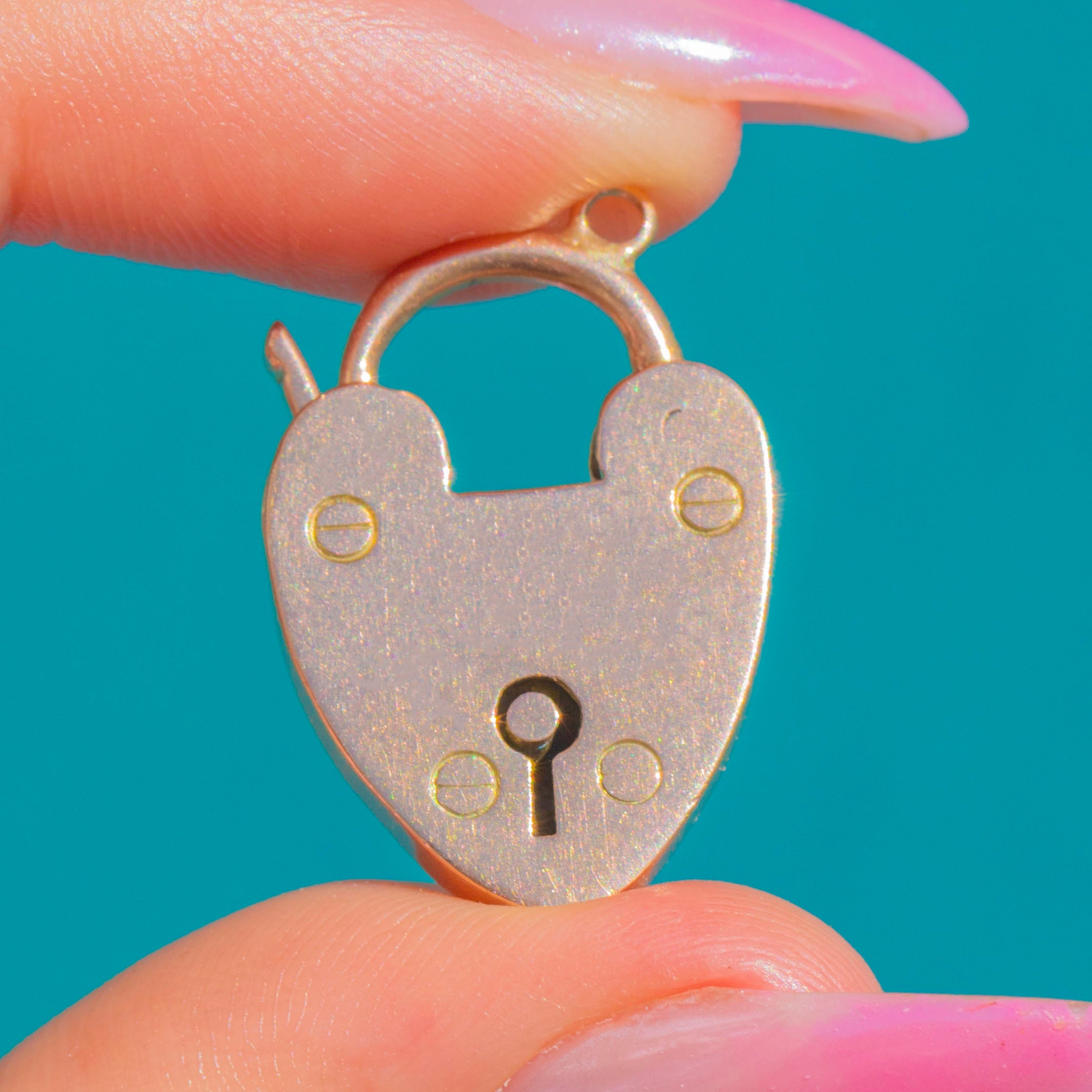 A classic Edwardian heart padlock rendered in 9ct Gold, with a romantic keyhole at its centre and four neat screw-head motifs at the corners. The front has a soft satin sheen that contrasts with polished edges, giving this petite charm a chic, tactile presence.