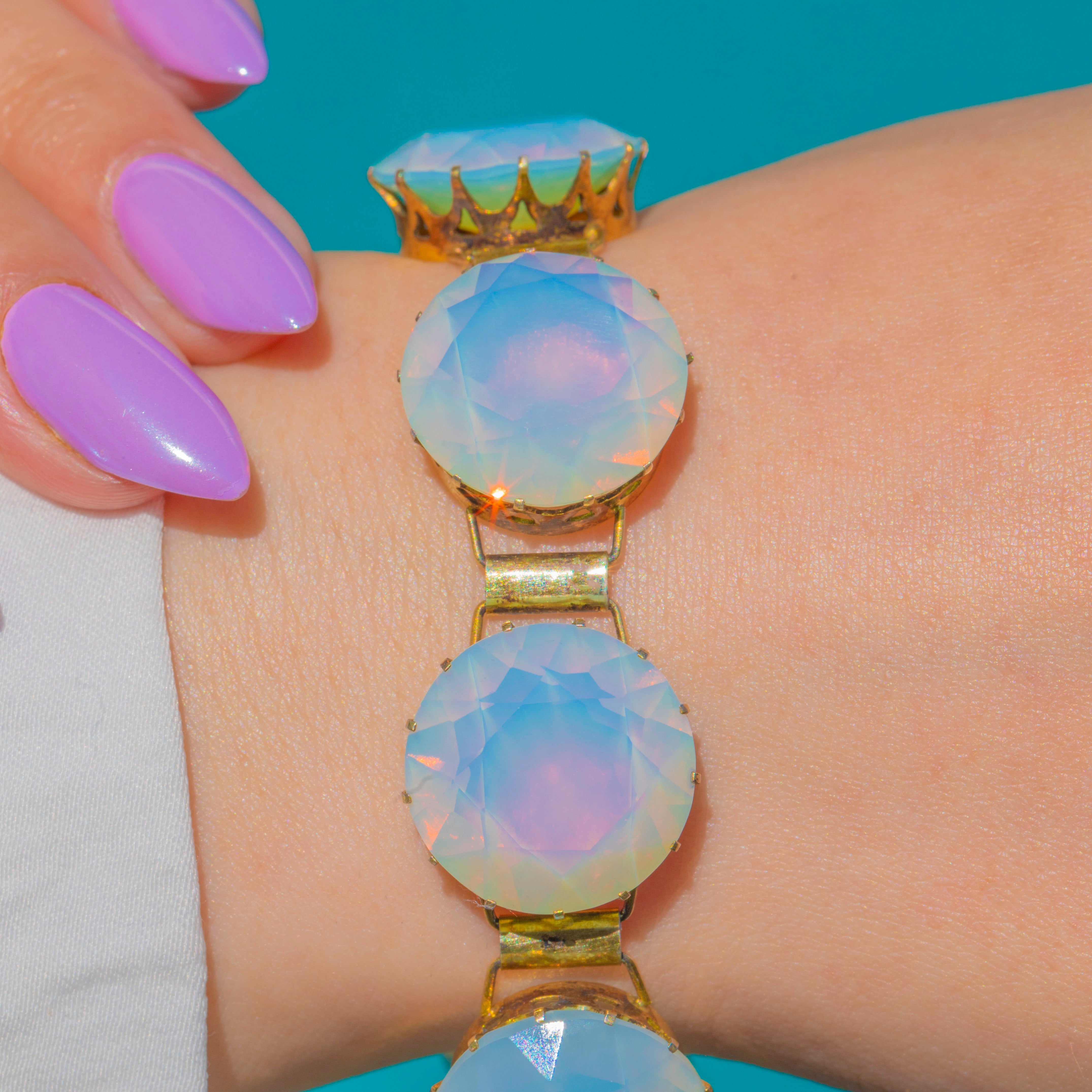 Utterly captivating in its glow, this chunky Victorian bracelet showcases sumptuous rounds of Opaline glass whose pale, moonlit bodies dance with pink, green and orange flashes at every turn. Each large, faceted stone is cradled in a high crown, prong-set setting with decorative openwork detail, the warm sheen of Gilded Sterling Silver adding a regal finish.