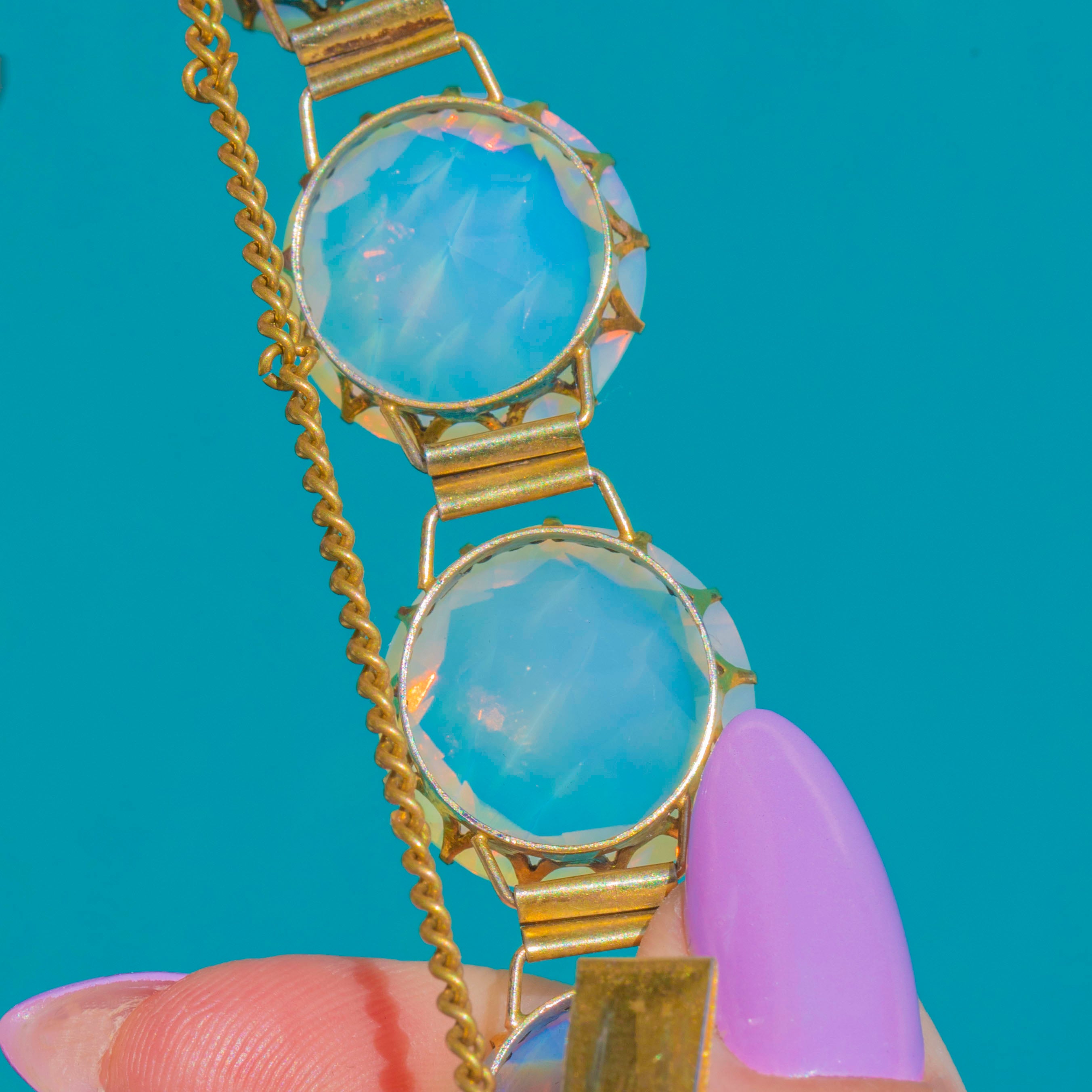 EXCELLENT: The Opaline glass stones are bright and lively with only the most minor surface scuffs visible under close inspection, and no chips or cracks observed. The Gilded Sterling Silver settings and links are secure with light, even wear to the gilding commensurate with age. The box clasp closes securely, the safety chain is intact, and there are no obvious signs of repair.