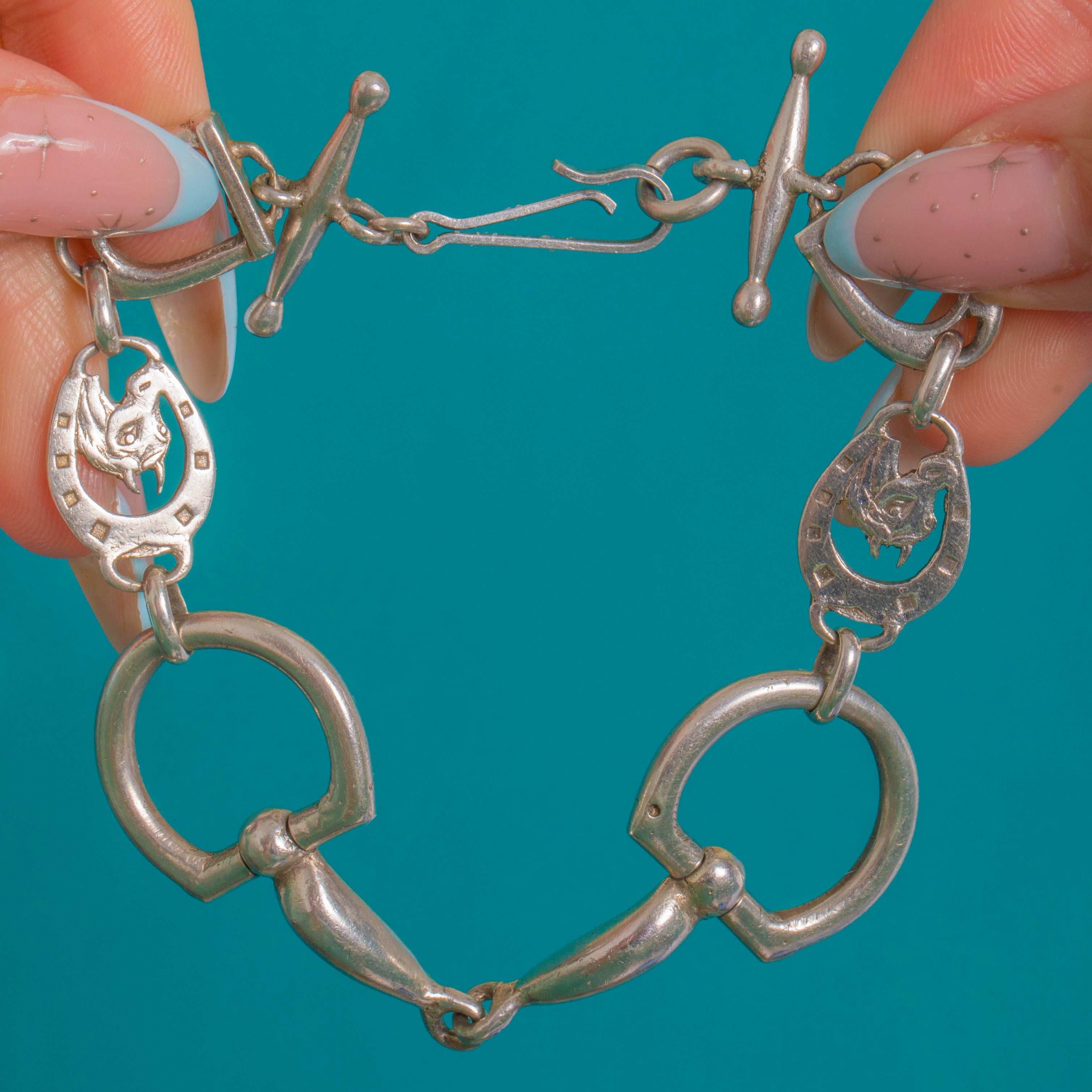 Celebrate equestrian chic with this chunky Vintage Sterling Silver bracelet, sculpted in a striking parade of horseshoe-and-horse head plaques, stirrups, and snaffle‑bit links. The bold, articulated design flows around the wrist with graphic clarity and a pleasing, weighty feel.