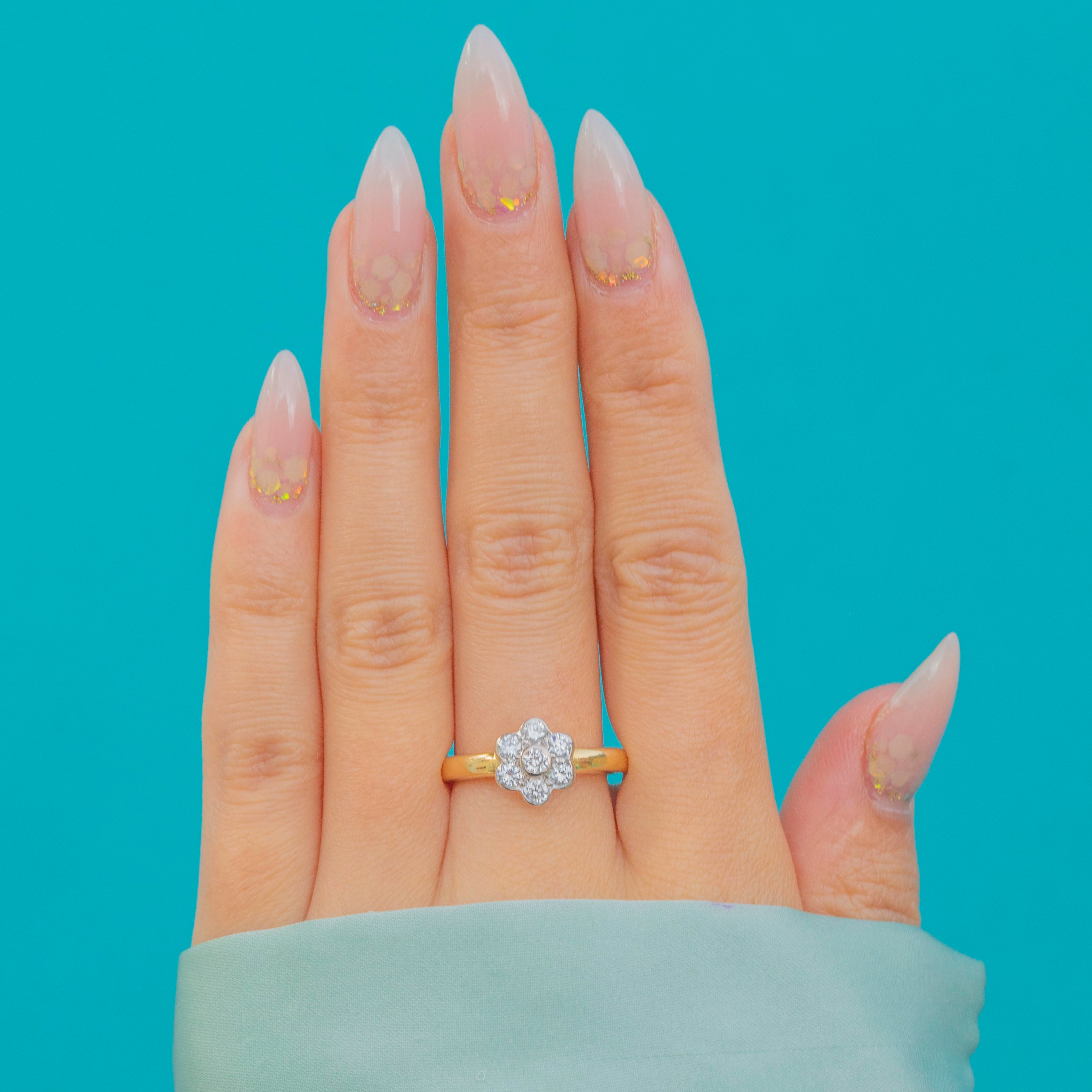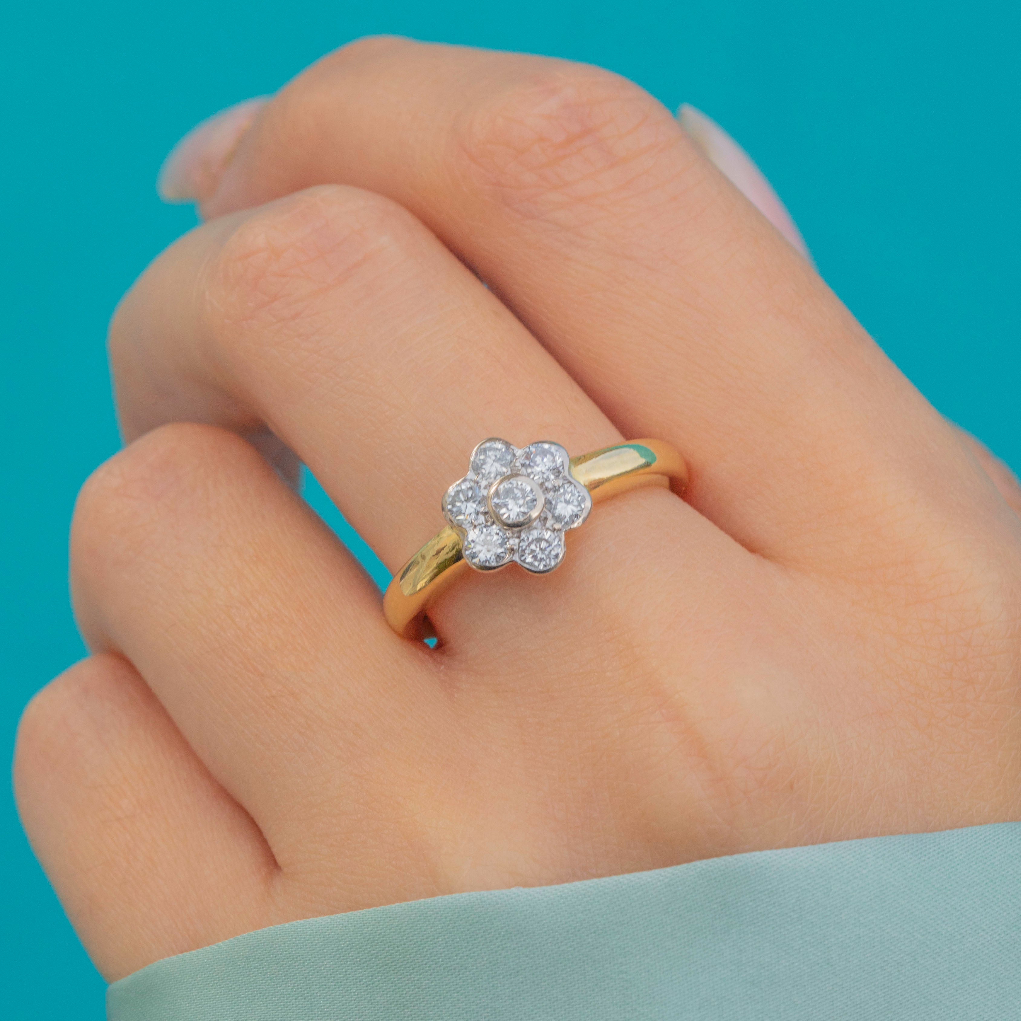Excellent: The Diamonds are bright and well-matched, all secure in their settings. The cluster head is crisp and in great shape, and the 18ct Gold band shows only light signs of wear, retaining good thickness and durability.