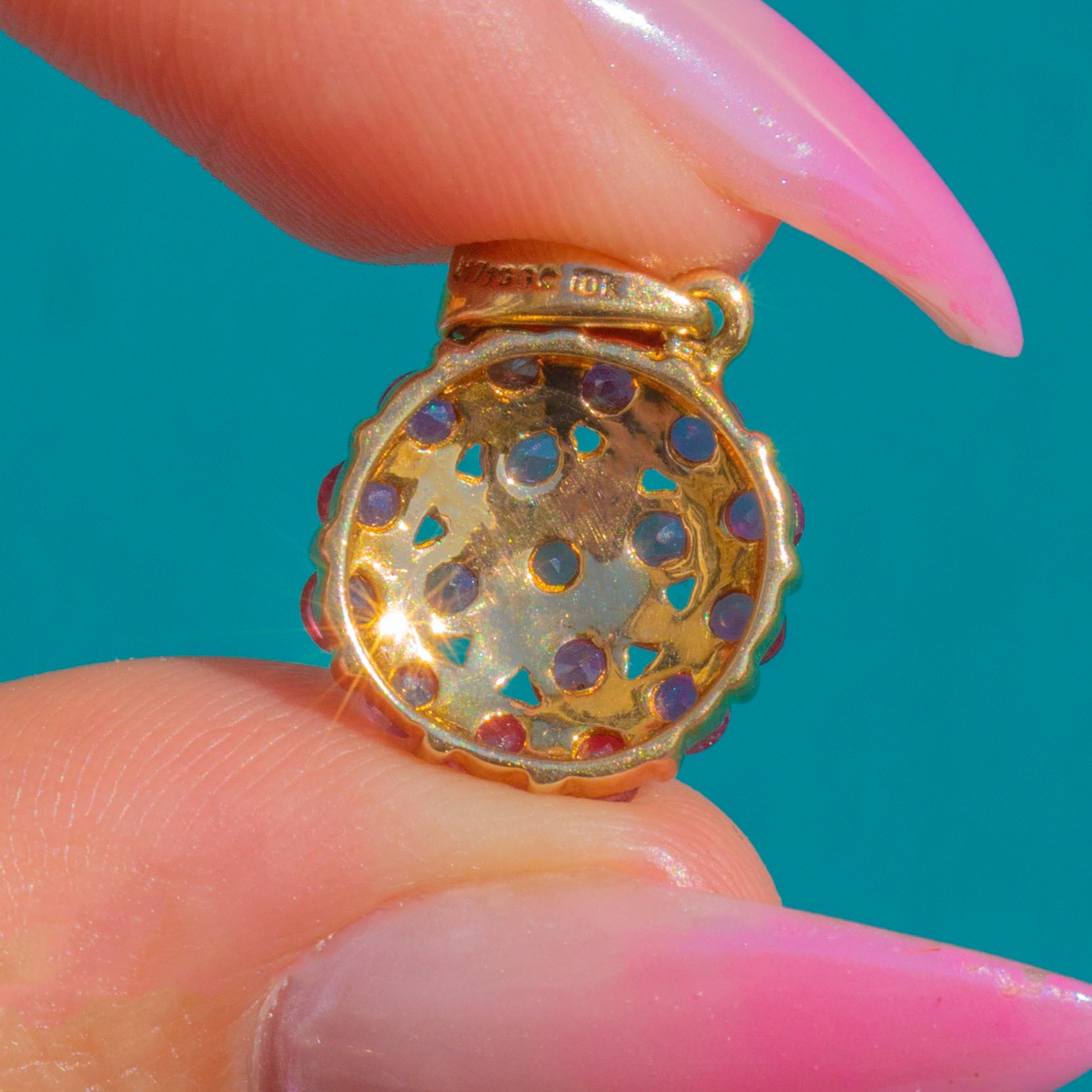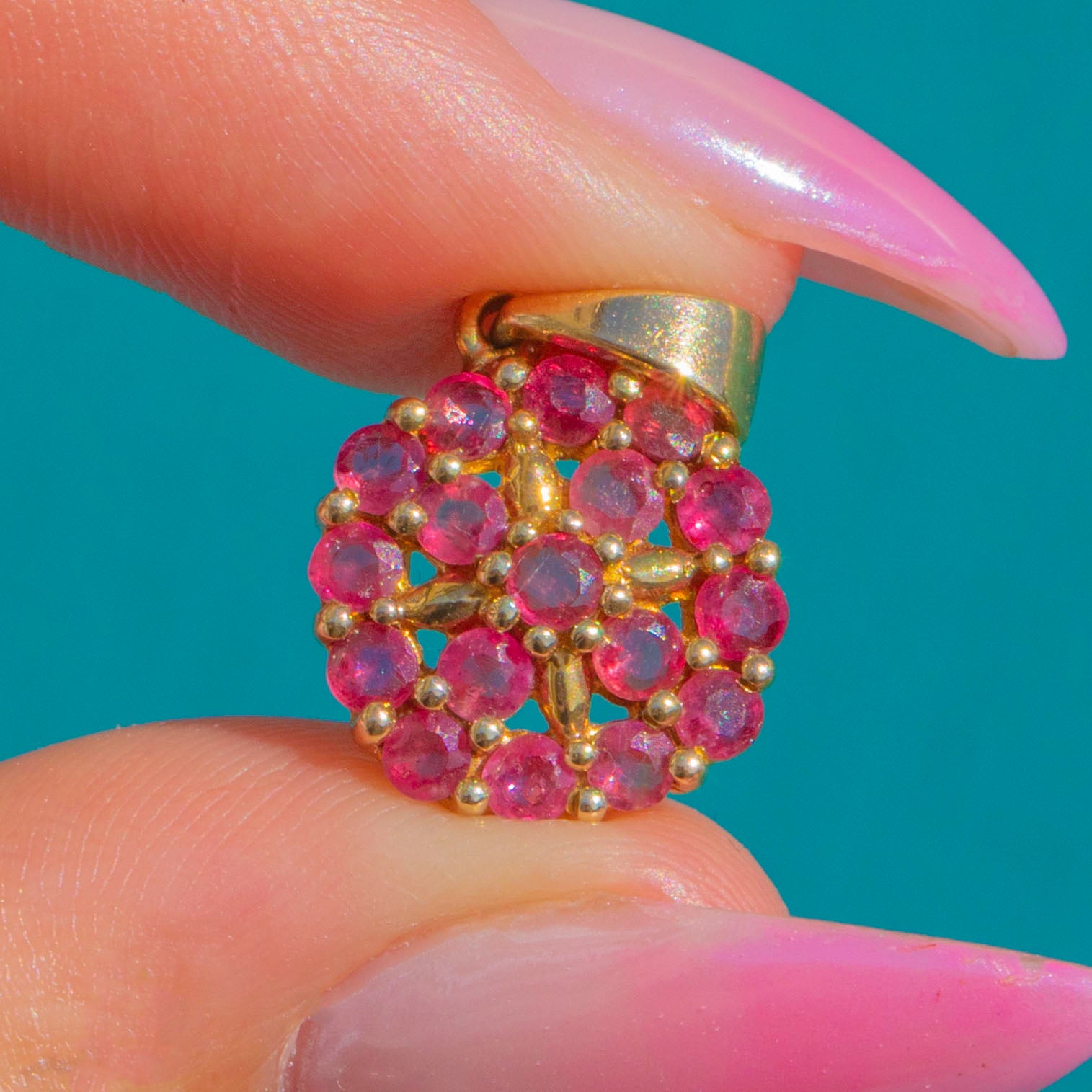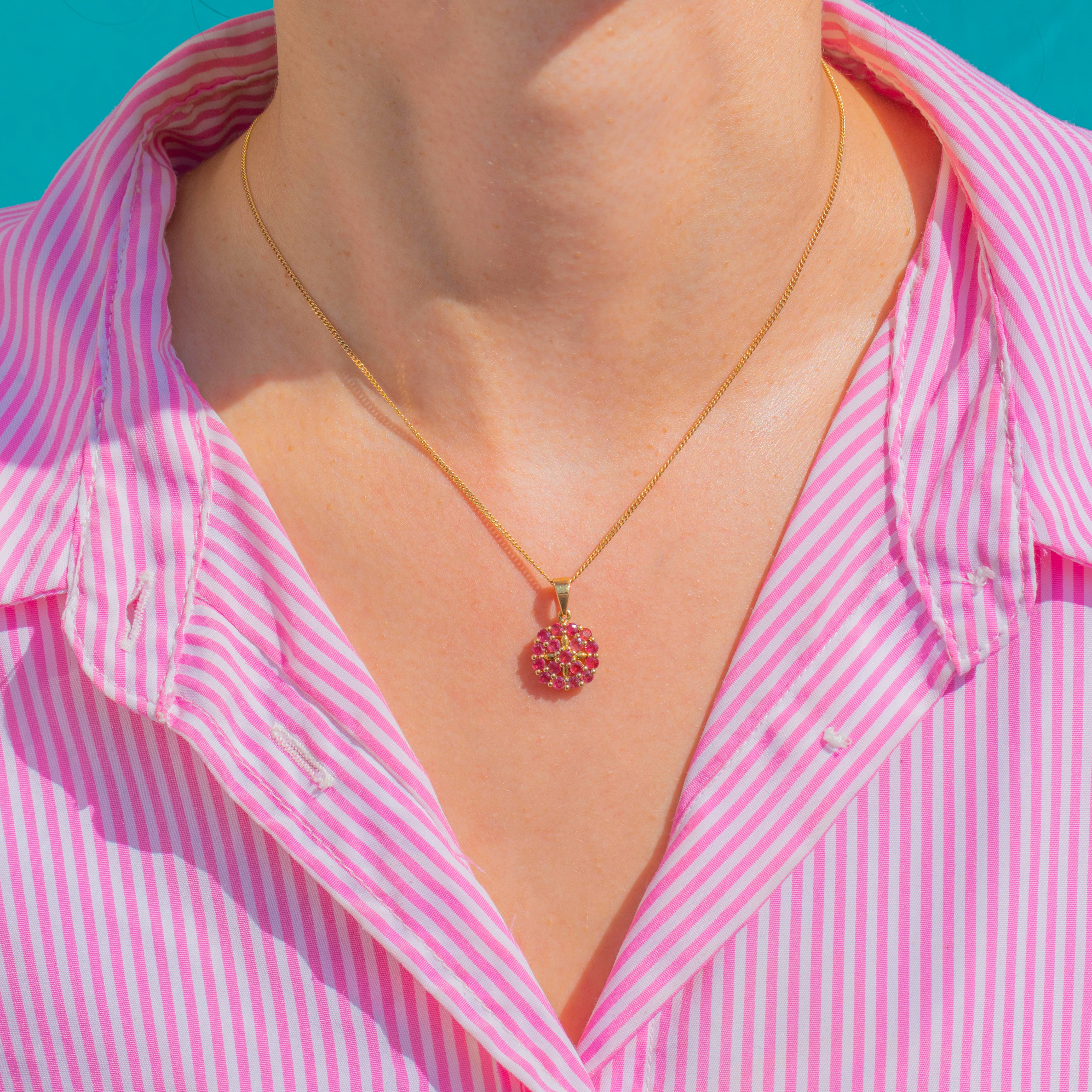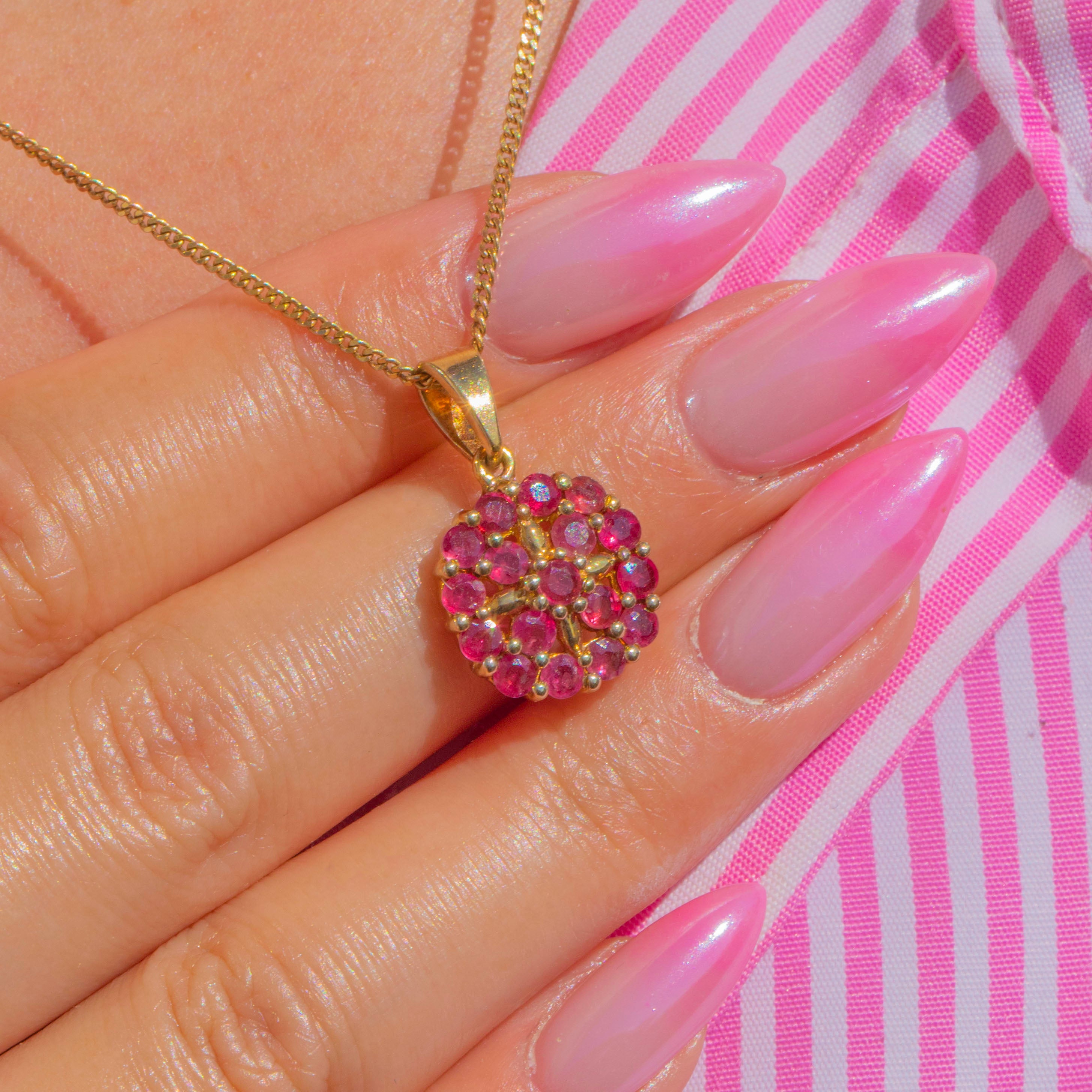 Petite yet radiant, this Vintage flower cluster pendant glows in 10ct Gold, alive with a dense rosette of vivid pink-to-raspberry Synthetic Rubies. The calibrated round stones create a sparkling pavé-style bloom with a softly scalloped edge for a charming, feminine finish.