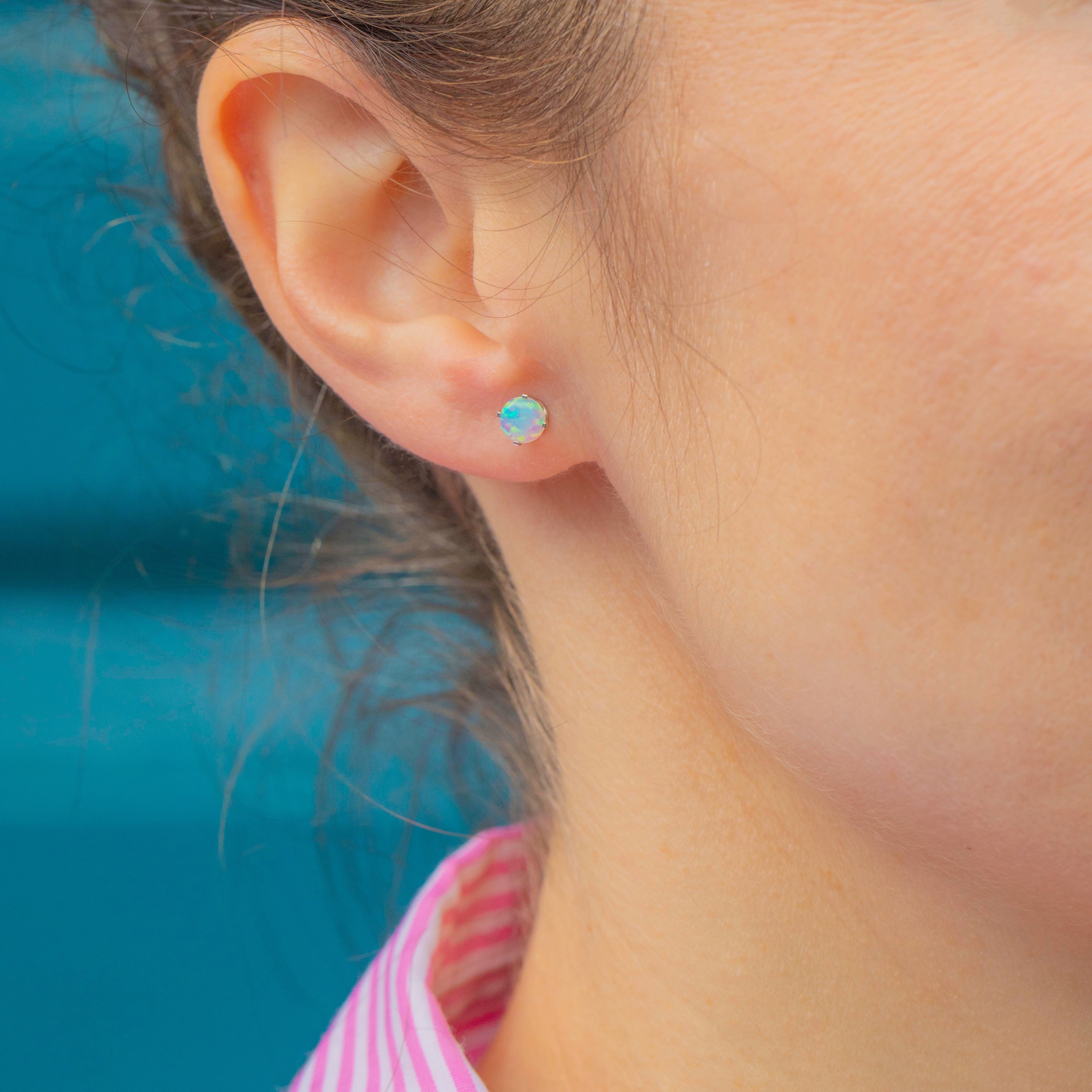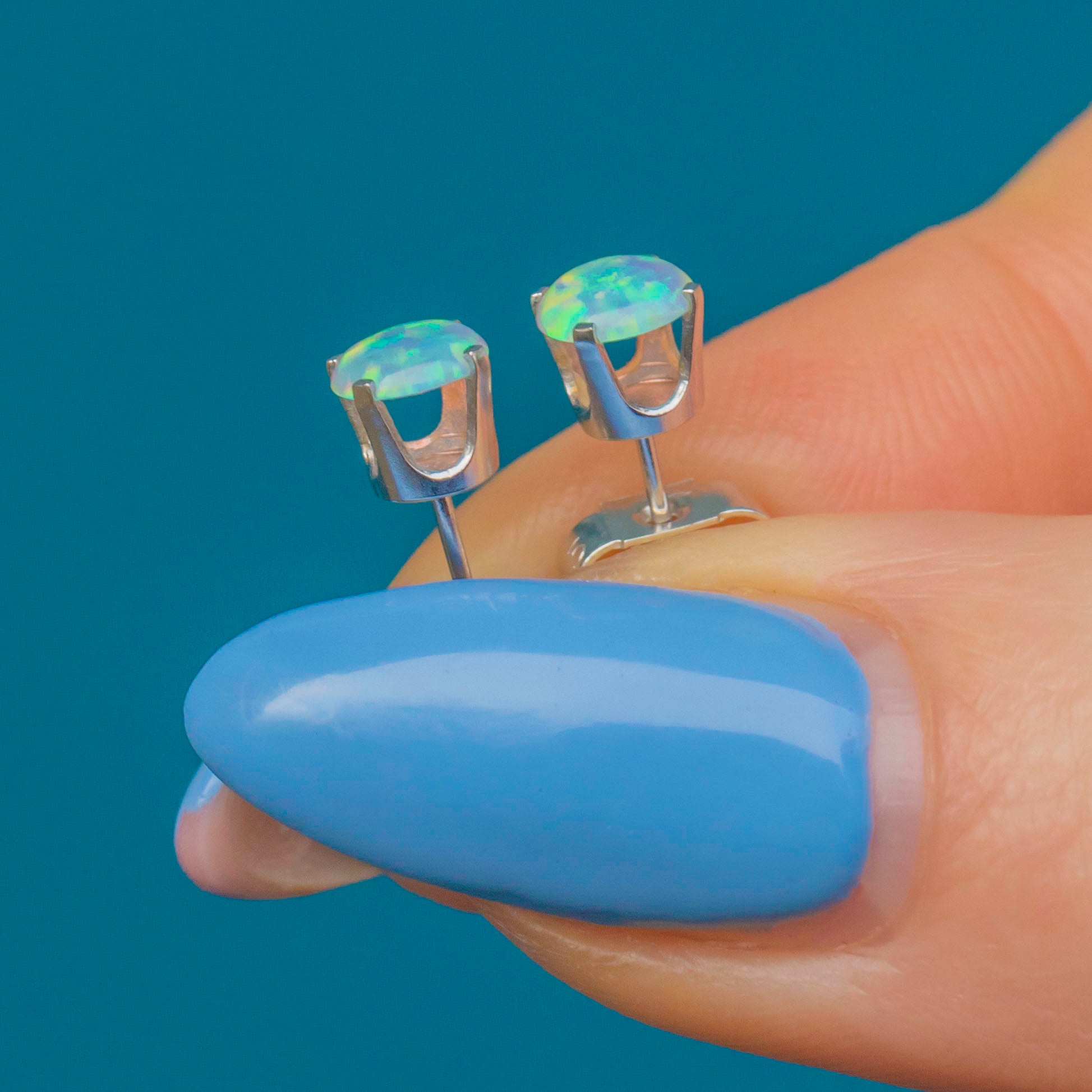 These charming dainty 14ct Gold Opal stud earrings will bring a vibrant pop of colour to your lobes! Crafted from 14ct White Gold, each earring showcases a single vivid Opal set securely in delicate claw settings. The Opals exhibit a vivid play of colour, bound to enchant anyone who lays eyes on them.