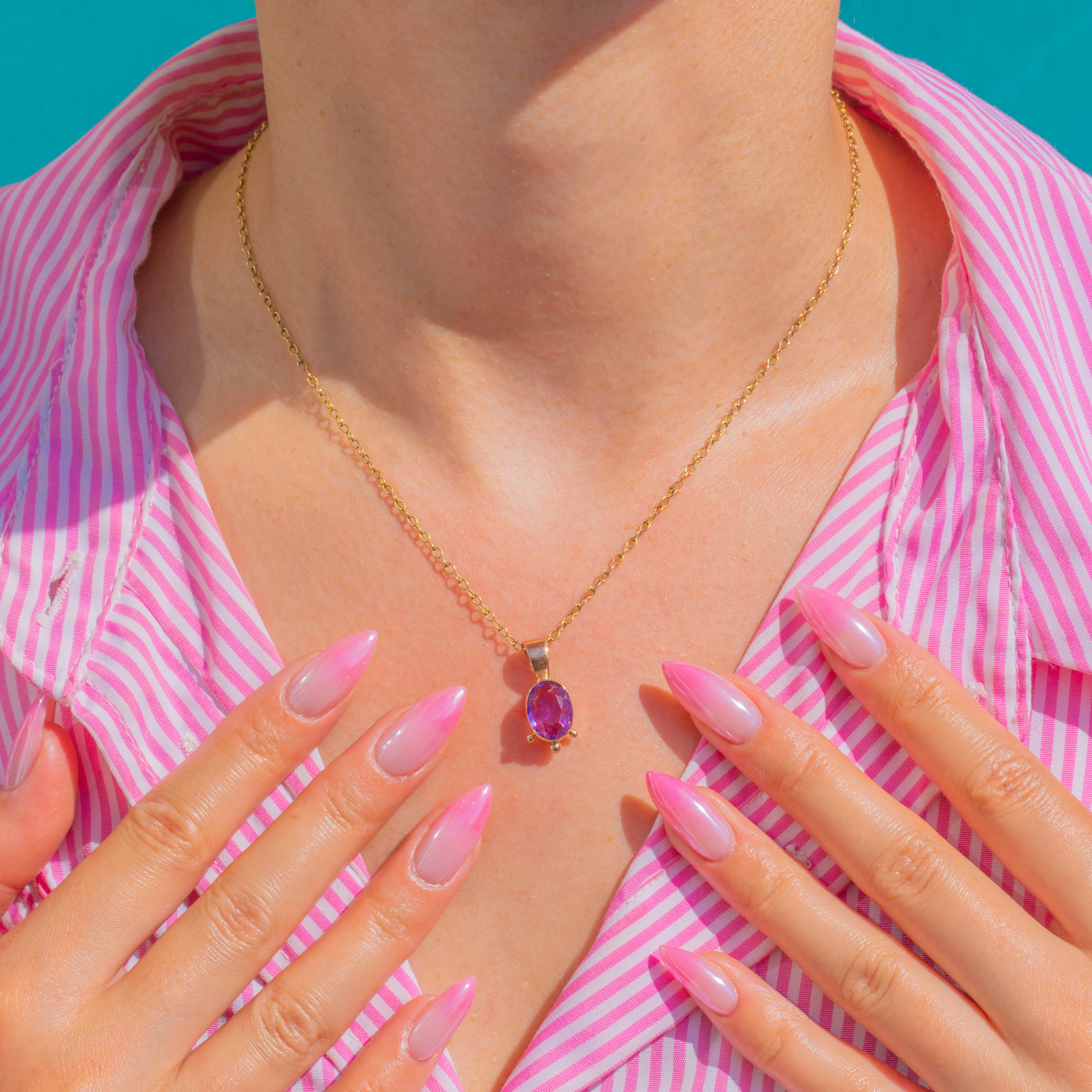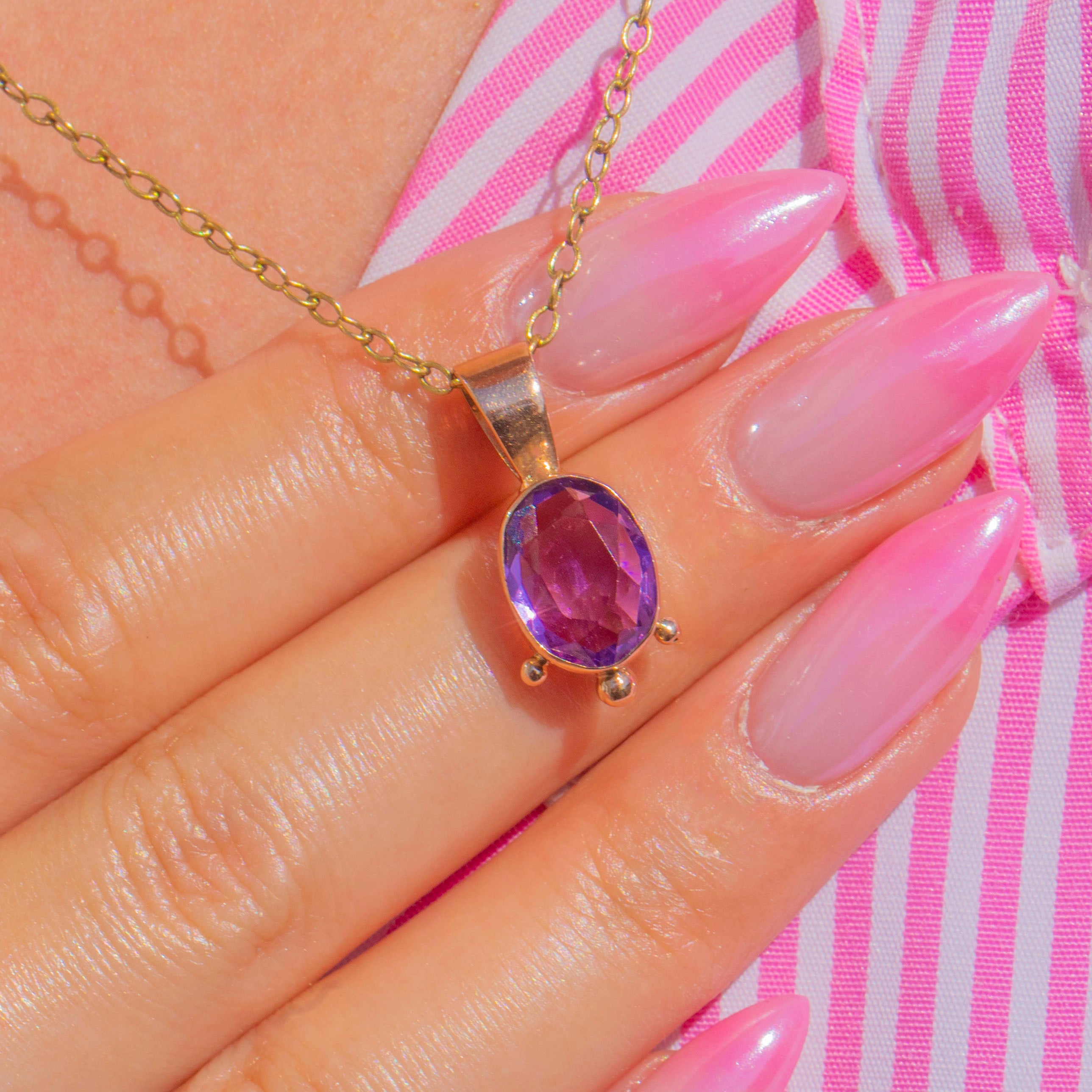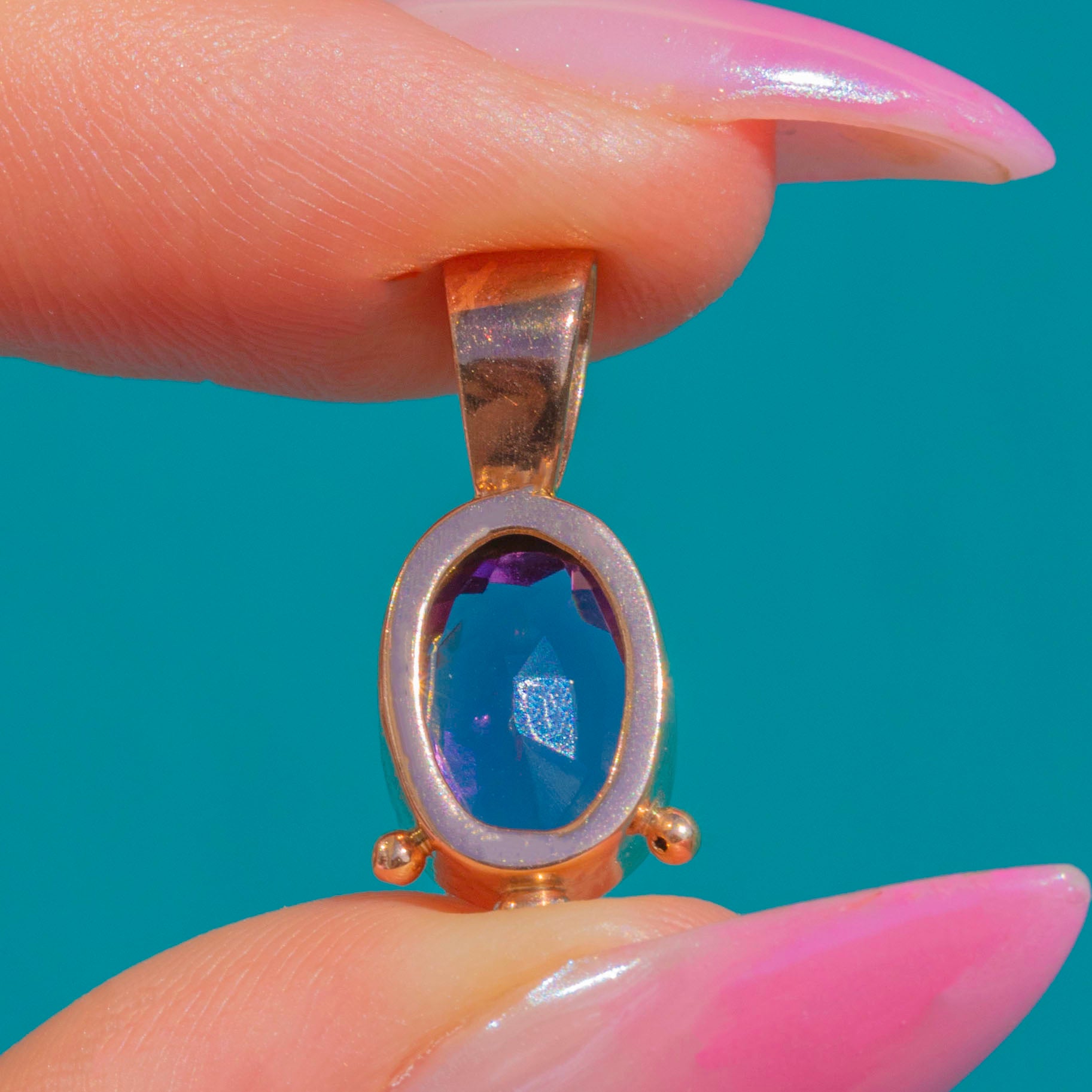 A dainty Victorian treasure, this 9ct Gold Amethyst charm captures the romance of the era in a petite, wearable silhouette. The oval Amethyst glows a sumptuous purple, dancing with lively pink-blue flashes as it catches the light.