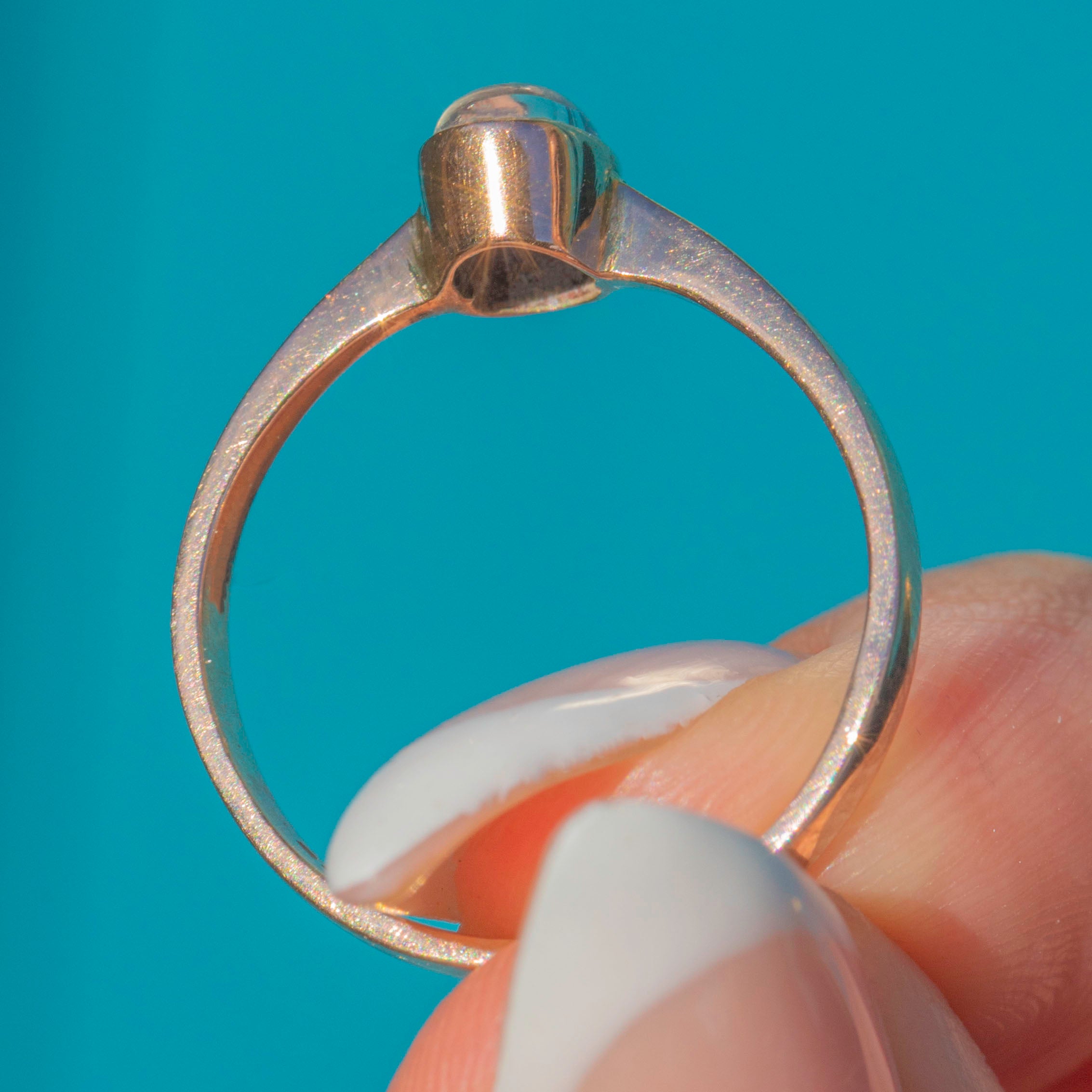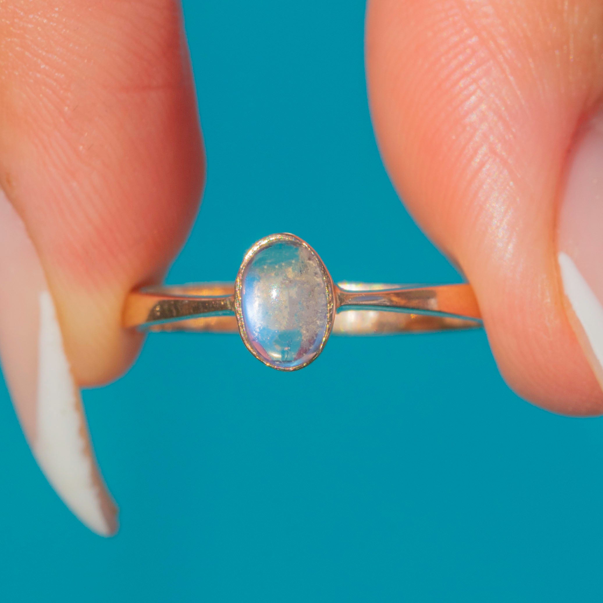 This dainty 9ct Gold ring features a glowing oval Moonstone cabochon, bezel-set to highlight its soft adularescence.