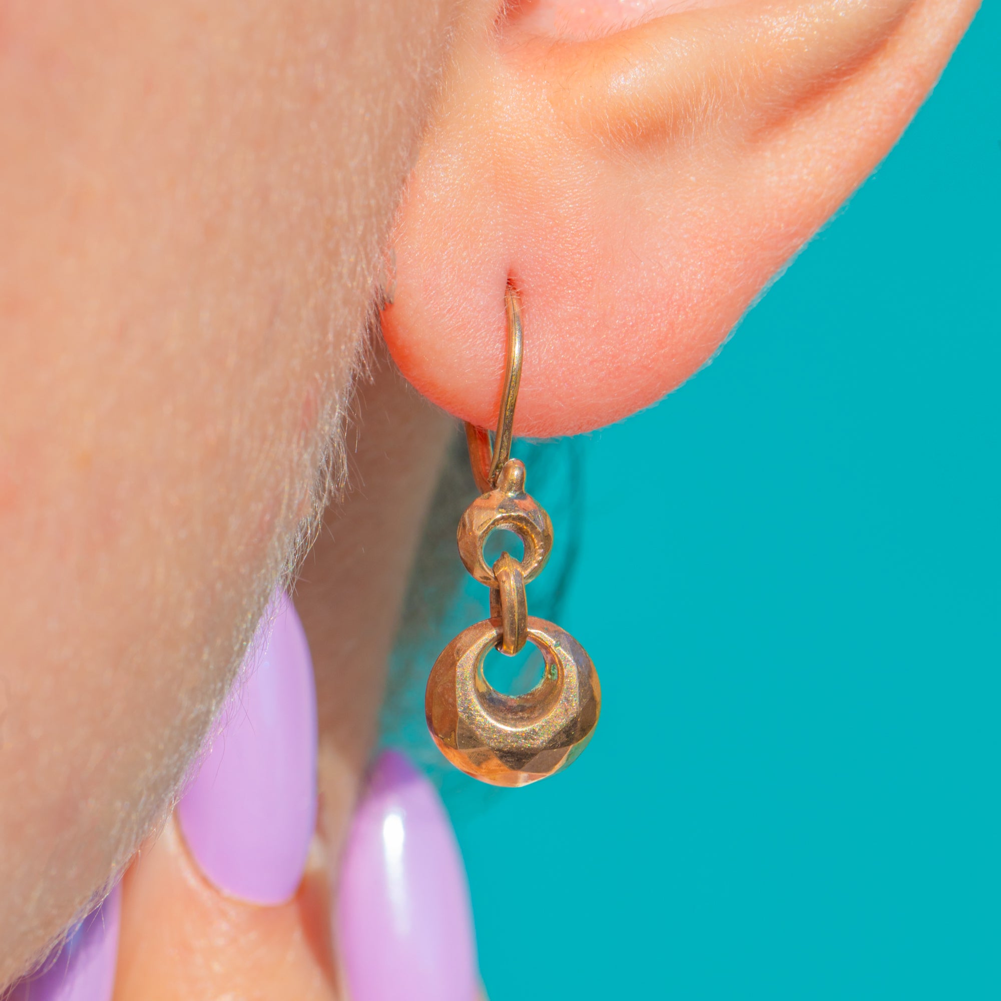 Dainty and deliciously refined, these Victorian 9ct Gold drop earrings marry minimalist geometry with antique charm. The slender French hooks lead to a petite faceted ring, finishing in a gleaming faceted rondelle that dances with every movement.