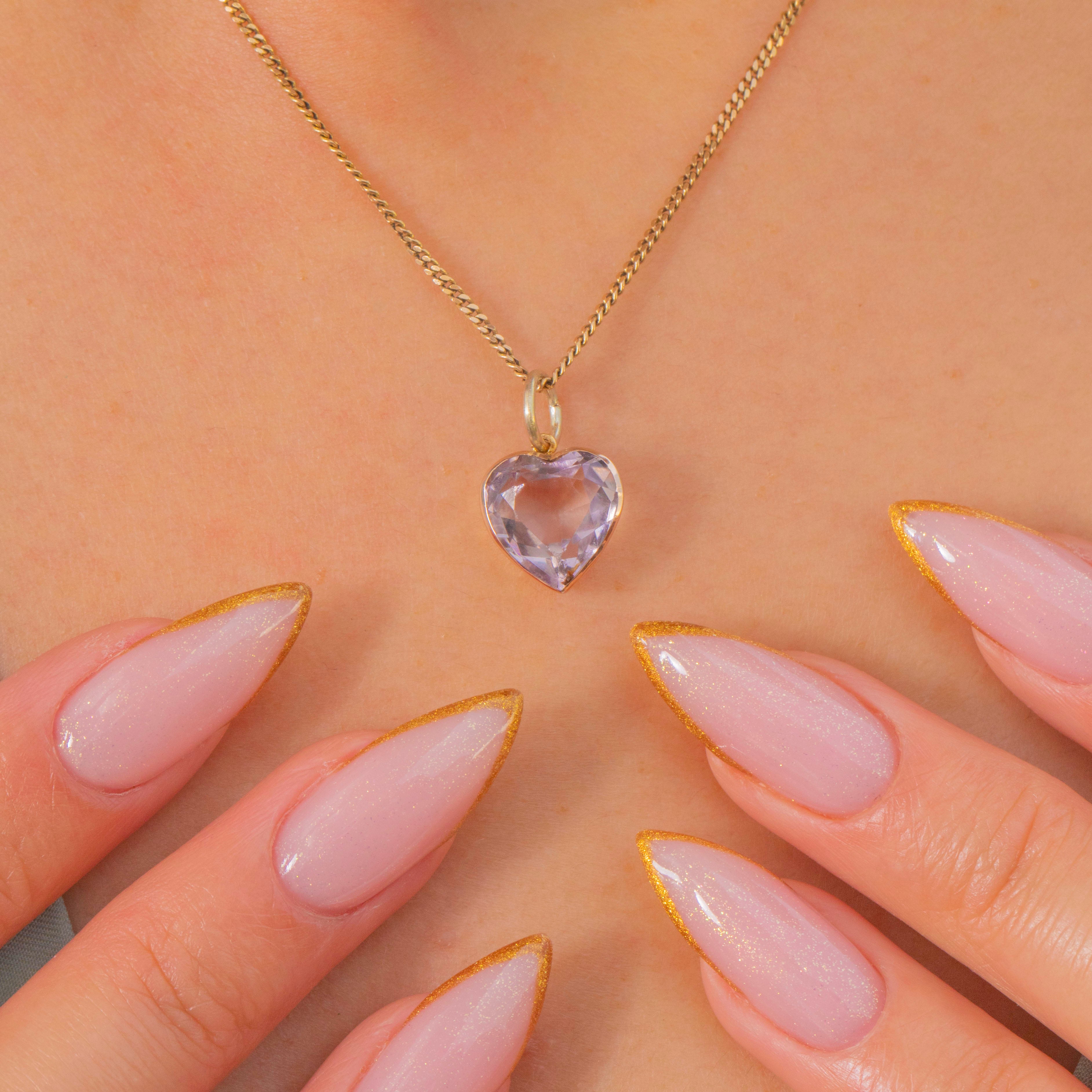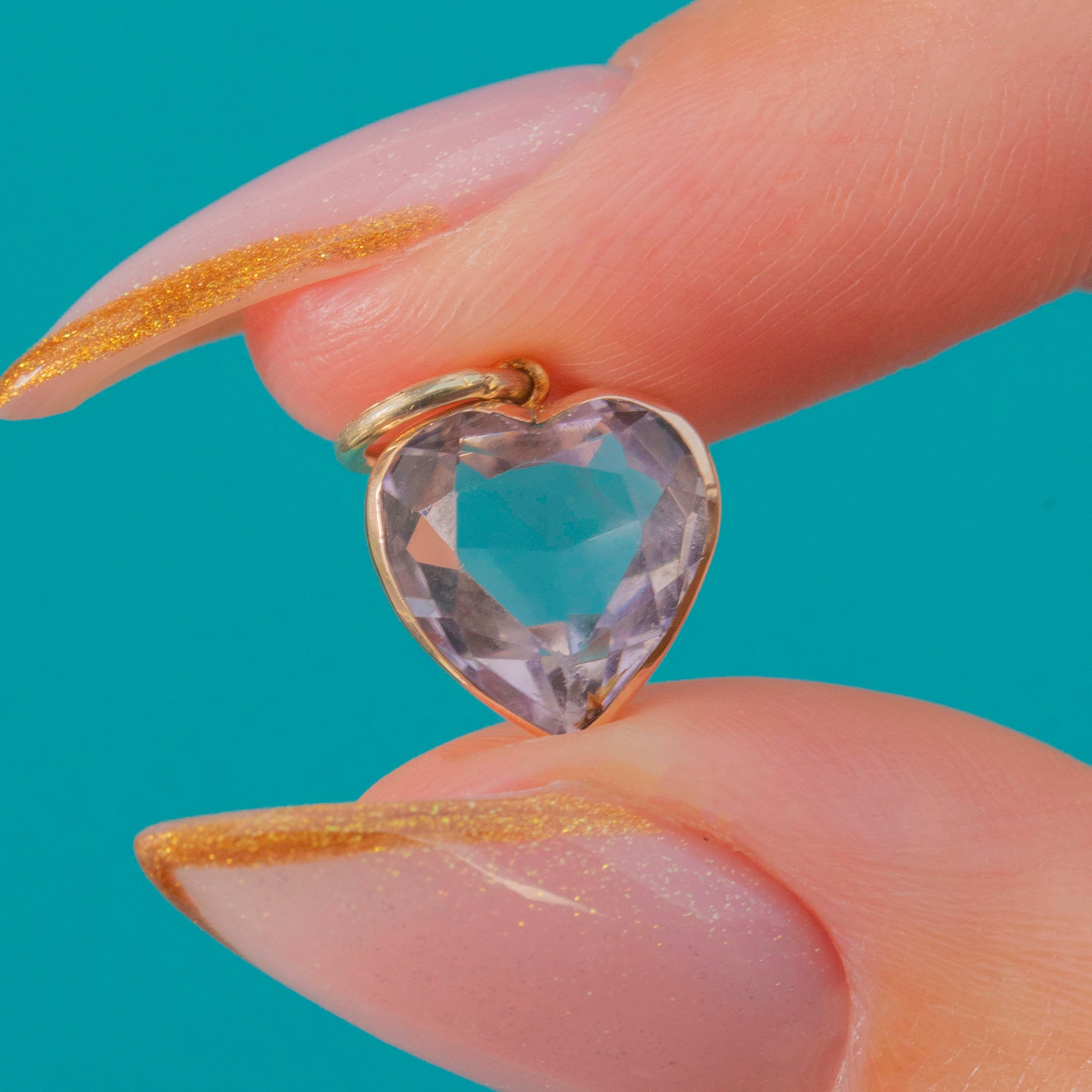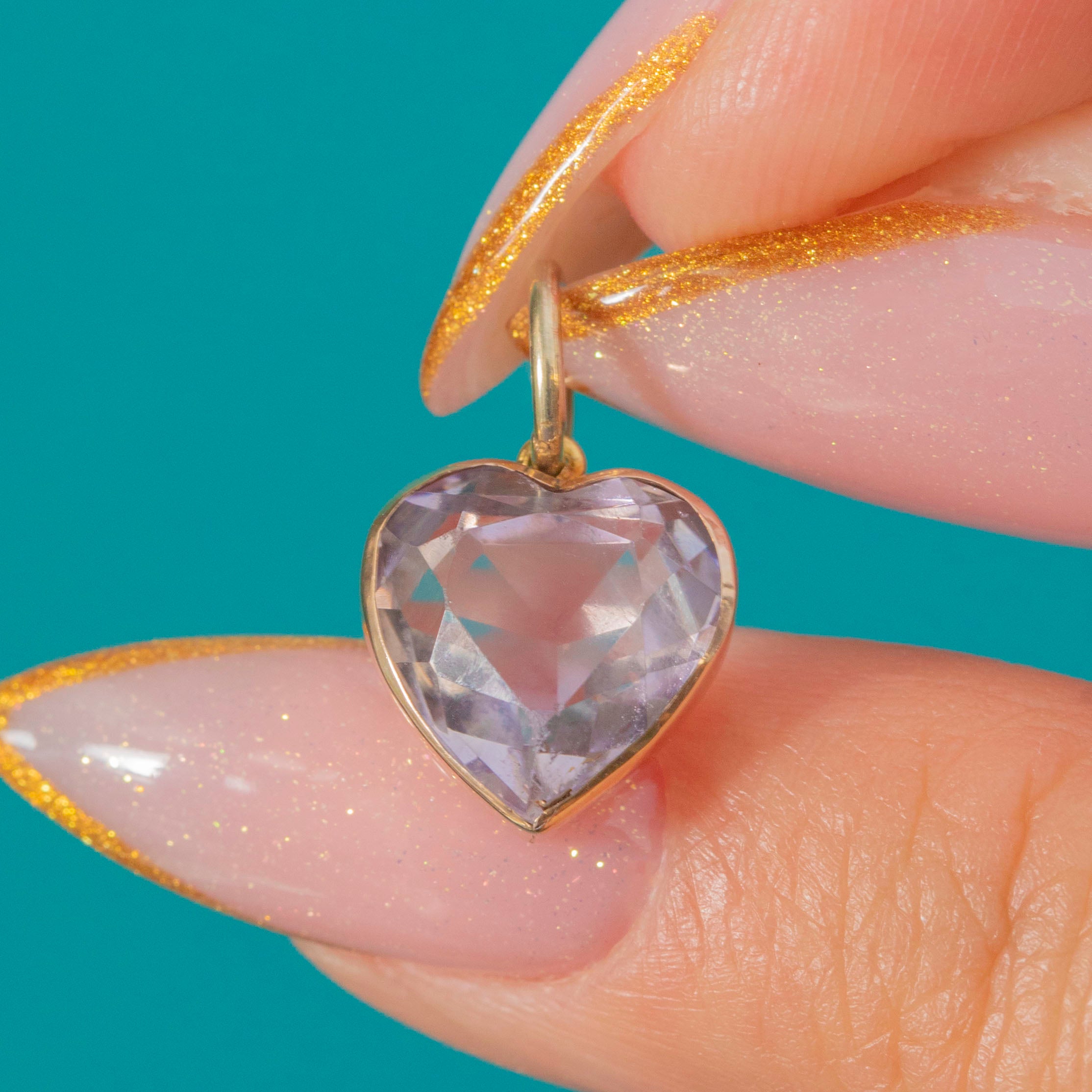A sweet antique heart charm set with a delicate lilac-pink Amethyst, with crisp facets that catch the light beautifully. The gem displays a lovely glow with a natural internal inclusion that adds depth and character — a hallmark of genuine antique stones. Estimated at approximately 1.00ct, it’s a sweet and romantic keepsake, perfect for layering or gifting.