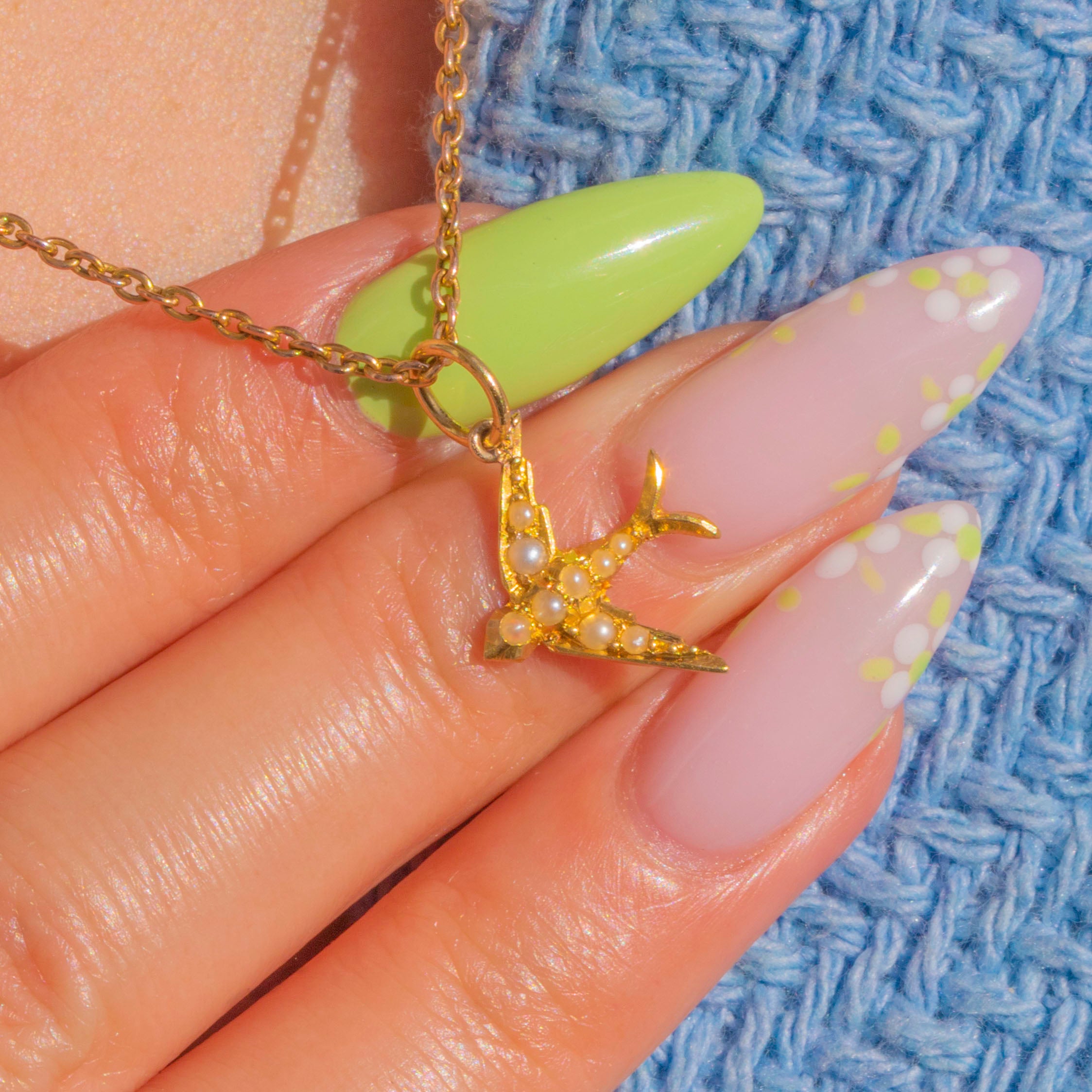 Dainty and irresistibly charming, this Antique 18ct Gold swallow glides with a shimmer of tiny seed Pearls across its wings and body. The warm glow of high-carat Gold pairs beautifully with the soft lustre of the Pearls, creating a delicate, romantic silhouette.