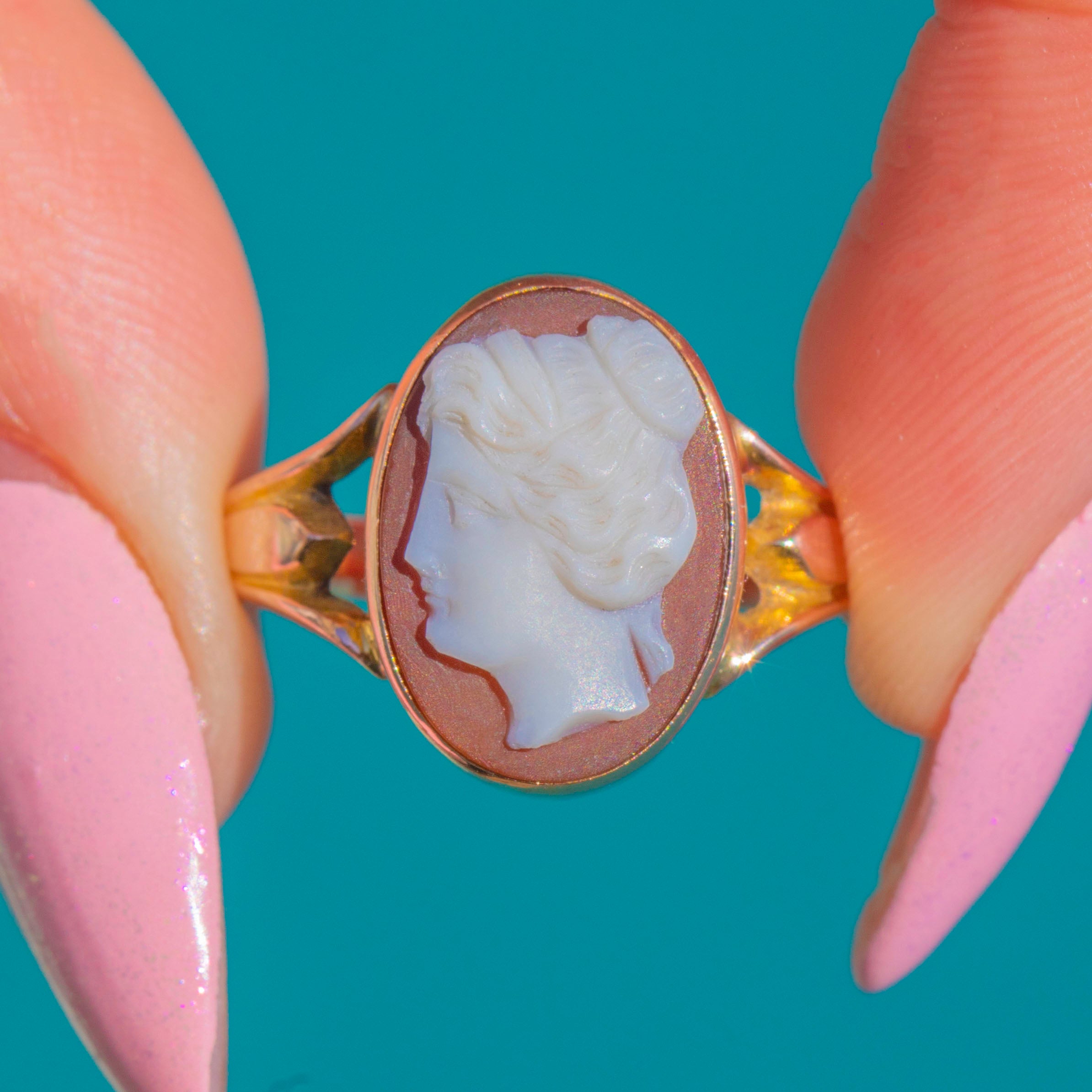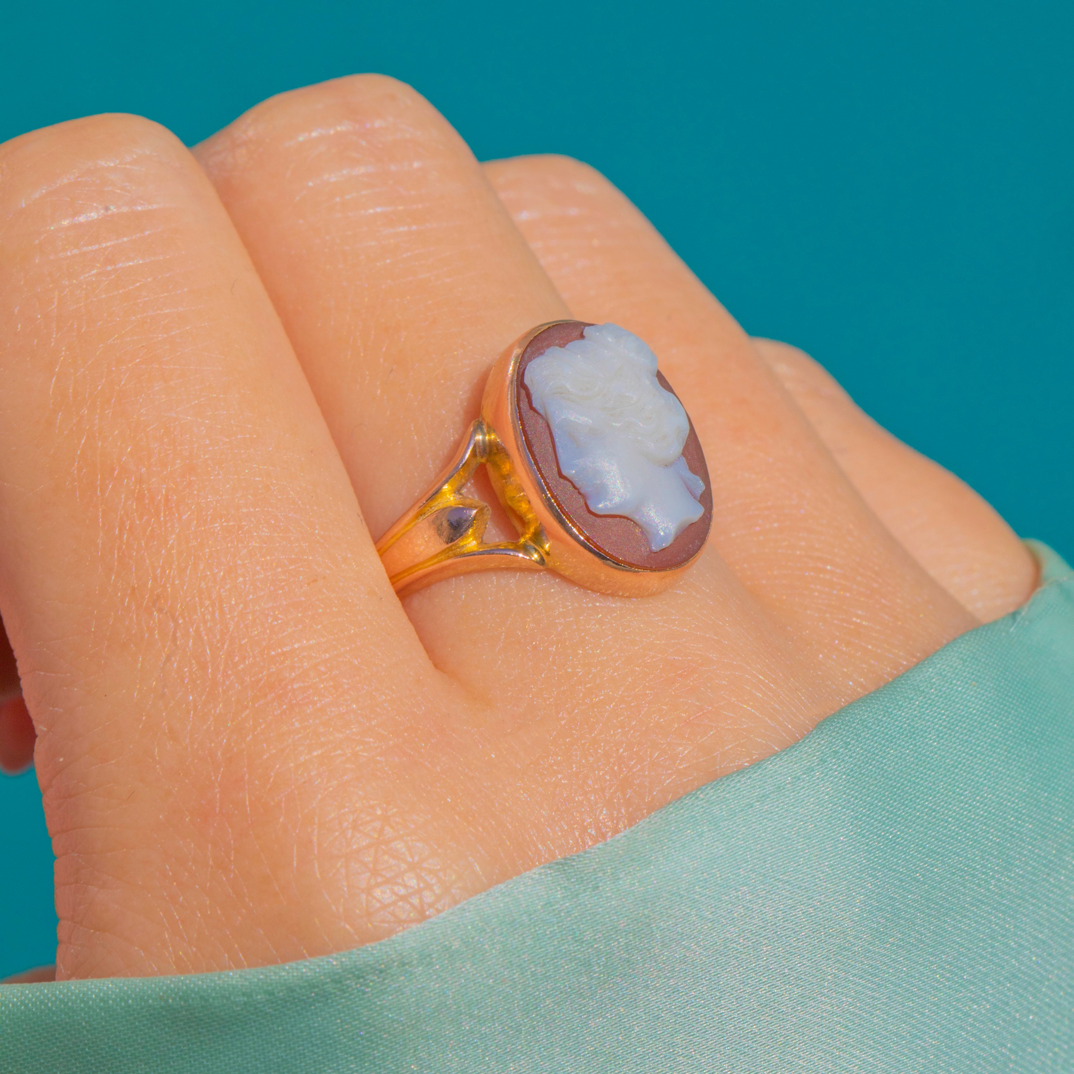 A charming Early 20th Century Sardonyx Agate cameo ring, crafted in warm 9ct Gold. The crisp white profile is carved in high relief over a rich tan-brown ground, framed by a slender closed collet and graceful pierced, split shoulders for a refined, feminine silhouette.