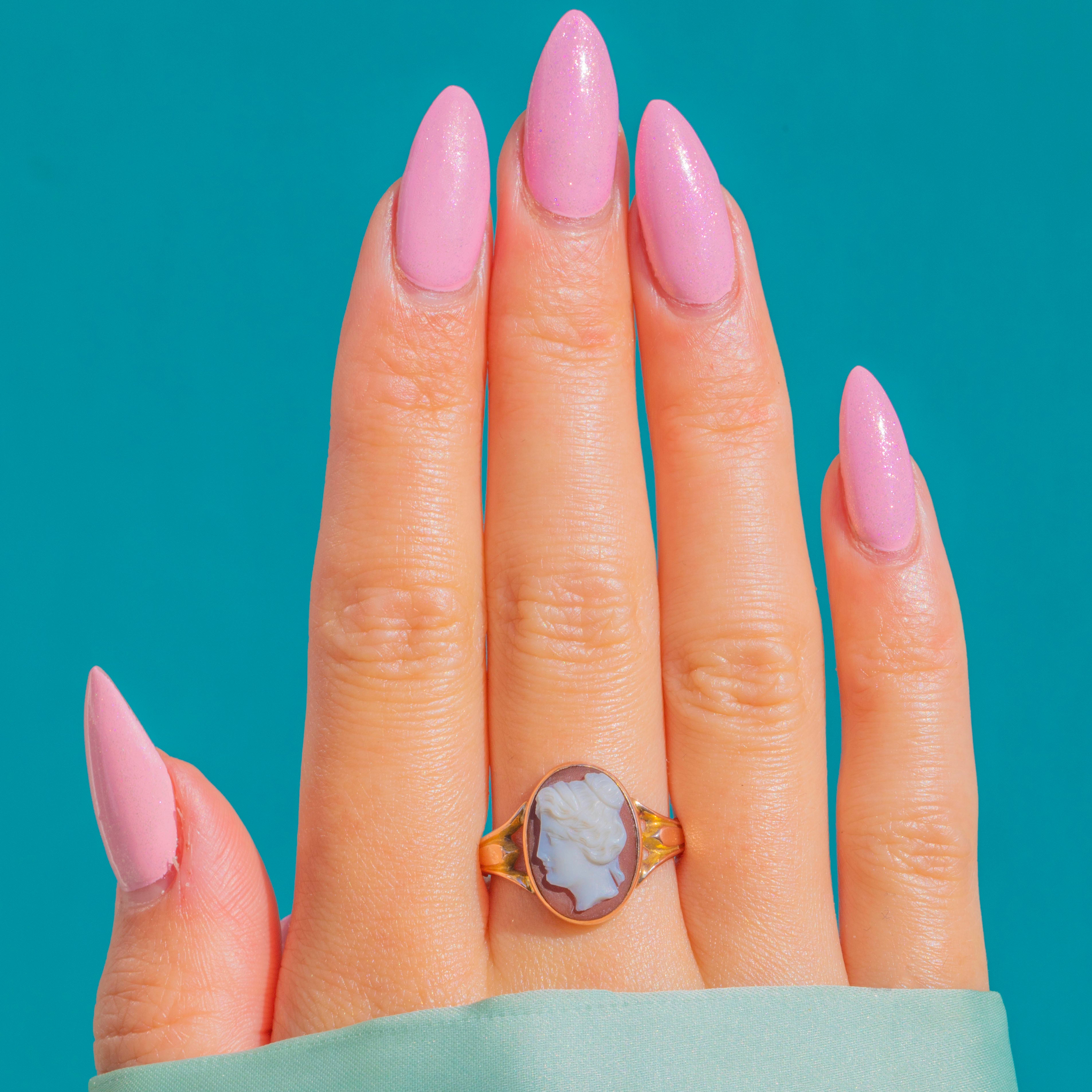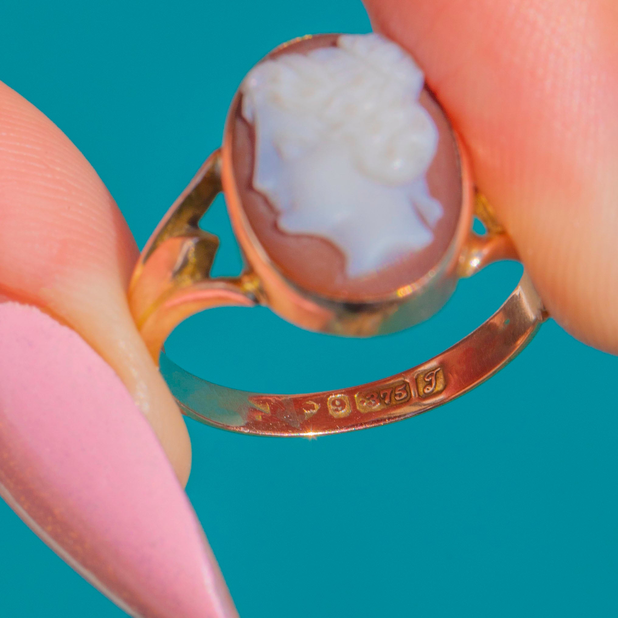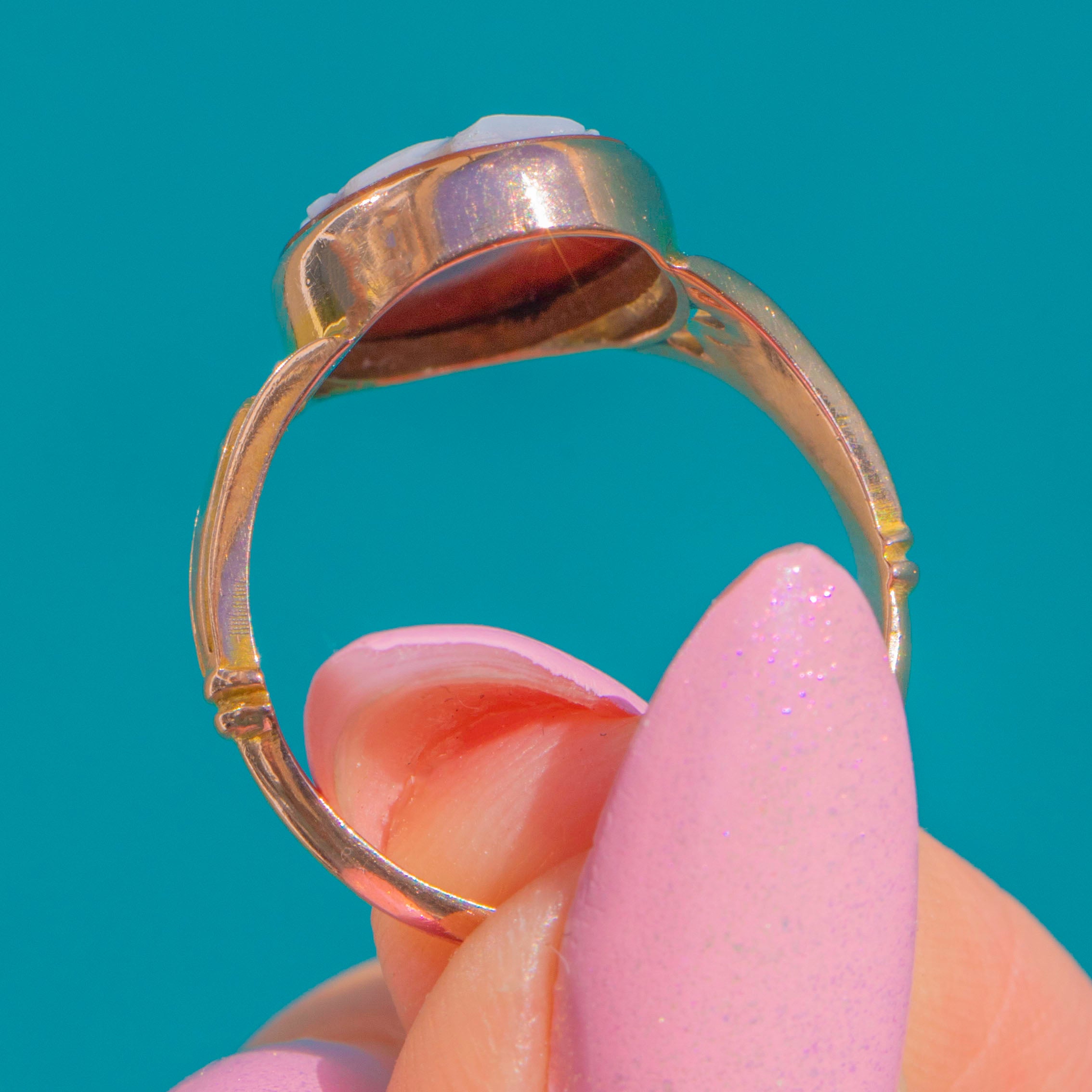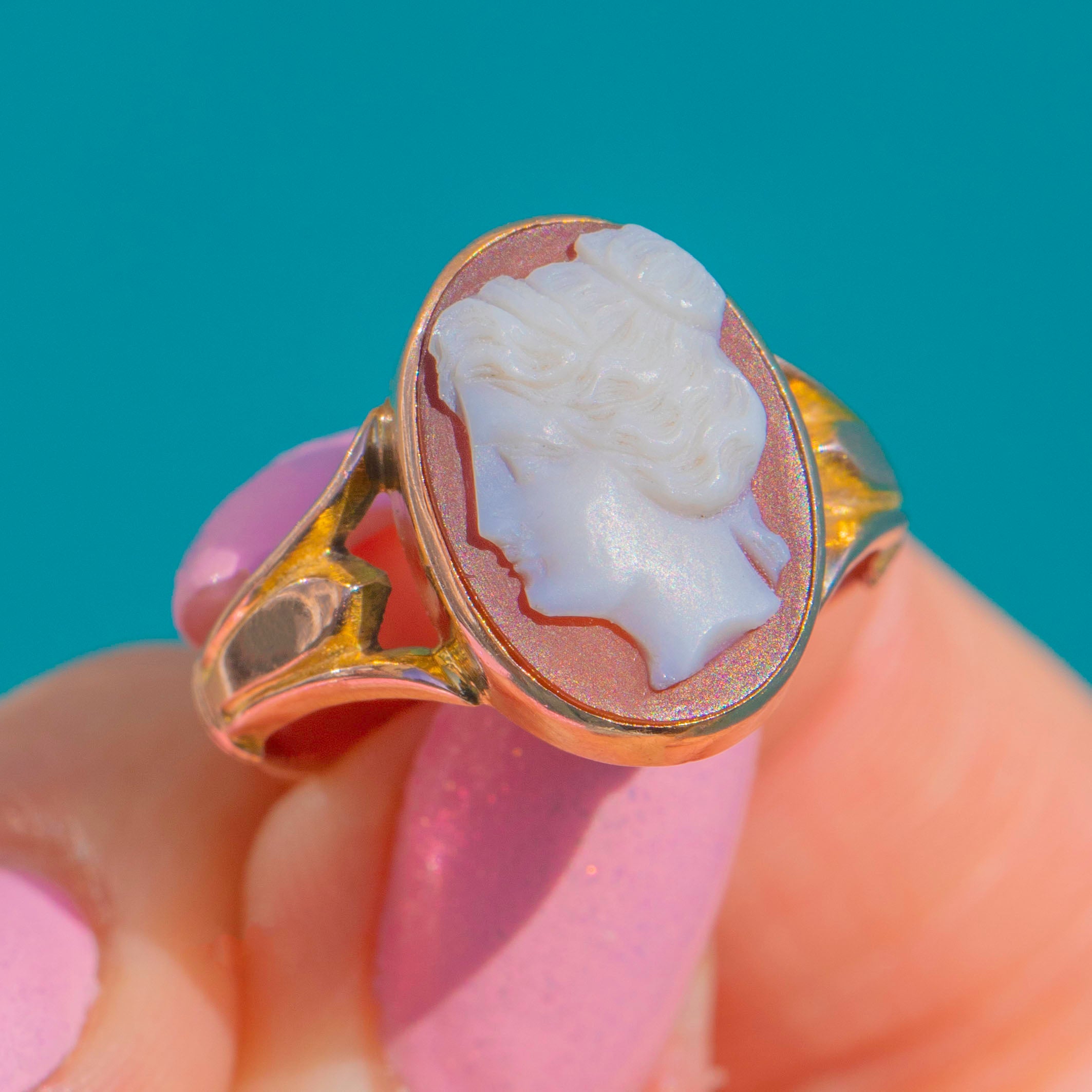Elegant and wearable, this 1919-dated jewel blends classical Neoclassical artistry with a delicate Gold setting. The cameo’s carving displays lovely definition and texture, offering a timeless accent whether worn solo or in a curated ring stack.