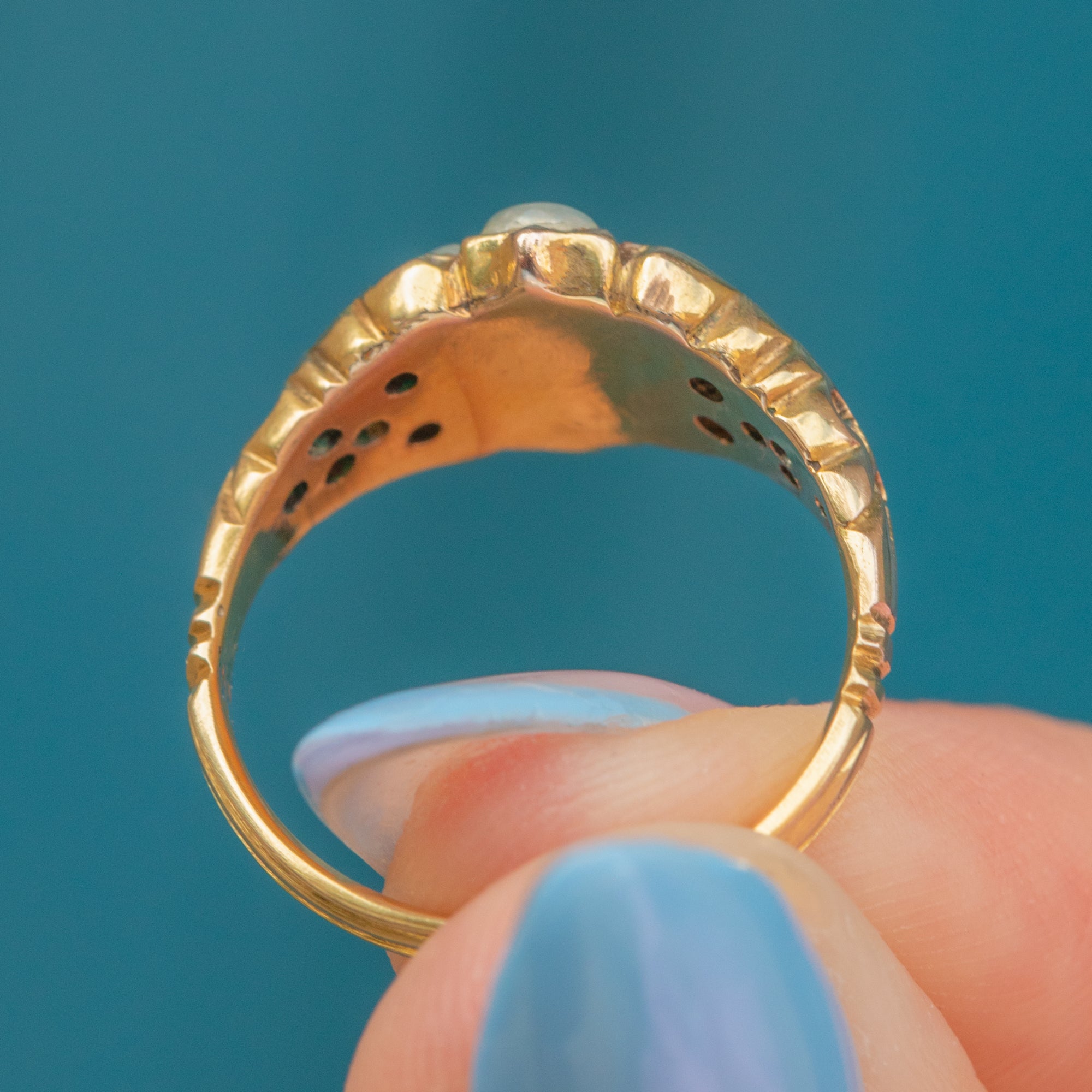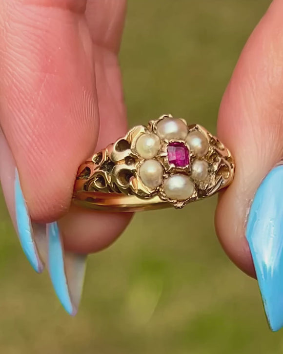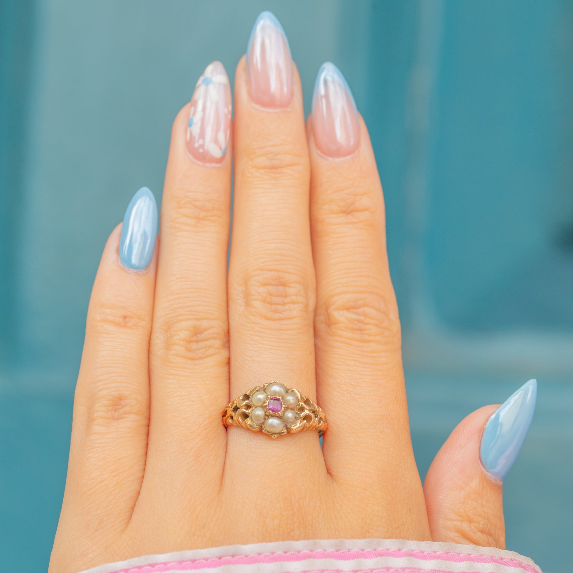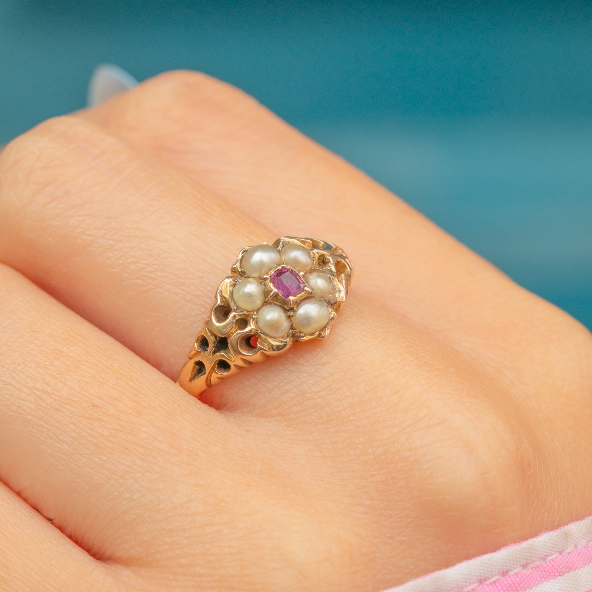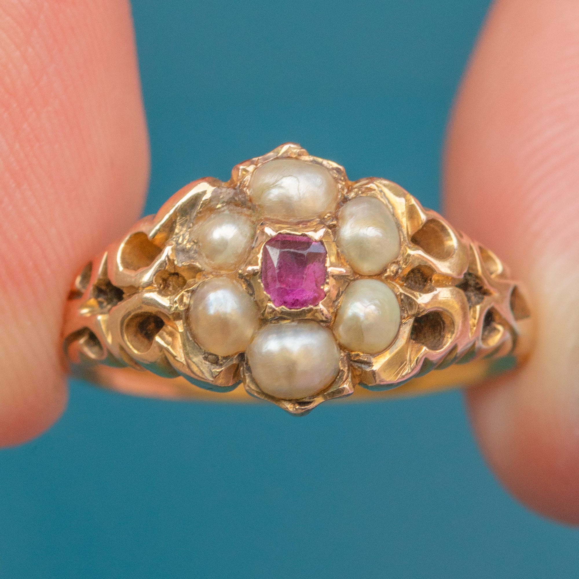 Exquisitely crafted from buttery 14ct Gold circa 1840, this early Victorian ring boasts a deep fuchsia Ruby haloed by iridescent Pearls, combining to create a gorgeous flower cluster to adorn your hand!