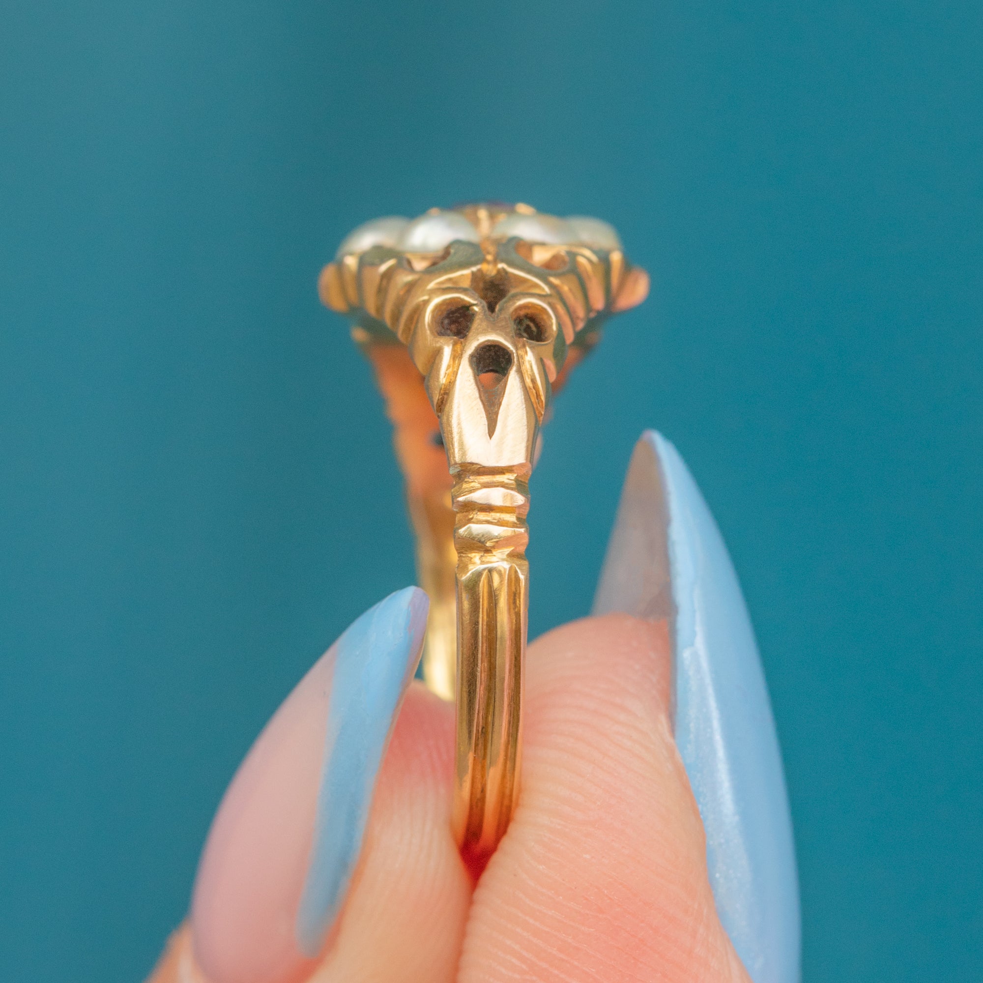 Early Victorian 14ct Gold Ruby Pearl Flower Cluster Ring