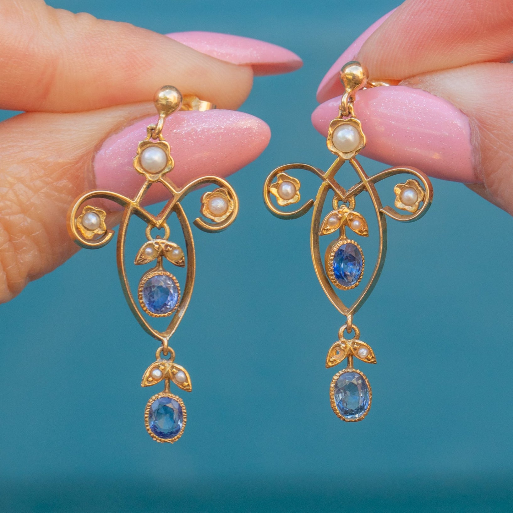 Classically Edwardian in design, each earring is a symphony of delicate features, boasting royal blue Sapphires and lustrous creamy Pearls. With their heirloom quality and classic allure, these antique earrings will become cherished treasures for generations to come!
