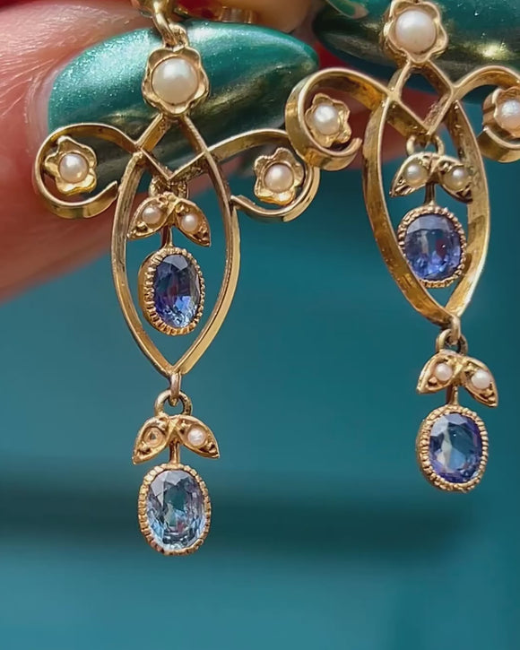 These Edwardian 18ct Gold Sapphire Pearl drop earrings will add a touch of regal sophistication to your outfit!