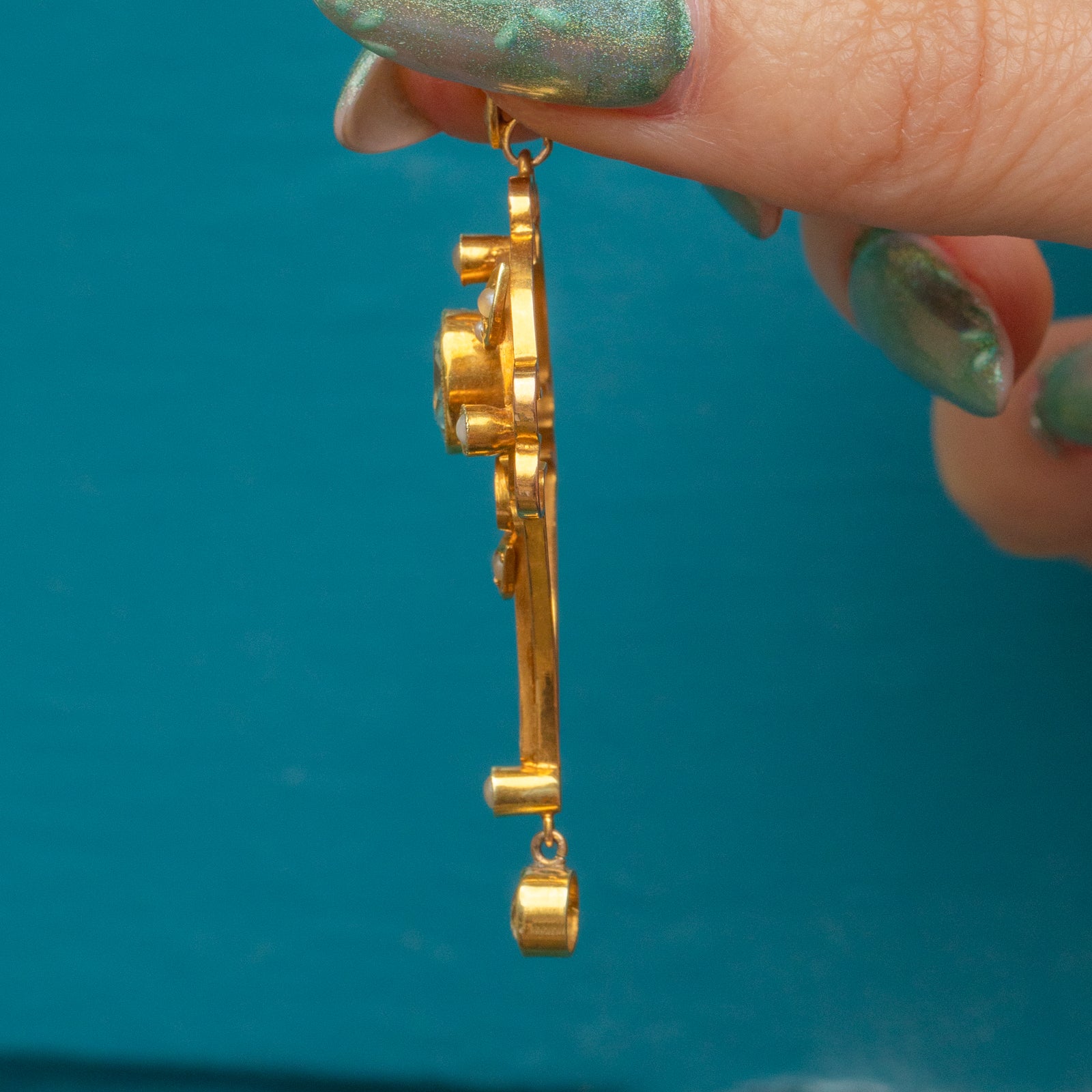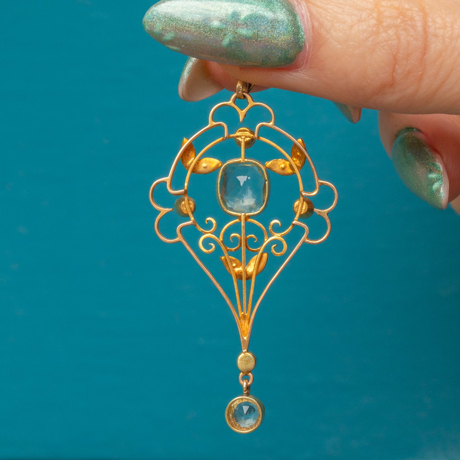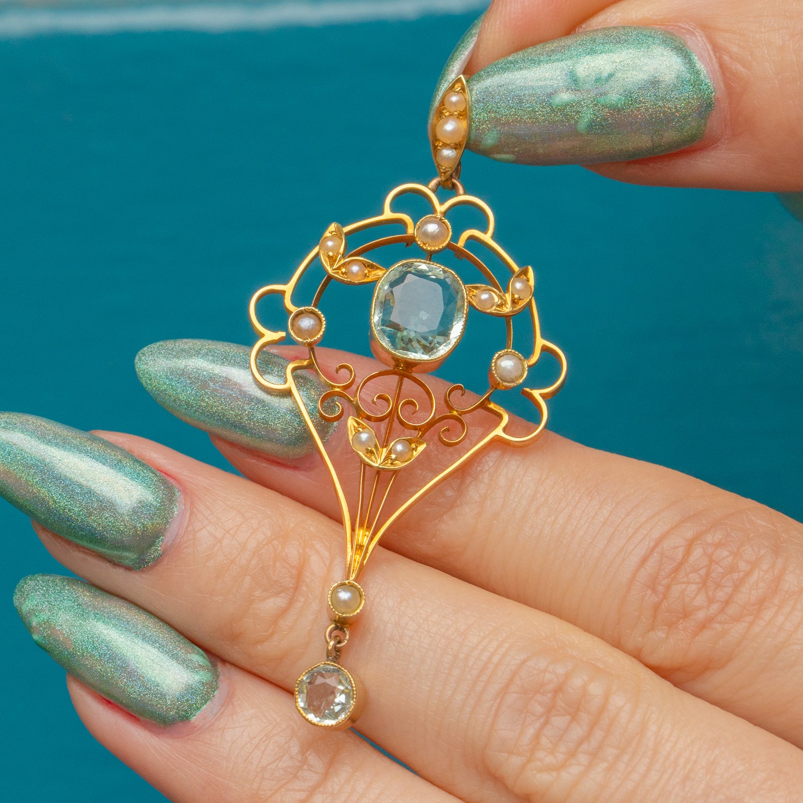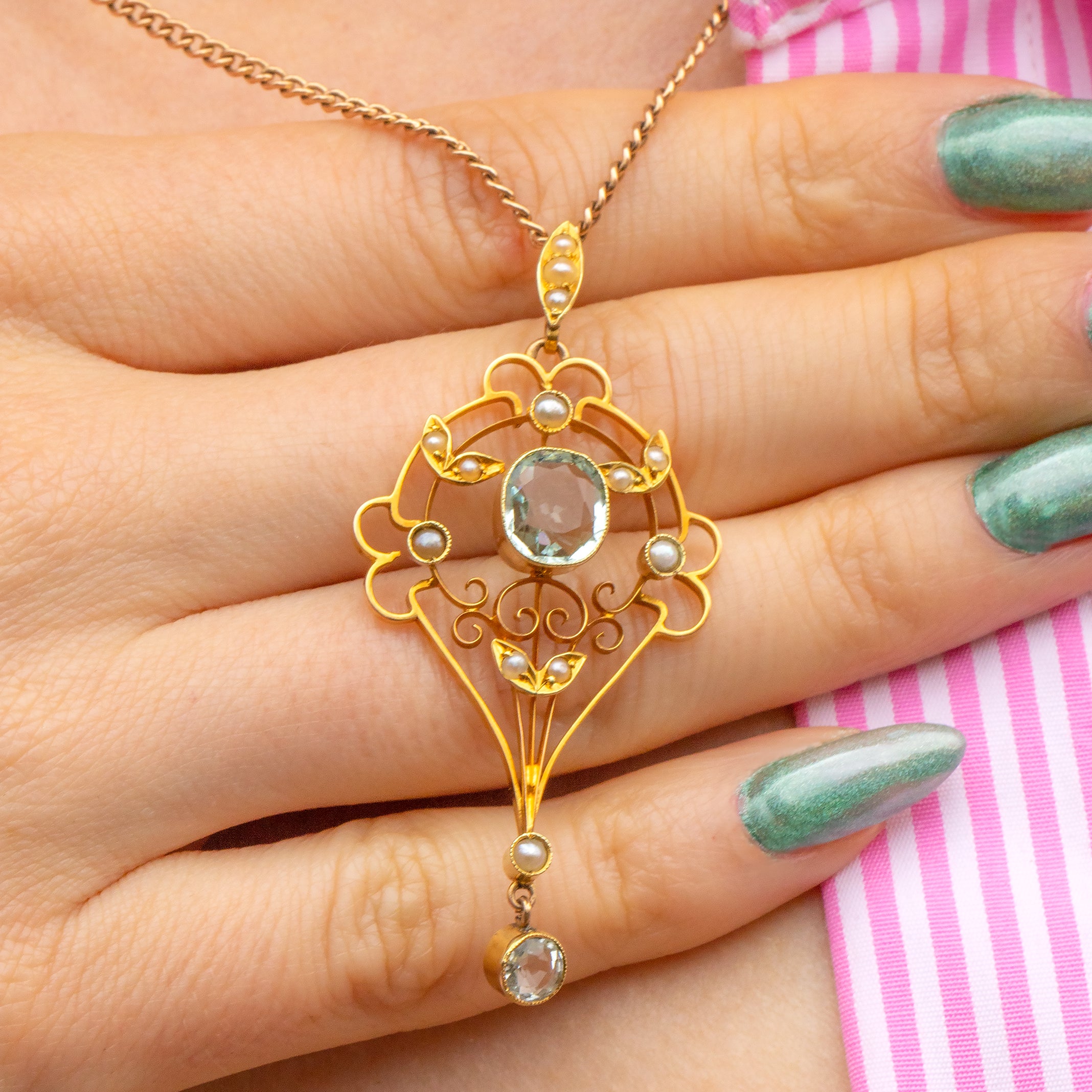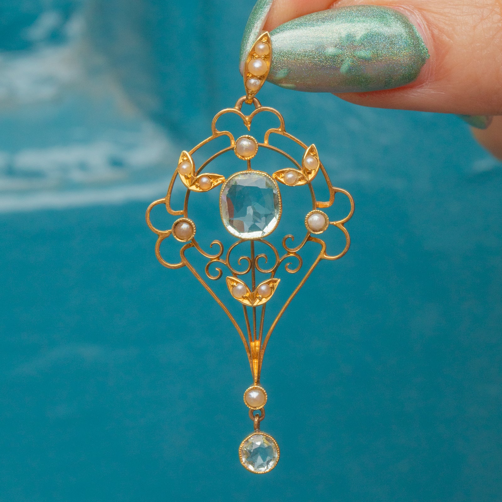 Plucked from the prettiest era, this Edwardian 15ct Gold Aquamarine & Pearl Lavalier pendant boasts delicately sweeping lines set with delectable gemstones creating a truly eye-catching piece!
