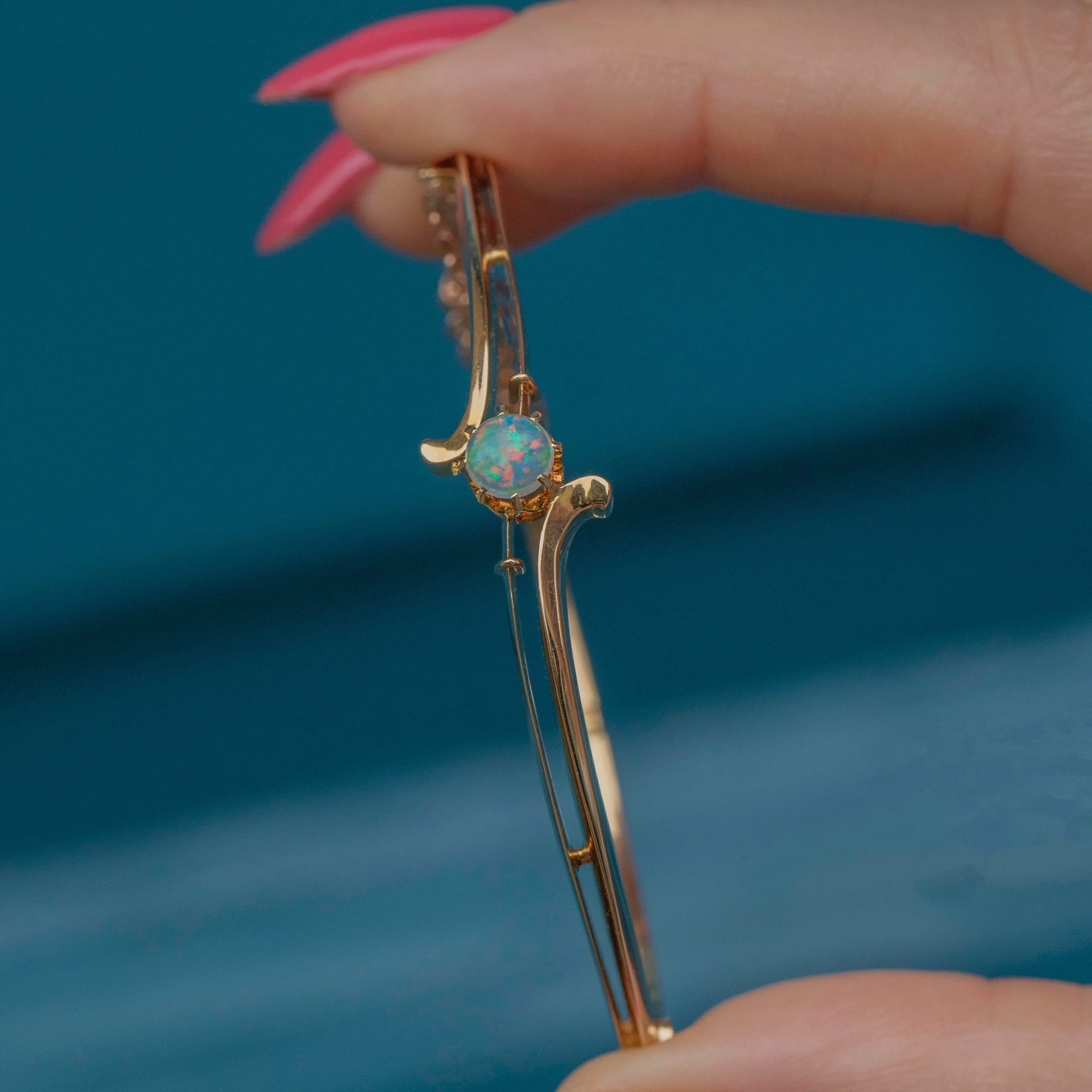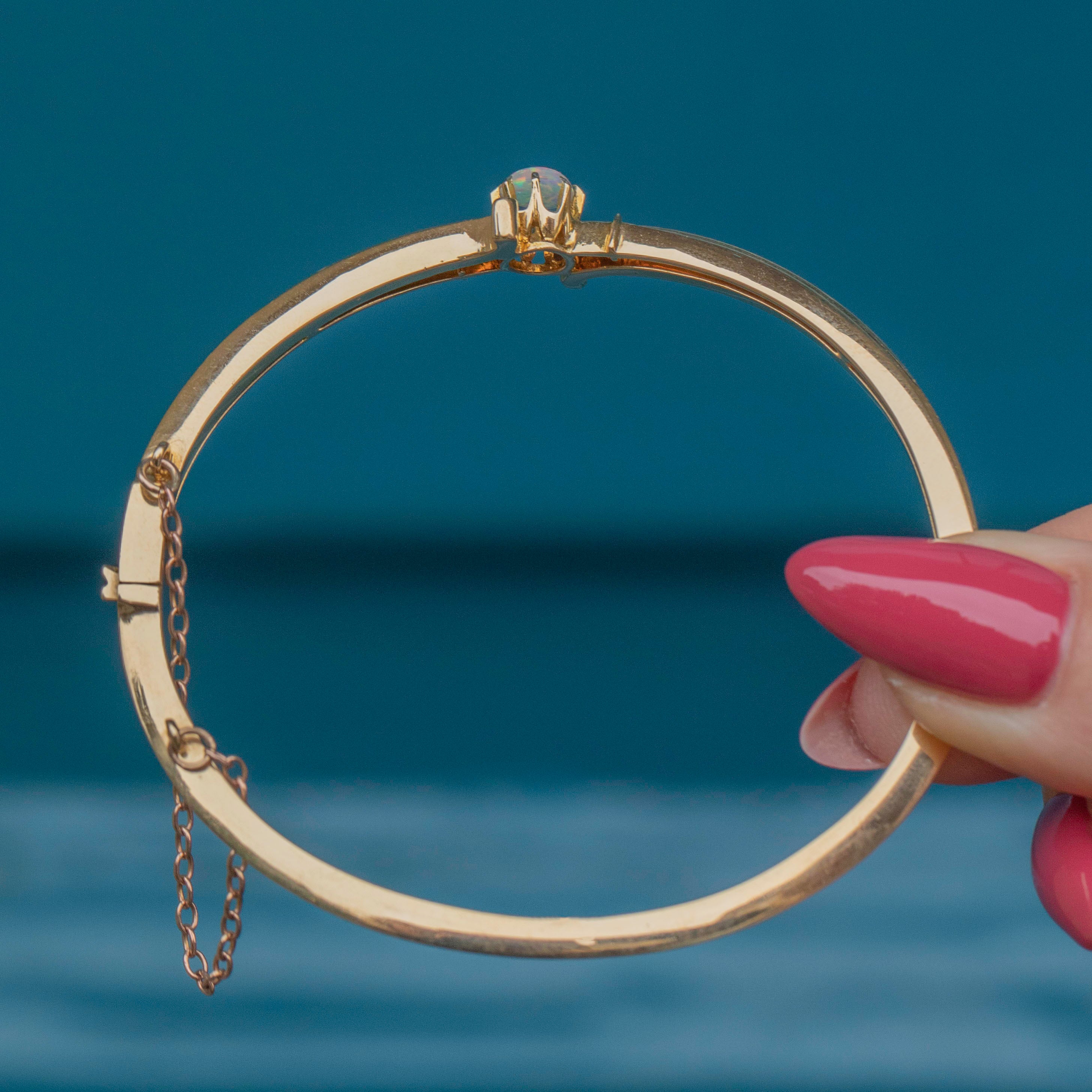 EXCELLENT. This Edwardian 15ct Gold Opal bangle is in excellent condition overall. The Gold is beautifully smooth and sits around your wrist comfortably. The Opal is superb with flecks of fire and flashes of blue. There is minimal wear to note, making her a great investment piece for your collection. We adore her!