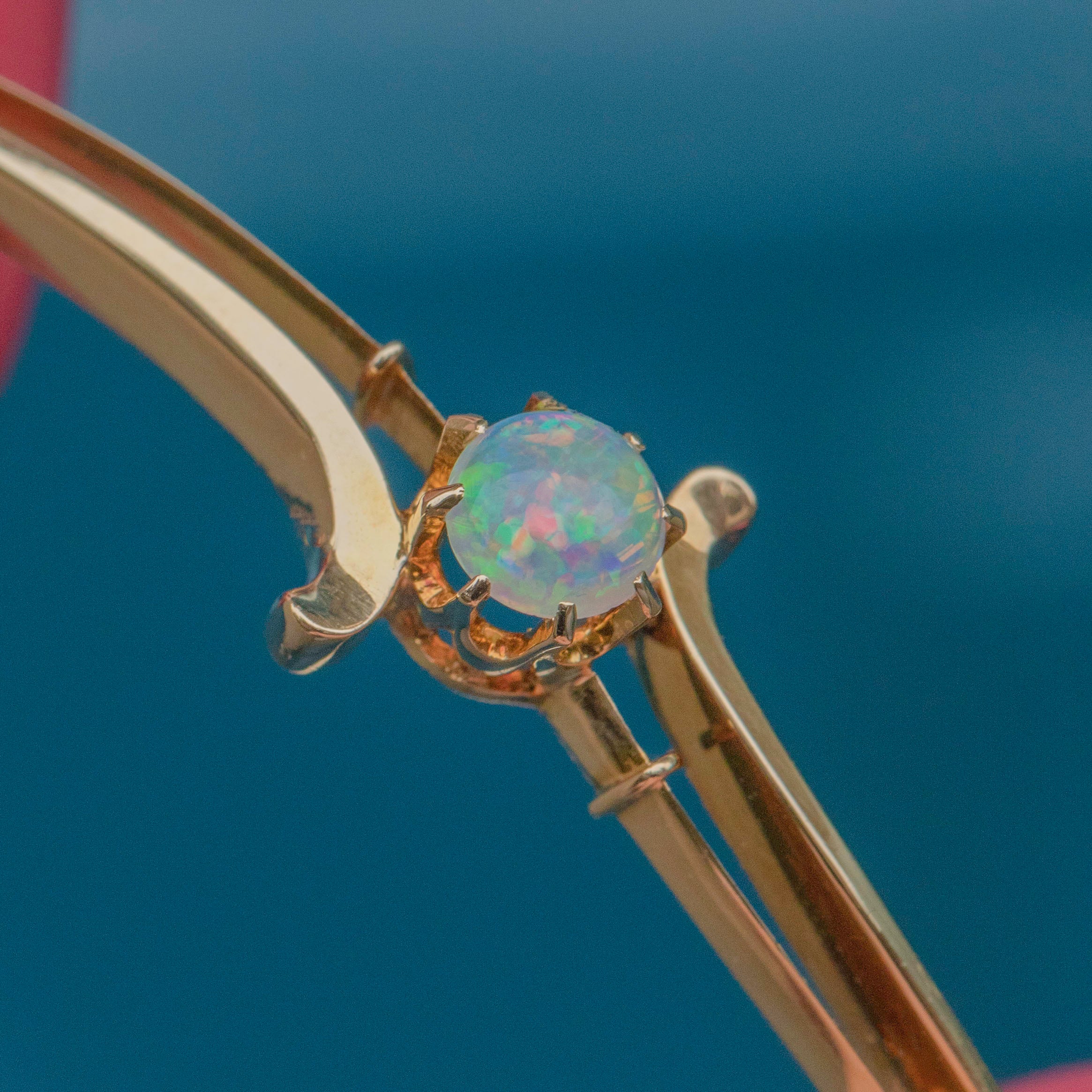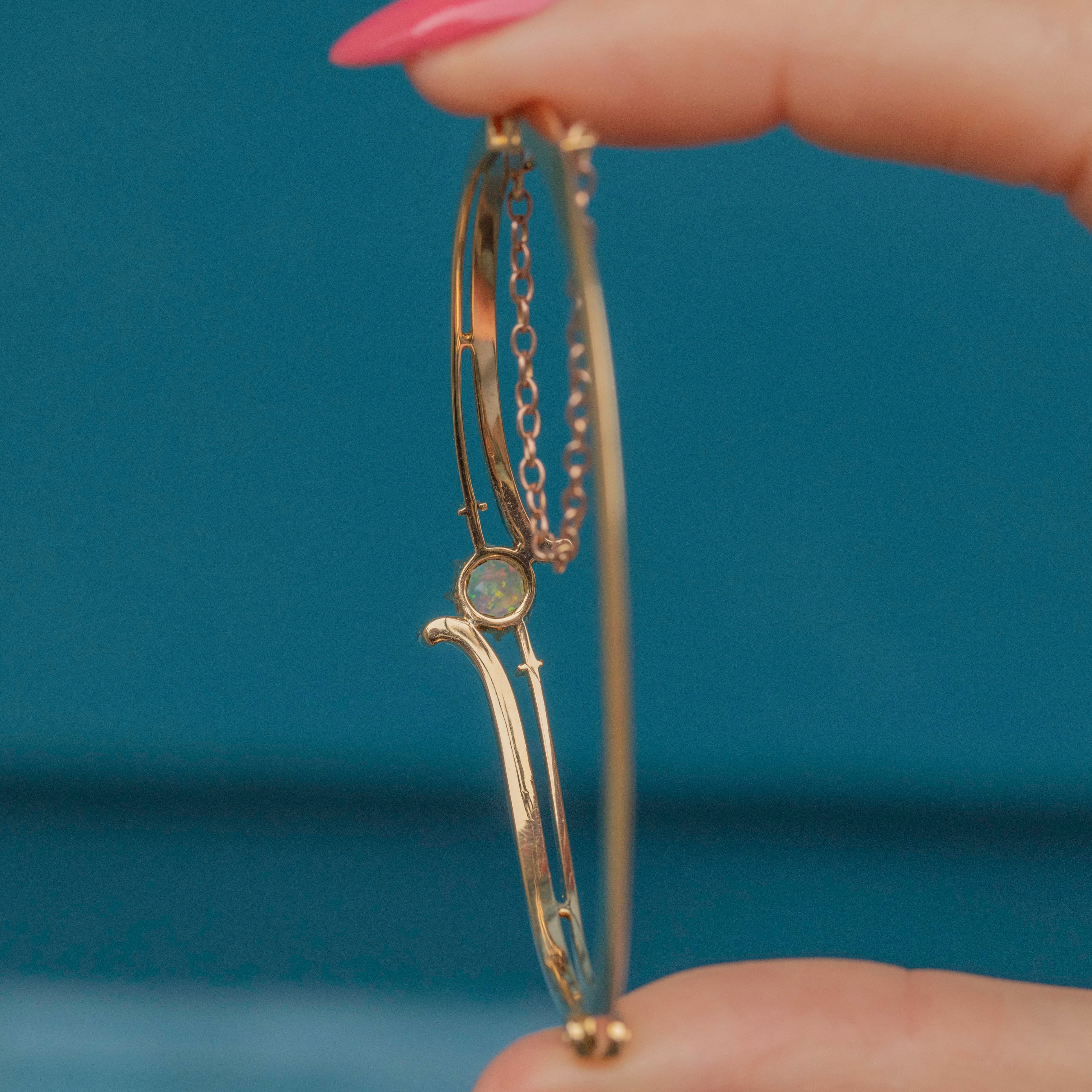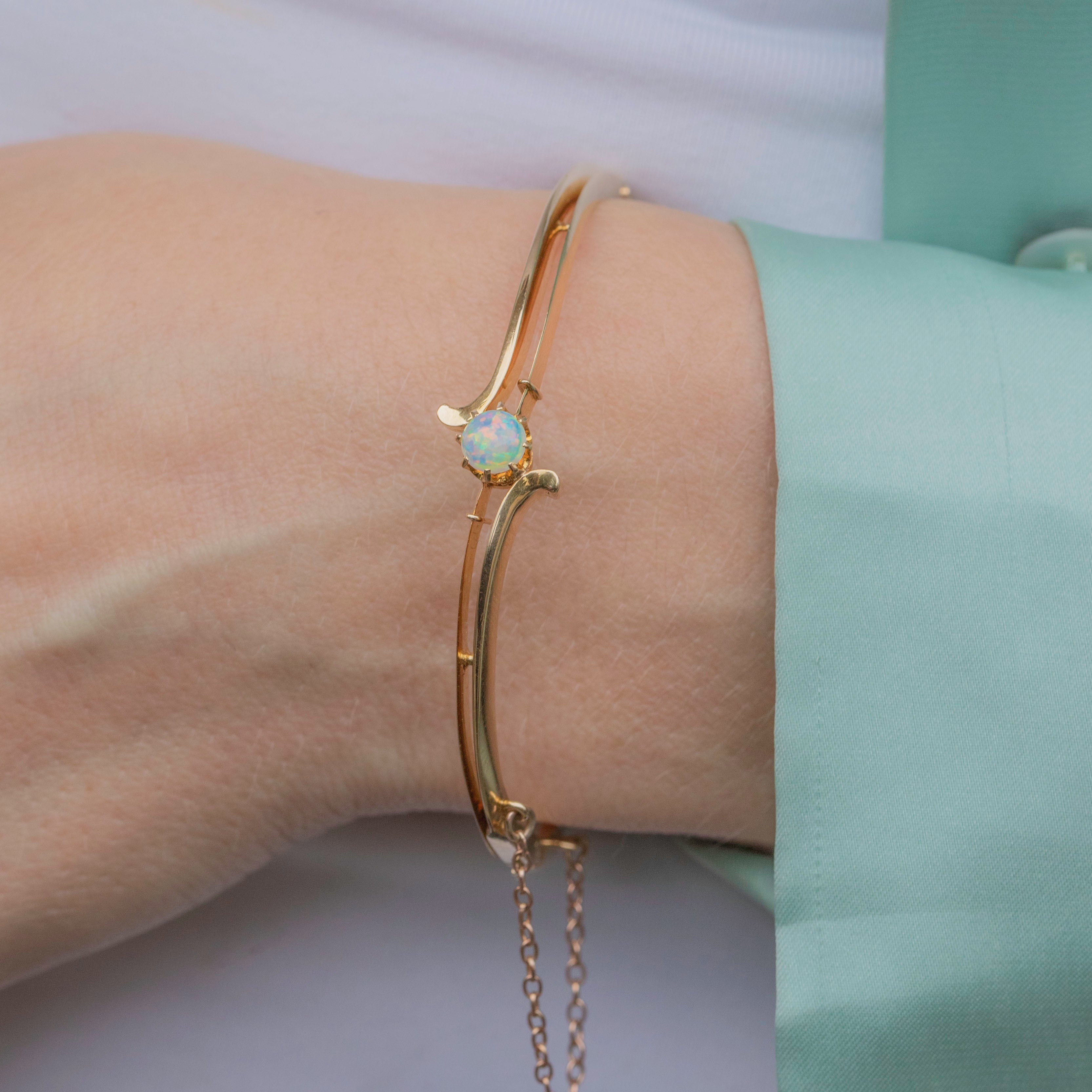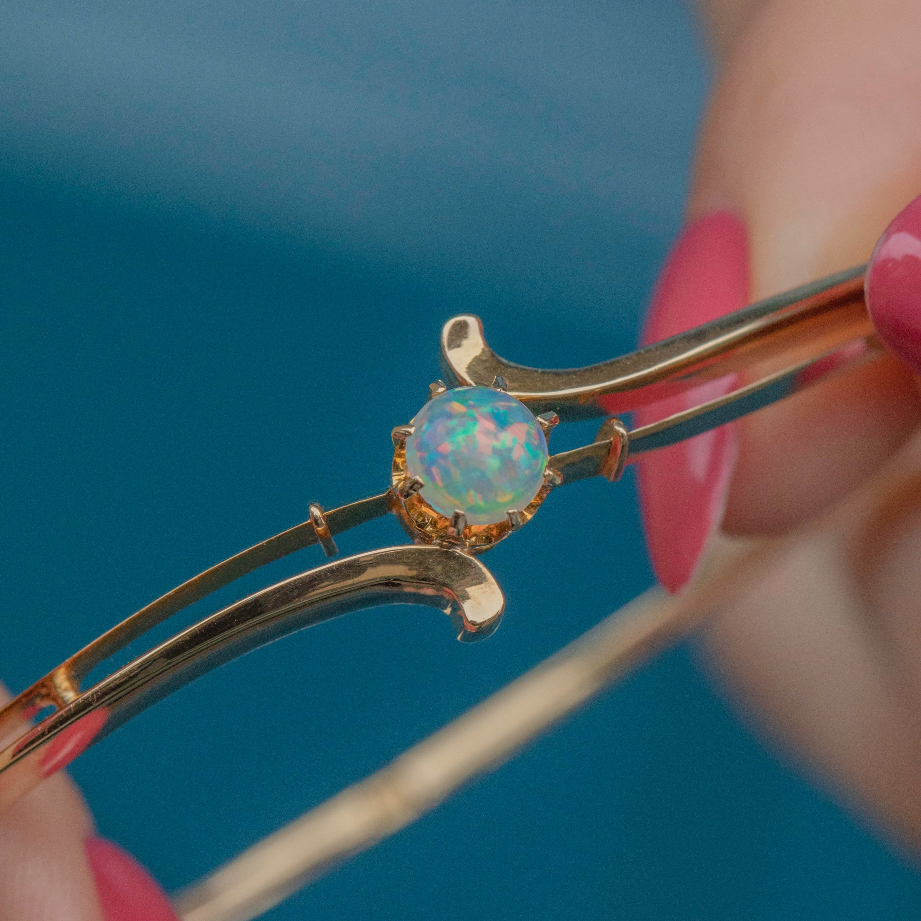 This is an absolutely gorgeous Edwardian 15ct Gold Opal bangle! This splendid antique bracelet features a single 0.35ct cabochon-cut Opal, boasting a stunning myriad of colours displayed within open claw settings.