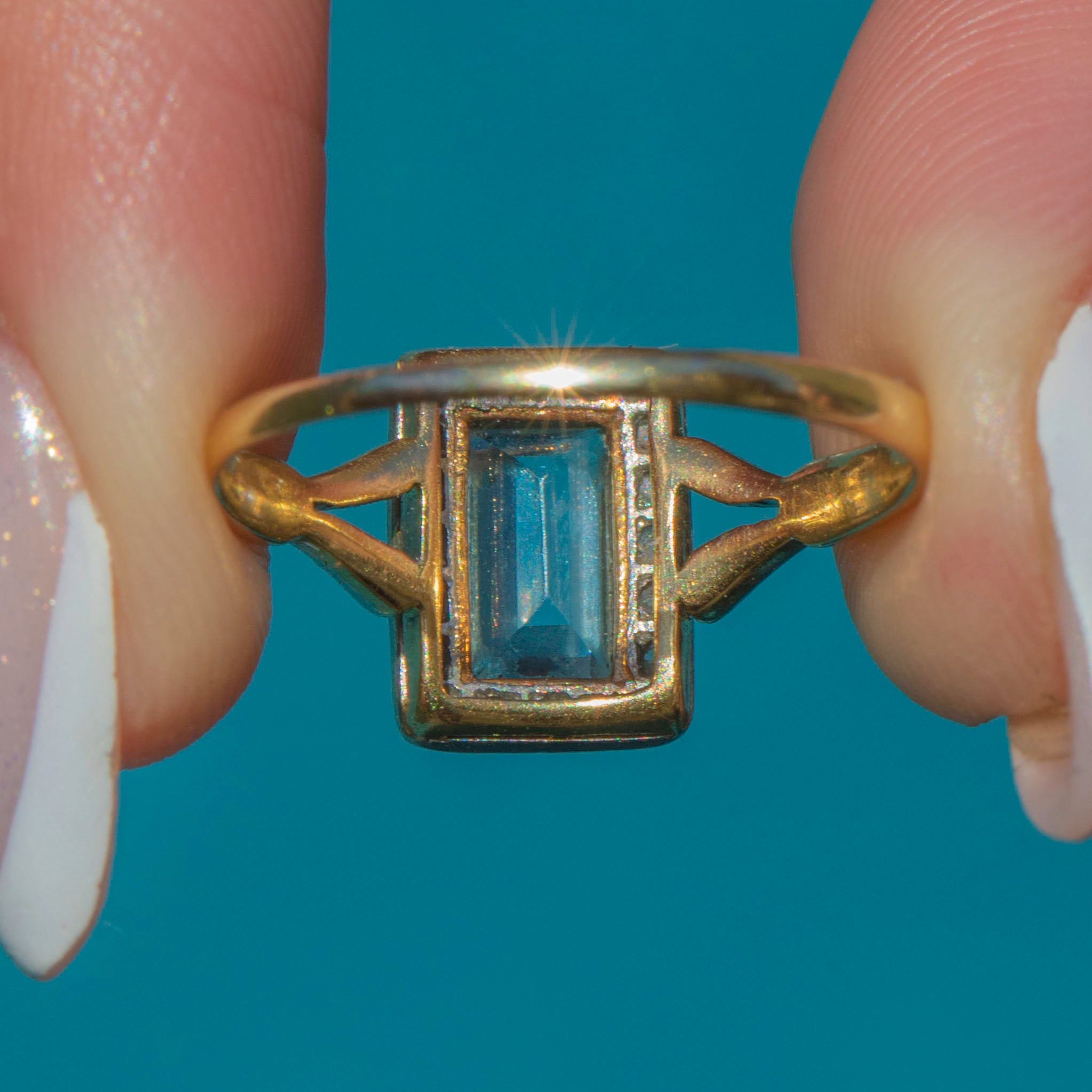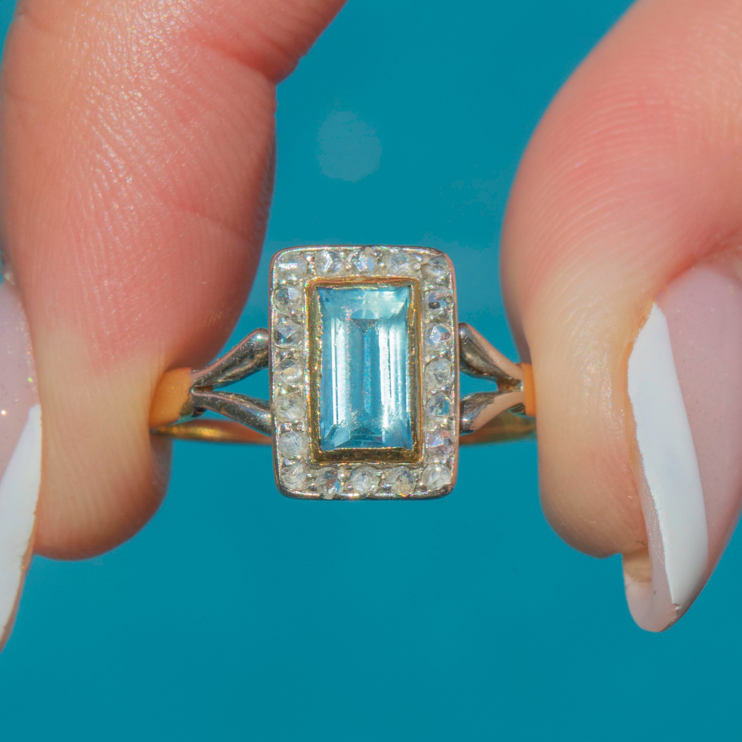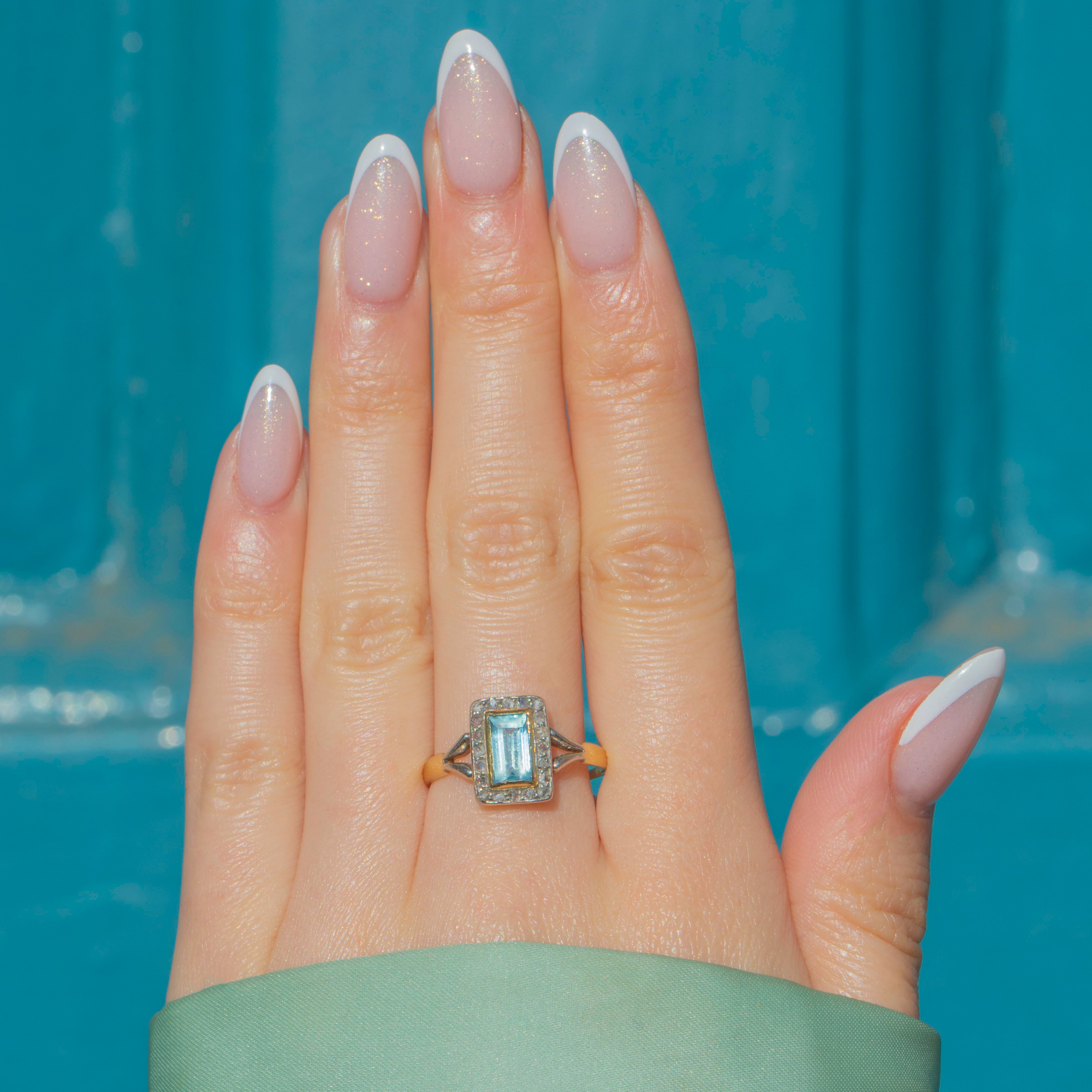 In her centre sits a rectangular-cut cool-toned 0.80ct Aquamarine, embraced by saturated 18ct Gold settings. She is adorned by a cluster of scintillating Diamonds, catching the light with a lovely twinkle and effortlessly complementing the azure blue Aquamarine.