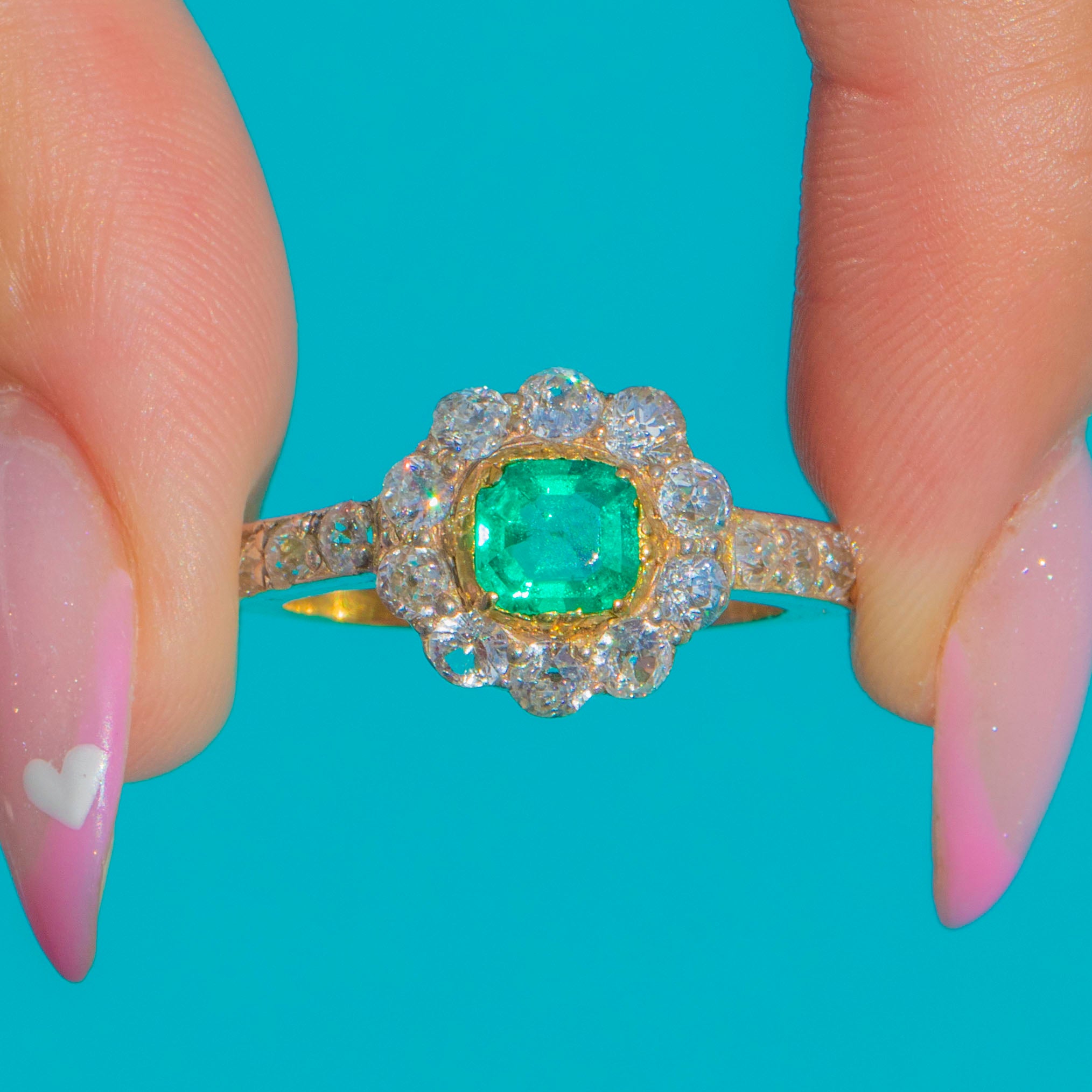 EXCELLENT: The Emerald is richly coloured with fine clarity and minimal natural inclusions. Diamonds are bright, well-matched and securely set. The Gold and Silver retain a beautiful antique polish, with no thinning or wear to the band. A superbly preserved Edwardian cluster ring of outstanding quality.