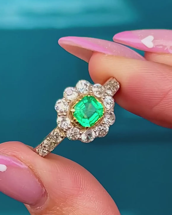 Antique 18ct Gold Emerald Ring with Diamond Halo