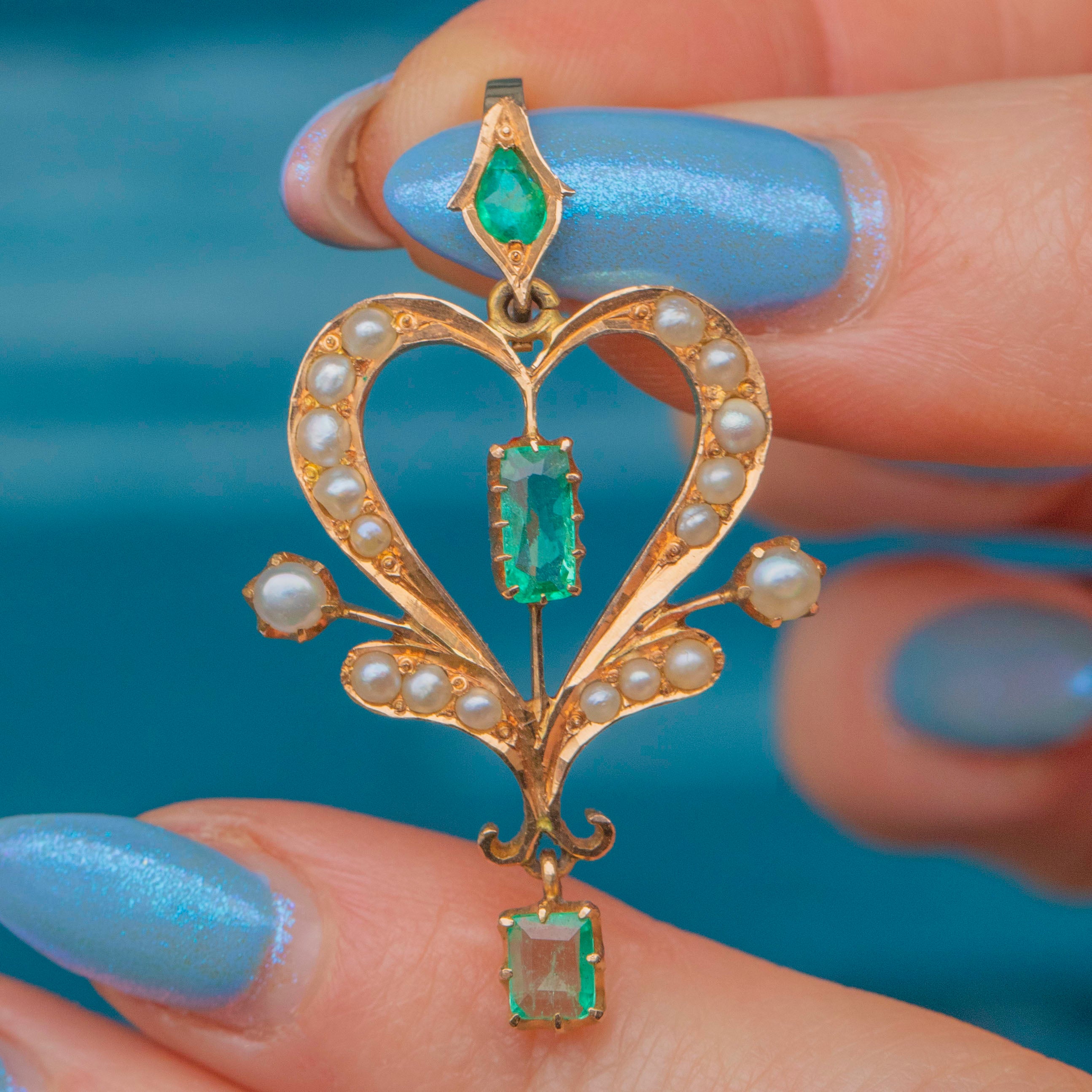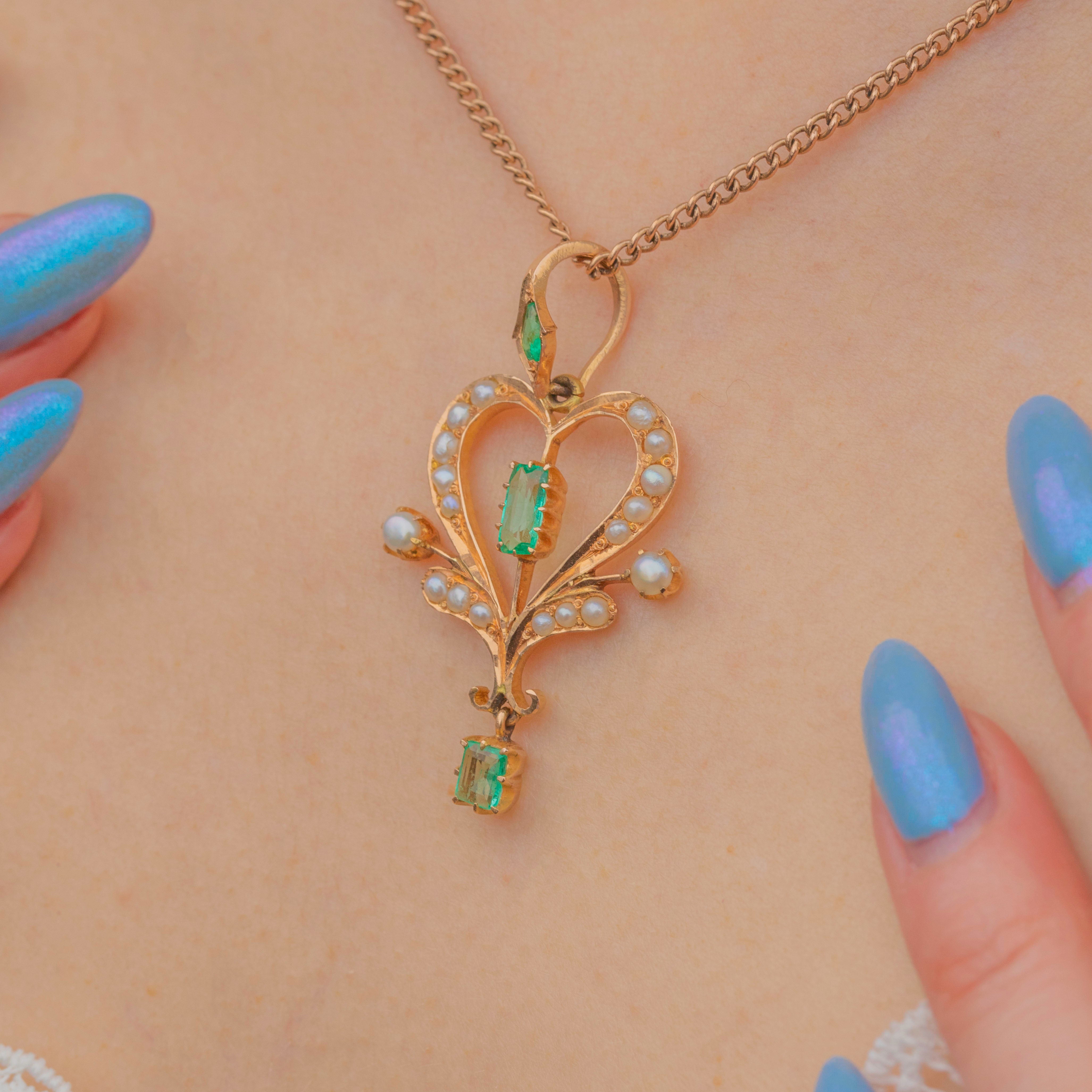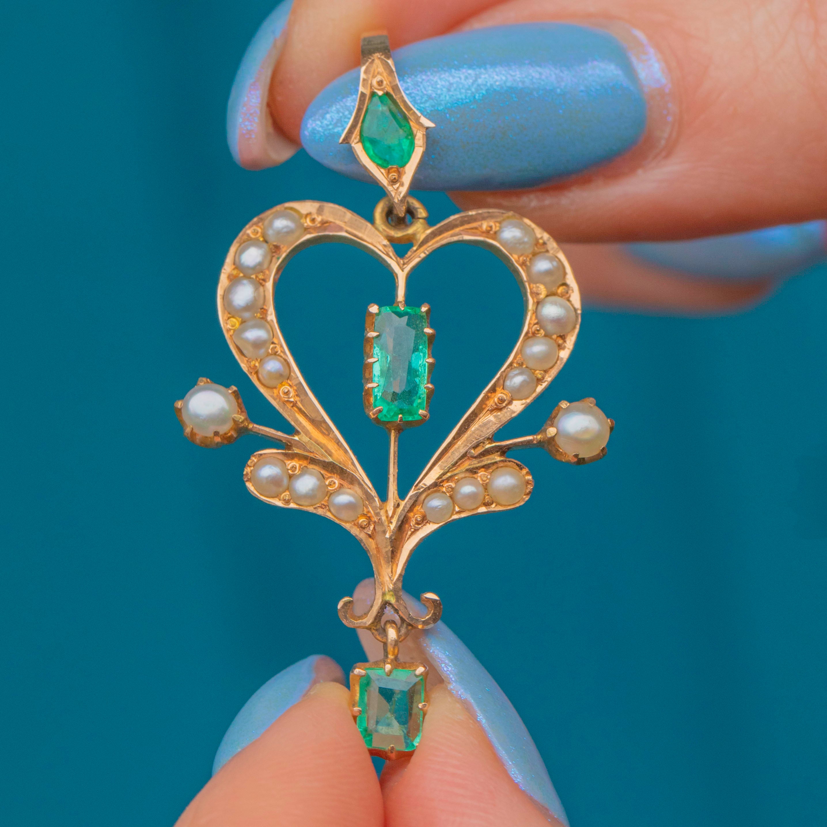 Feminine and floral, this Edwardian 18ct Gold Emerald Pearl lavalier pendant captures the beauty of the early 20th century! Set in saturated 18ct Gold, a vibrant green rectangular-cut Emerald takes centre stage, with an abundance of iridescent seed Pearls embellishing every curve -with an additional verdant Emerald drop and pear shaped Emerald on the bale.