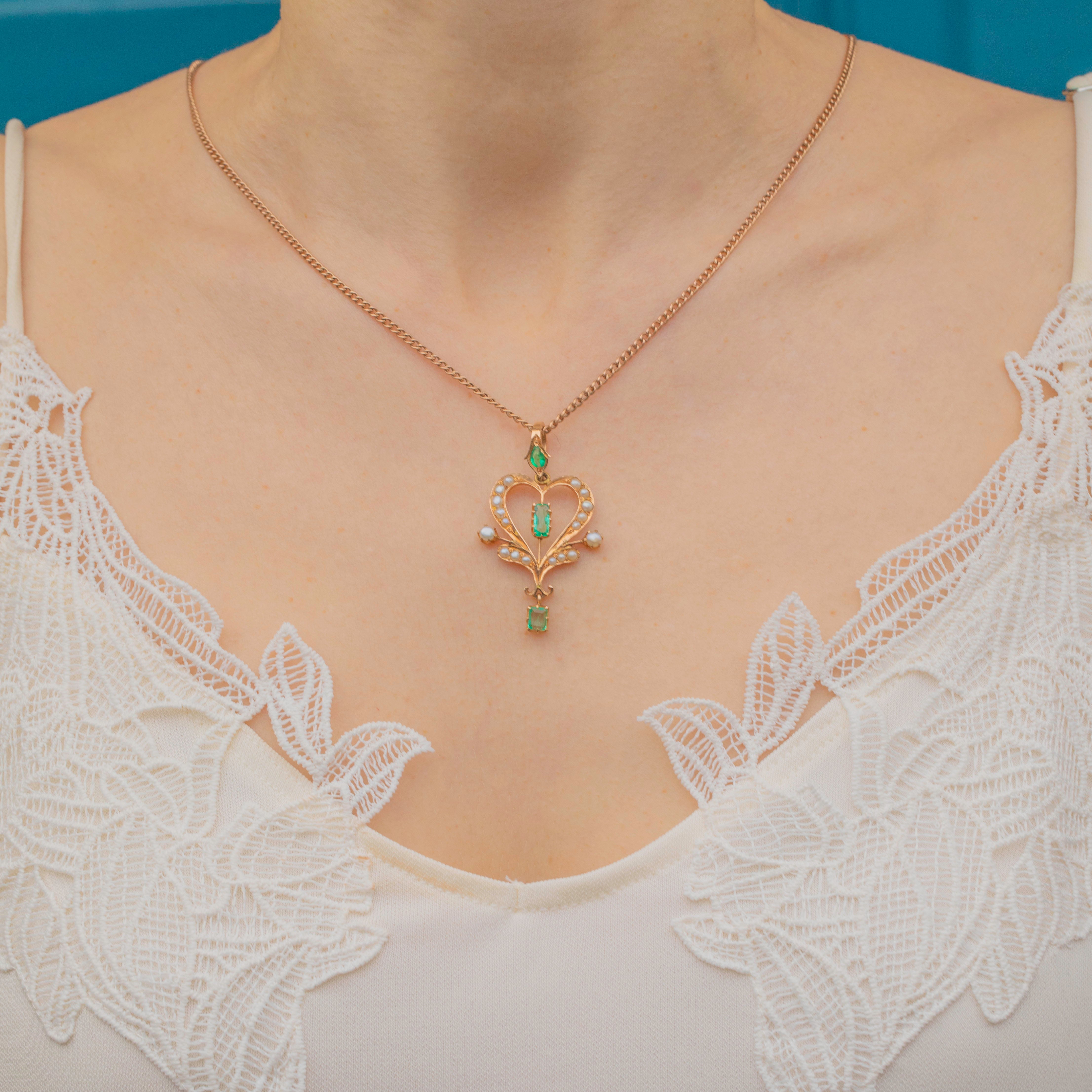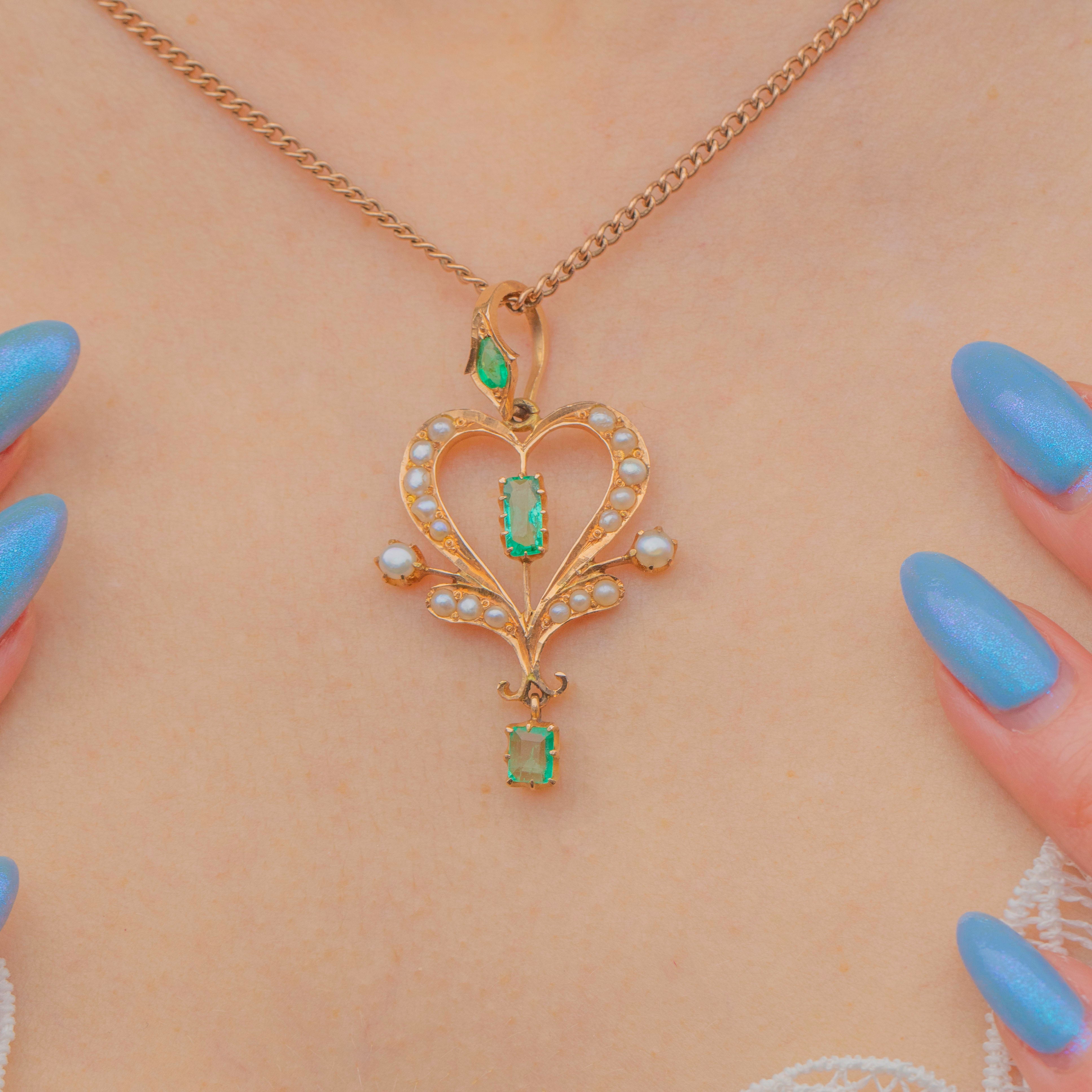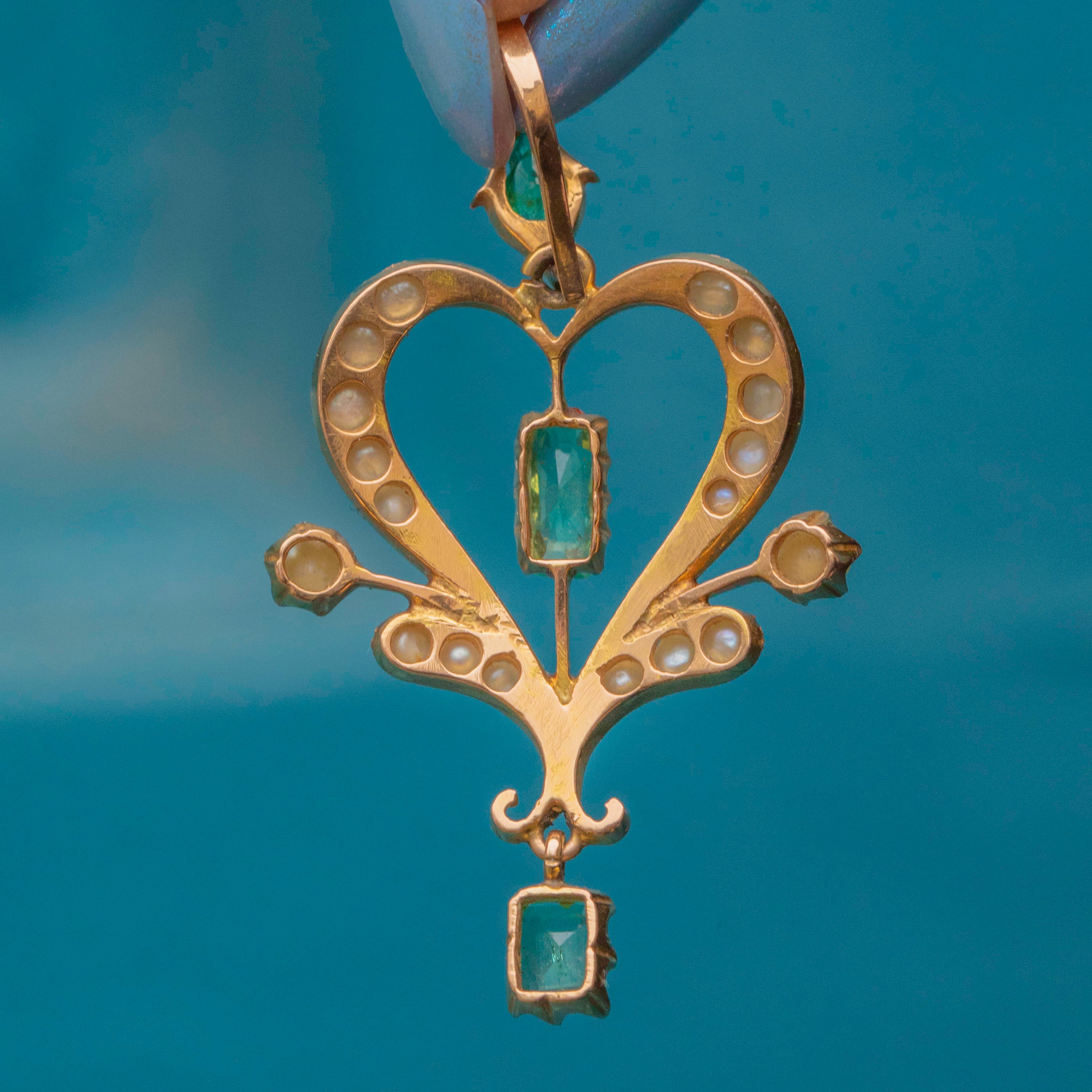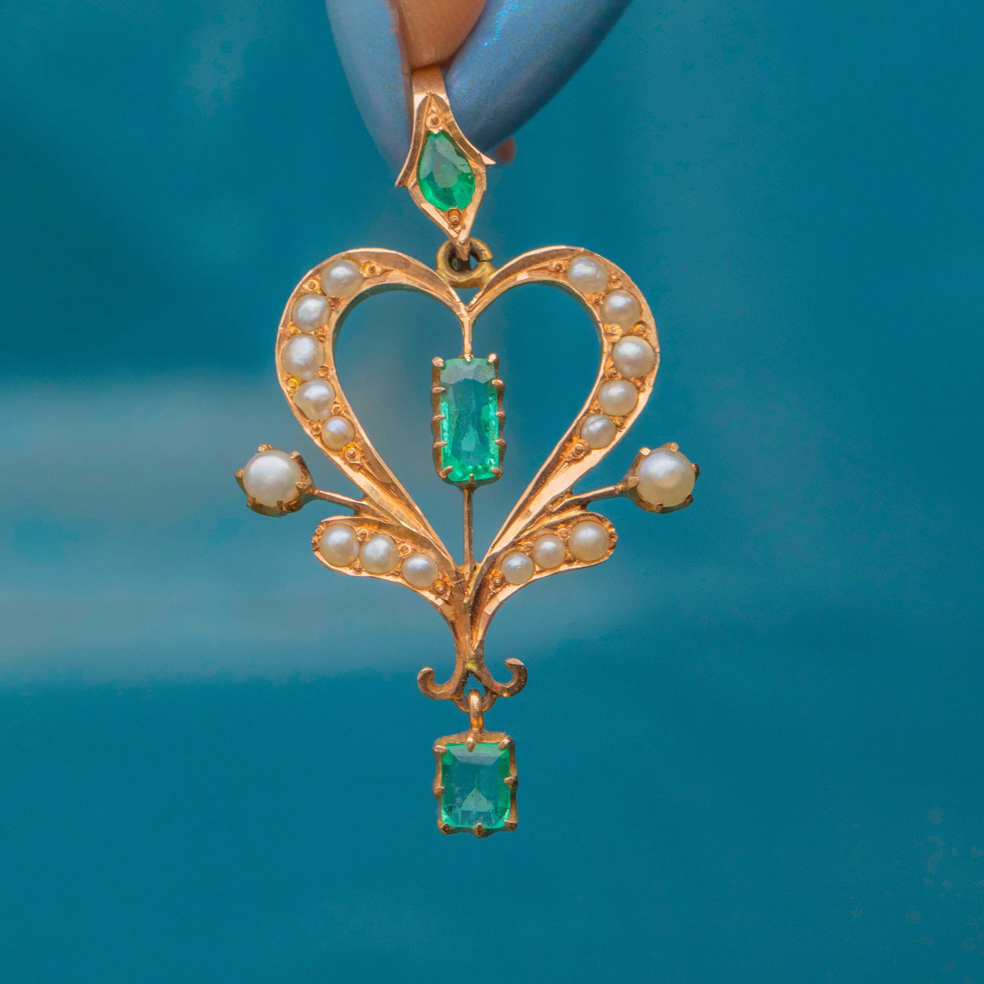 Feminine and floral, this Edwardian 18ct Gold Emerald Pearl lavalier pendant captures the beauty of the early 20th century! Set in saturated 18ct Gold, a vibrant green rectangular-cut Emerald takes centre stage, with an abundance of iridescent seed Pearls embellishing every curve -with an additional verdant Emerald drop and pear shaped Emerald on the bale.