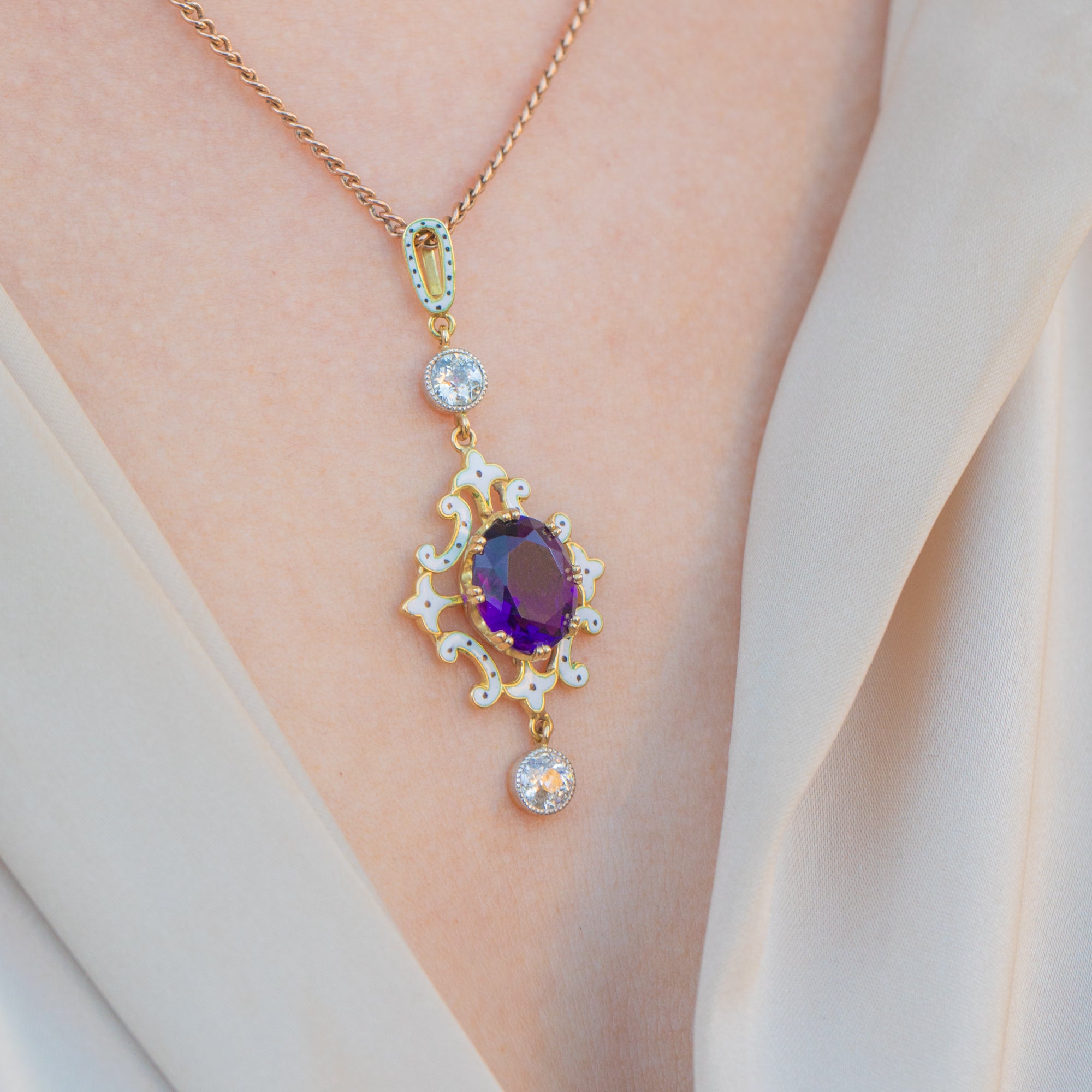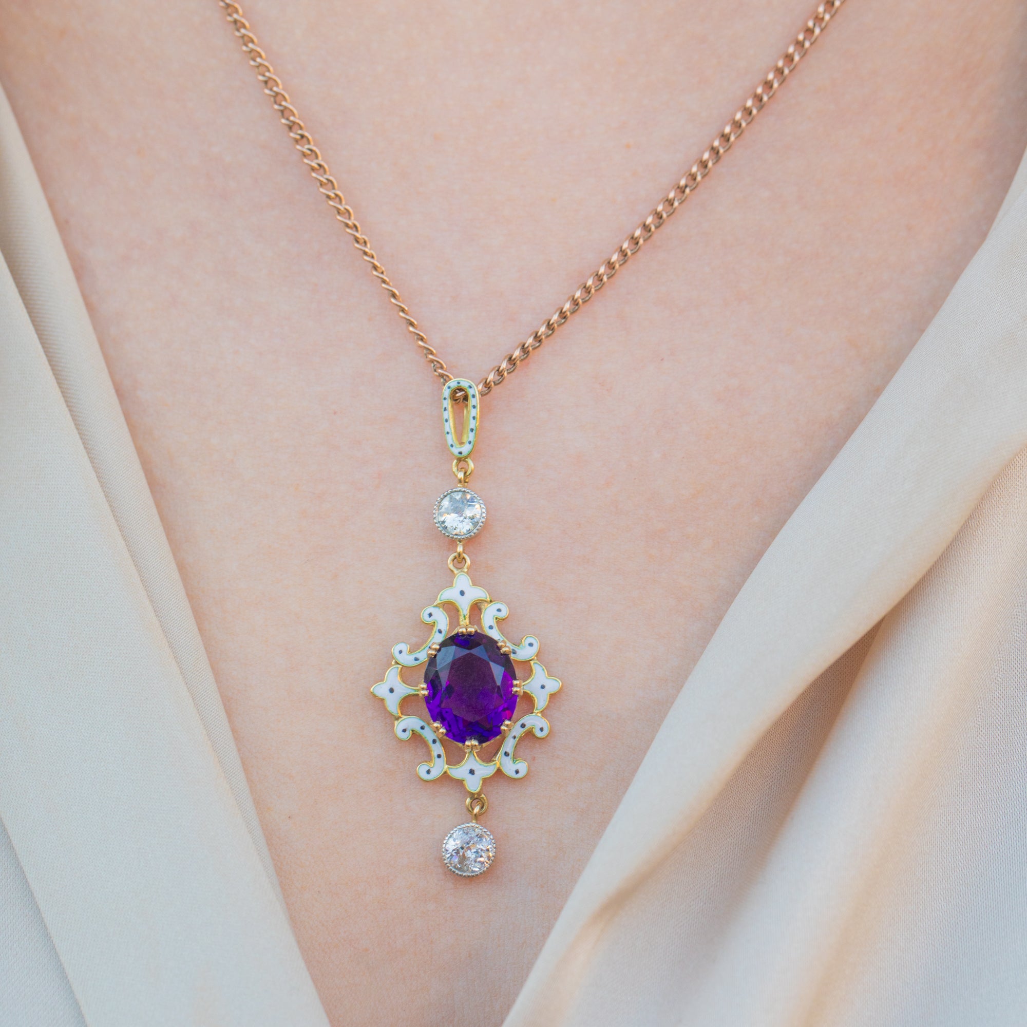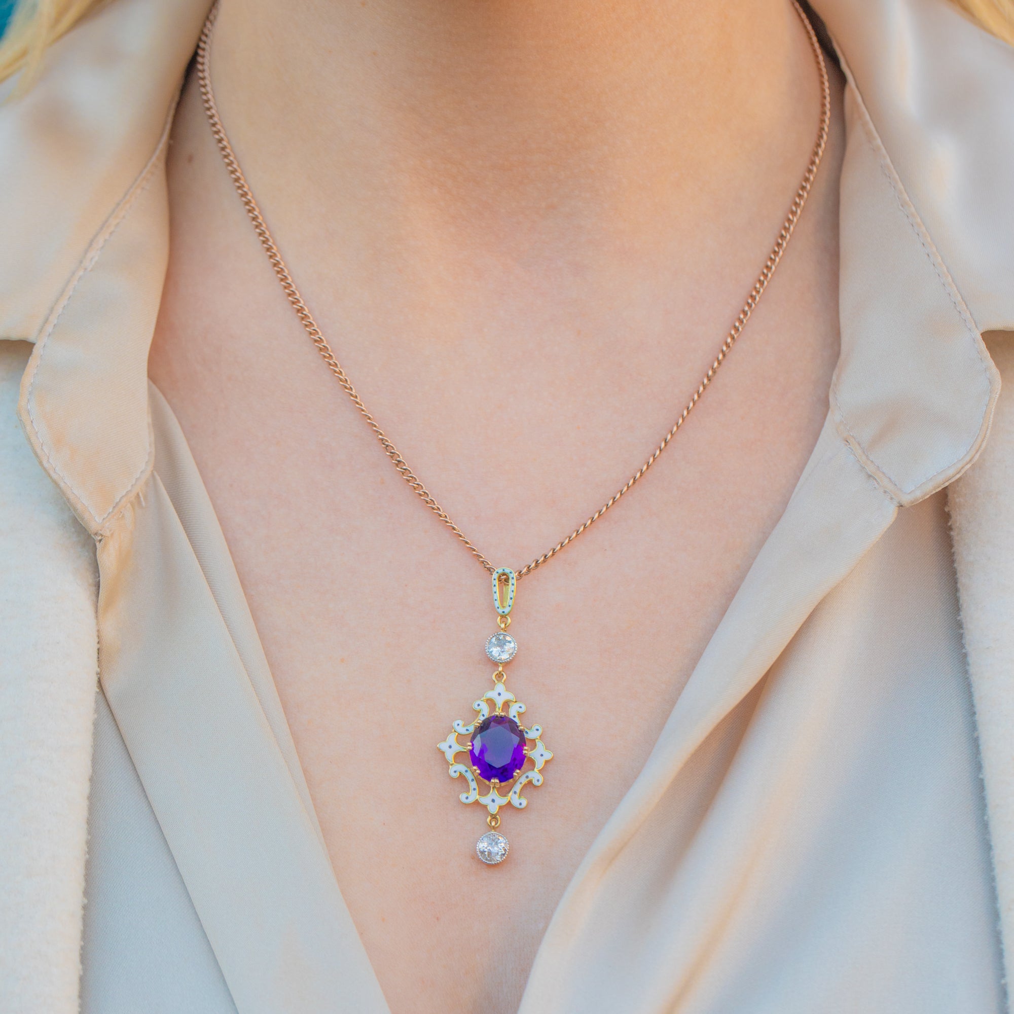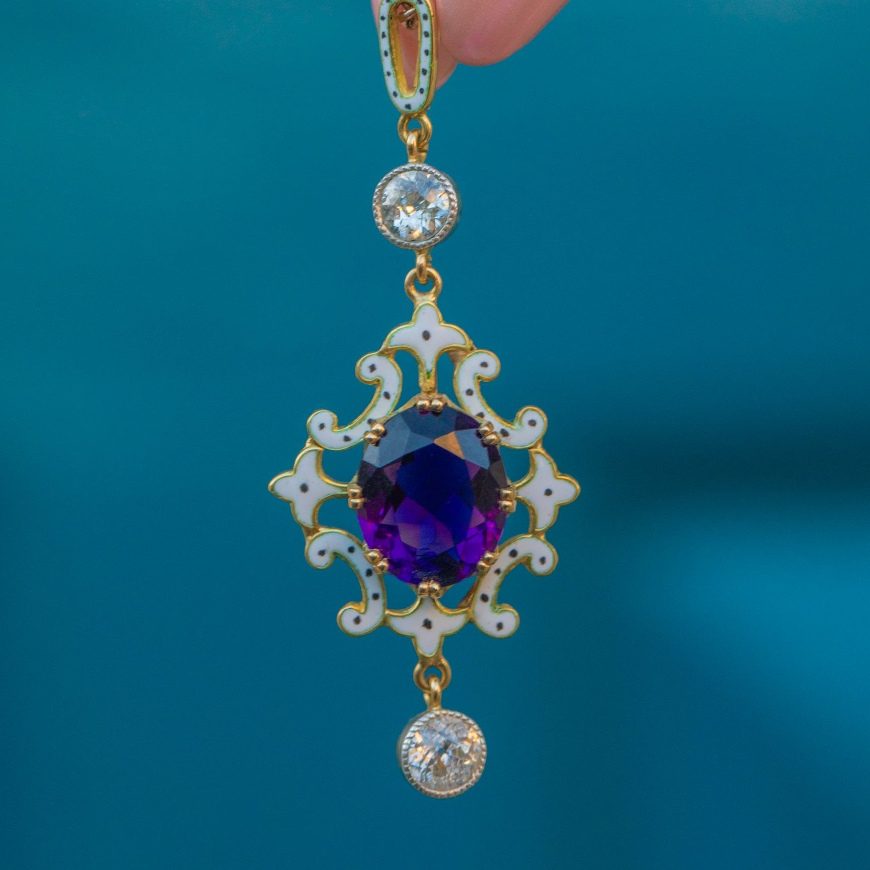 We simply adore this Edwardian 18ct Gold Enamel Amethyst Diamond drop pendant!