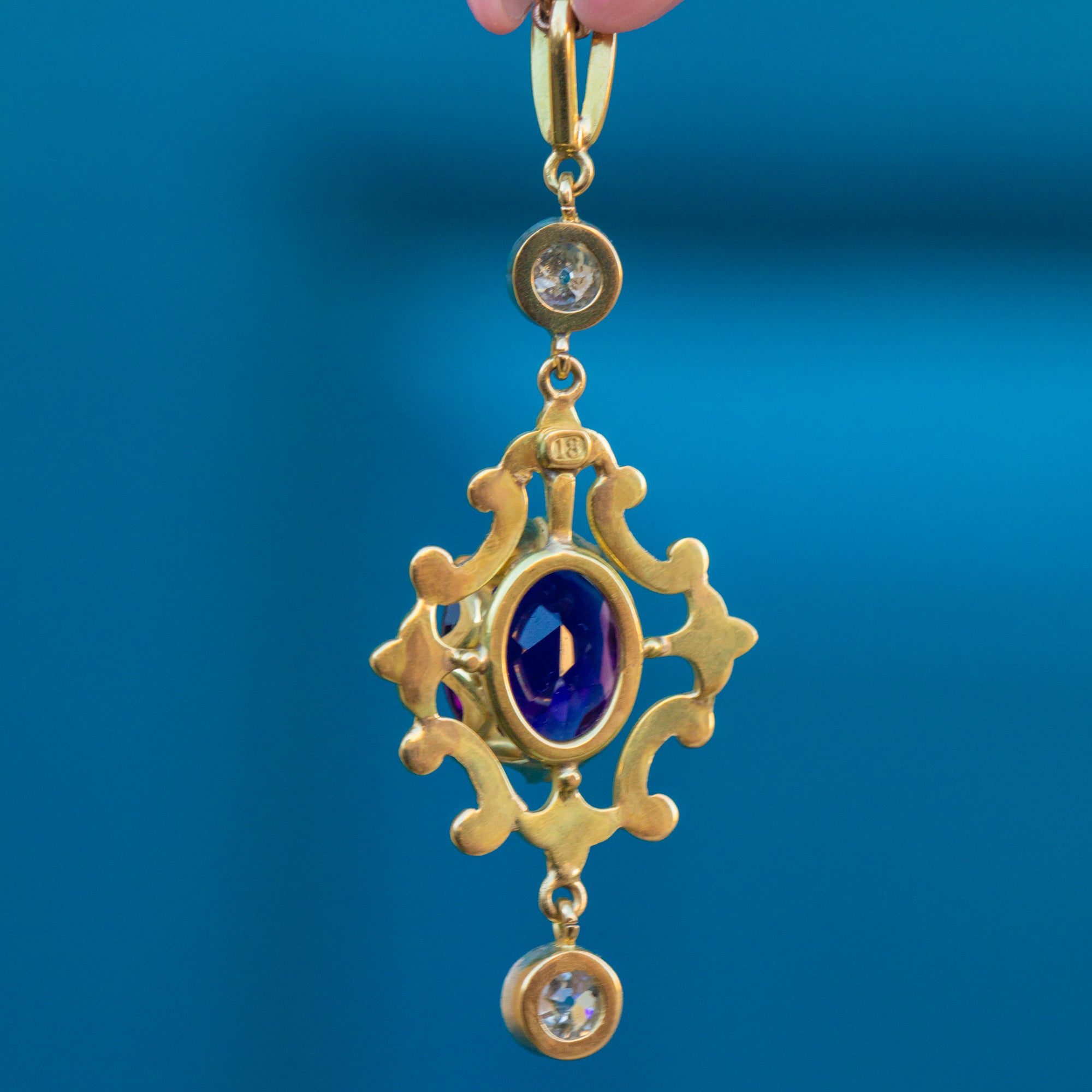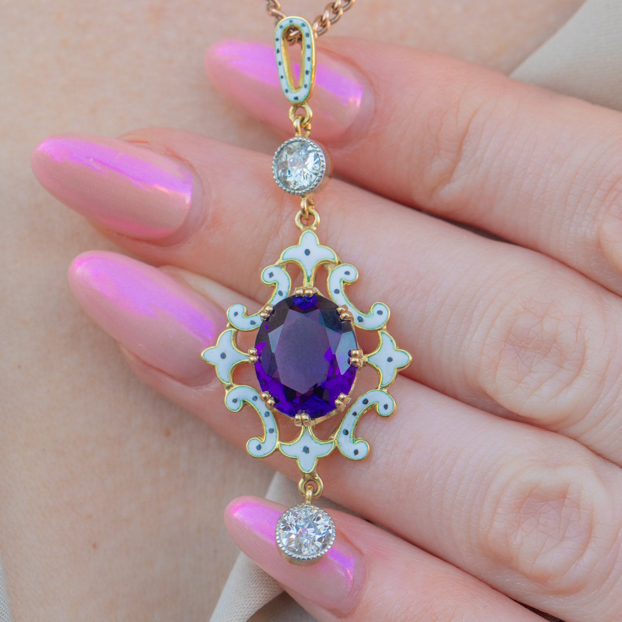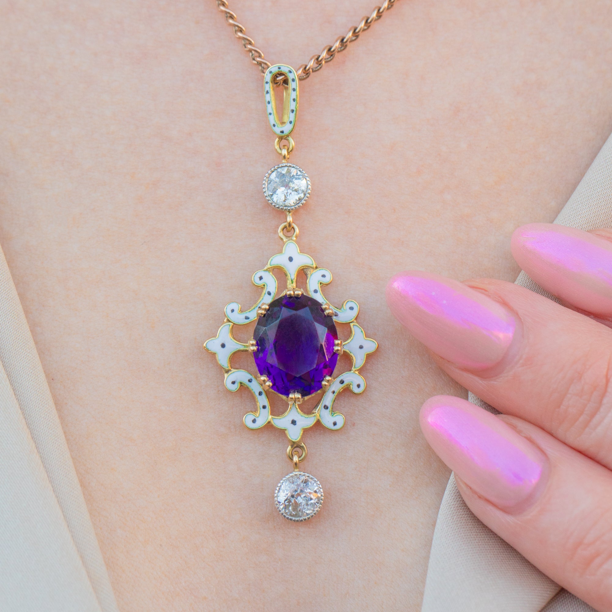 Crafted from lustrous 18ct Gold, this antique drop pendant is a truly eye-catching piece. Each element of this Edwardian piece is vibrant and full of character, from her gleaming spotted Enamel settings, to her large rich Amethyst and twinkling adorning Diamonds.