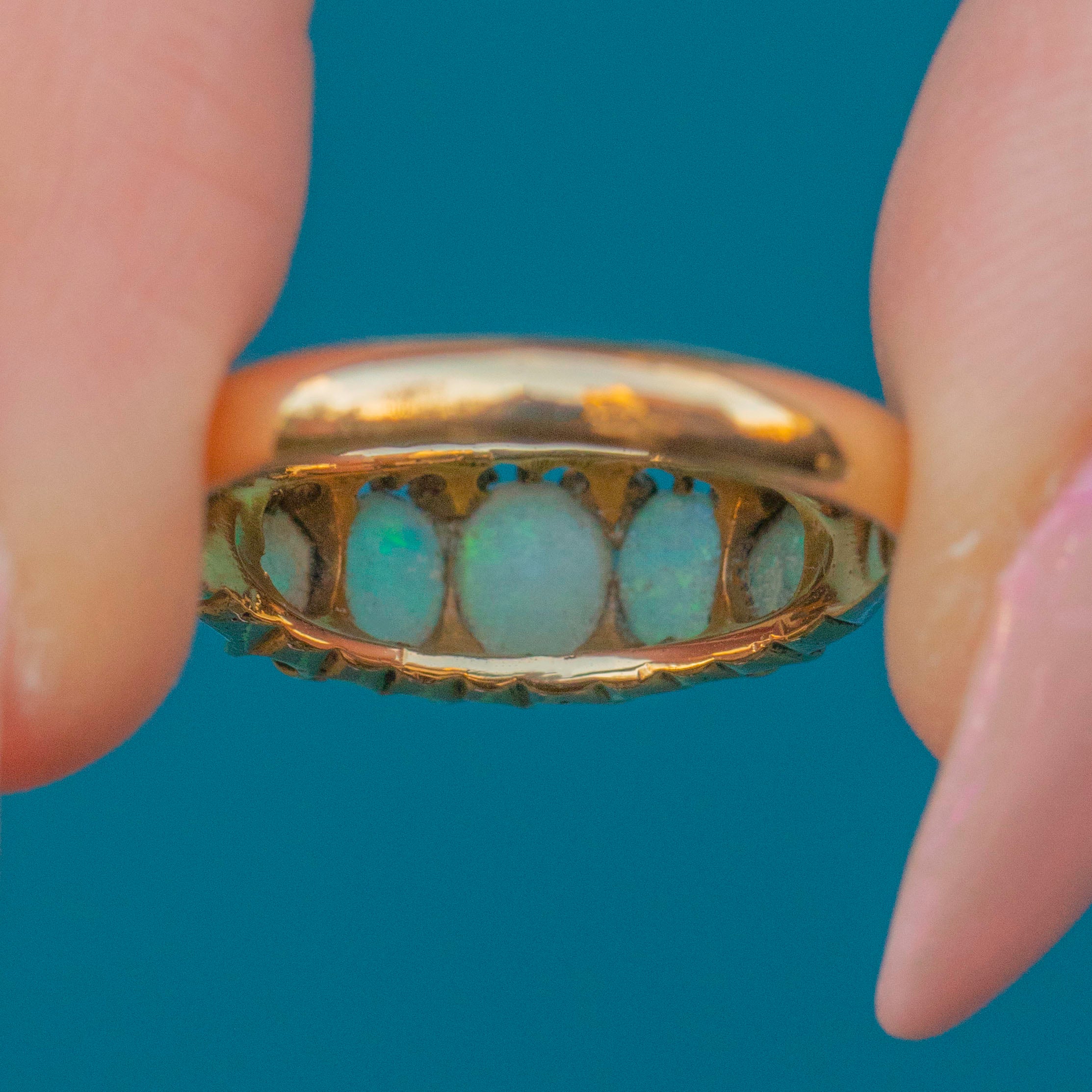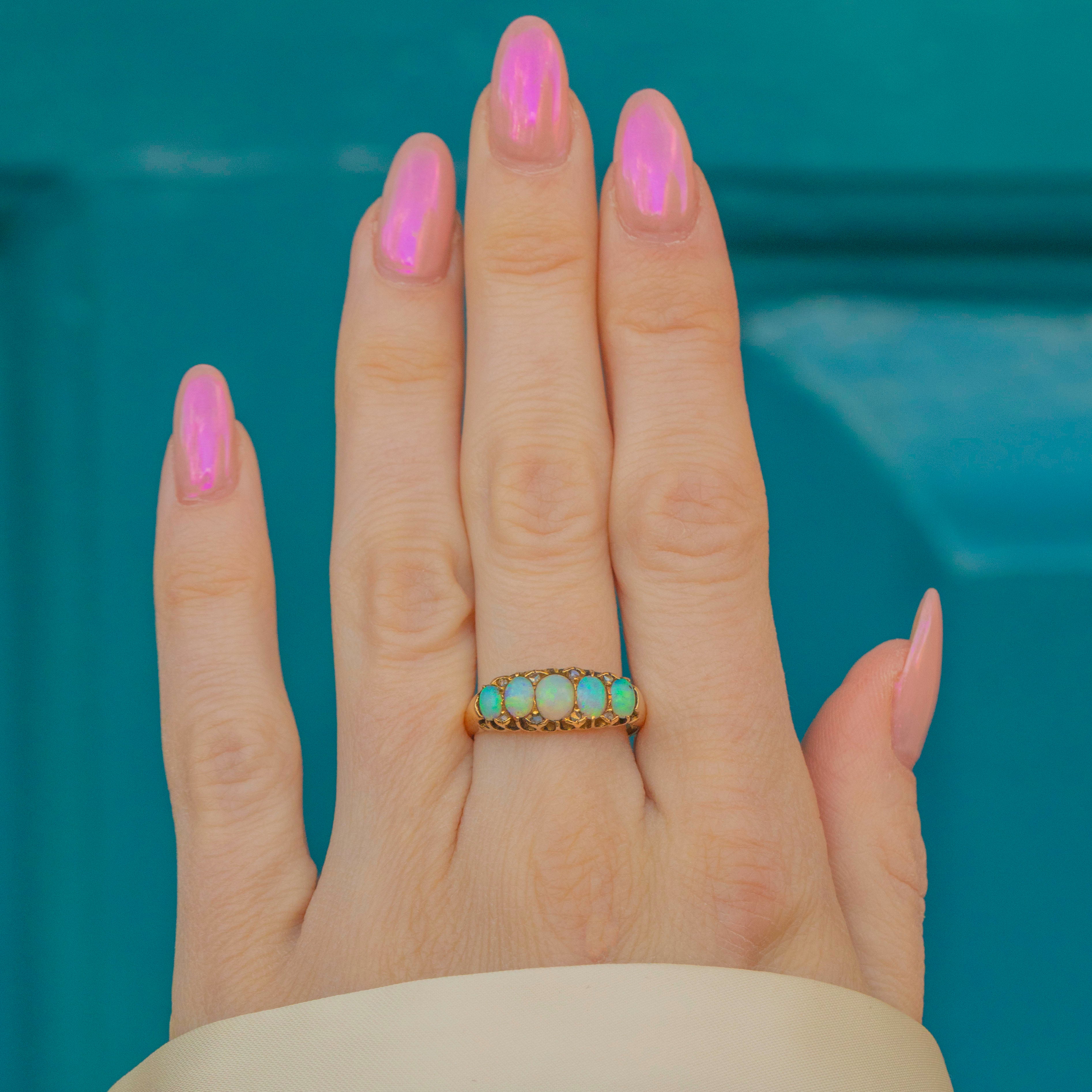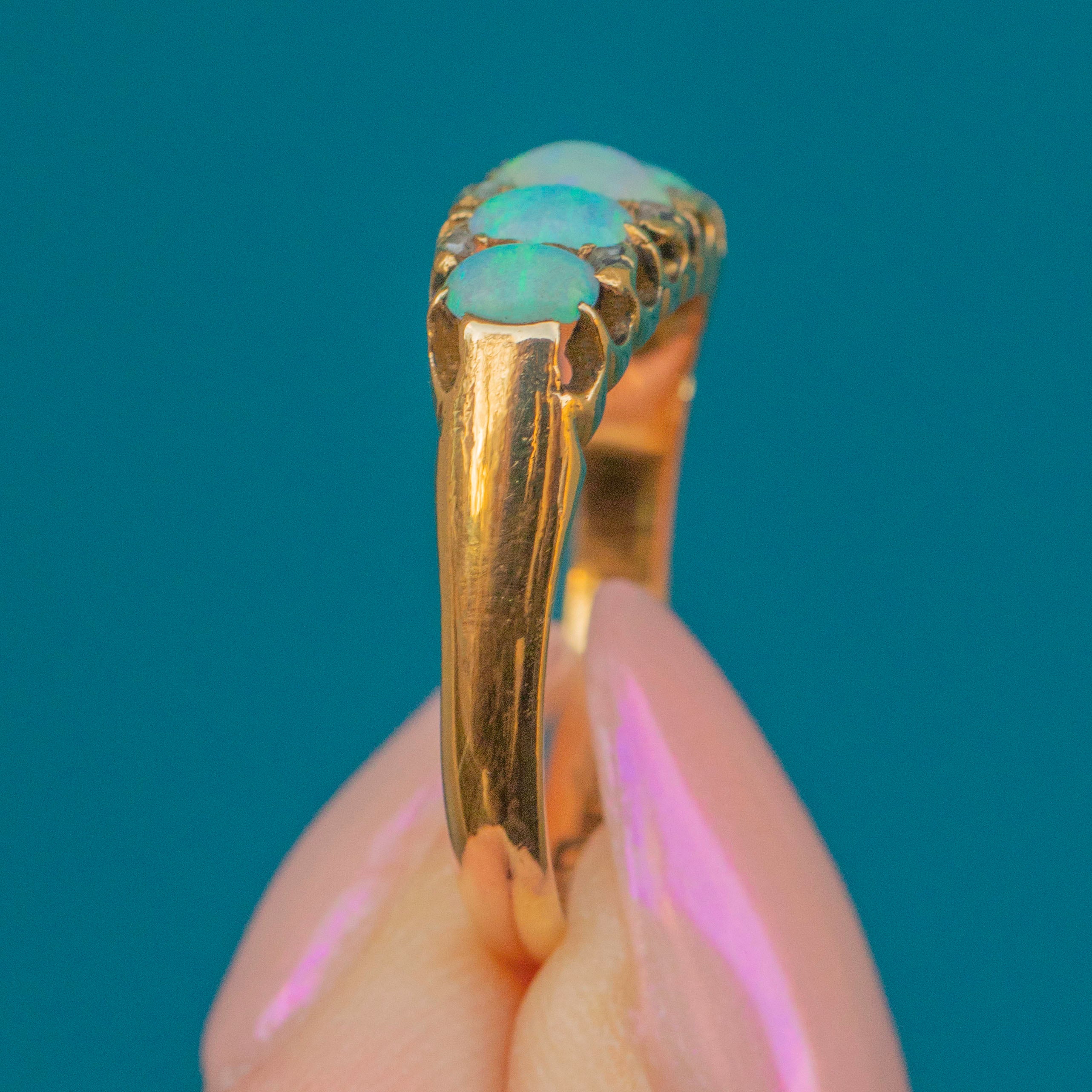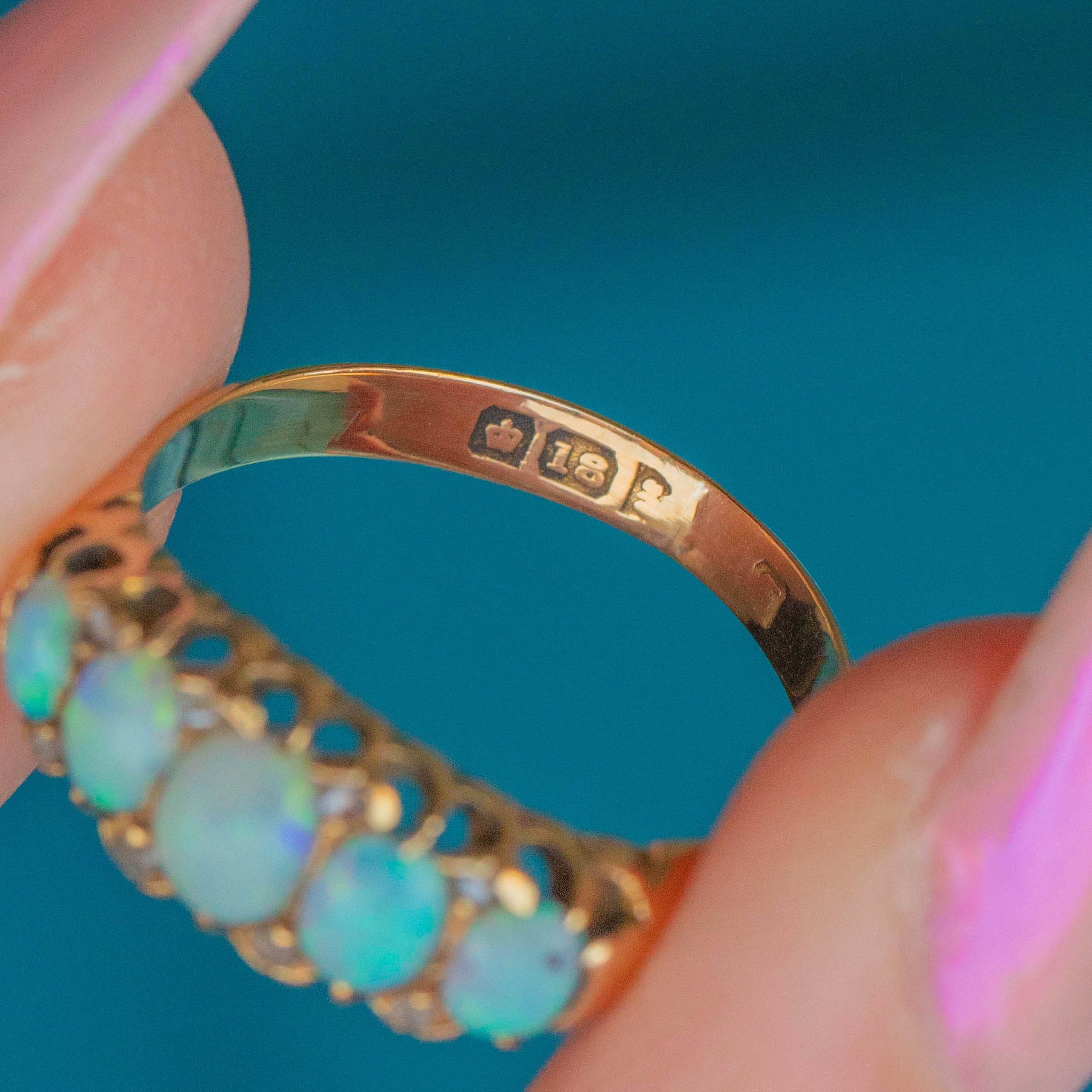 MATERIALS: Tests as 18ct Gold, Opal (solid natural), Rose-cut Diamond spacers.