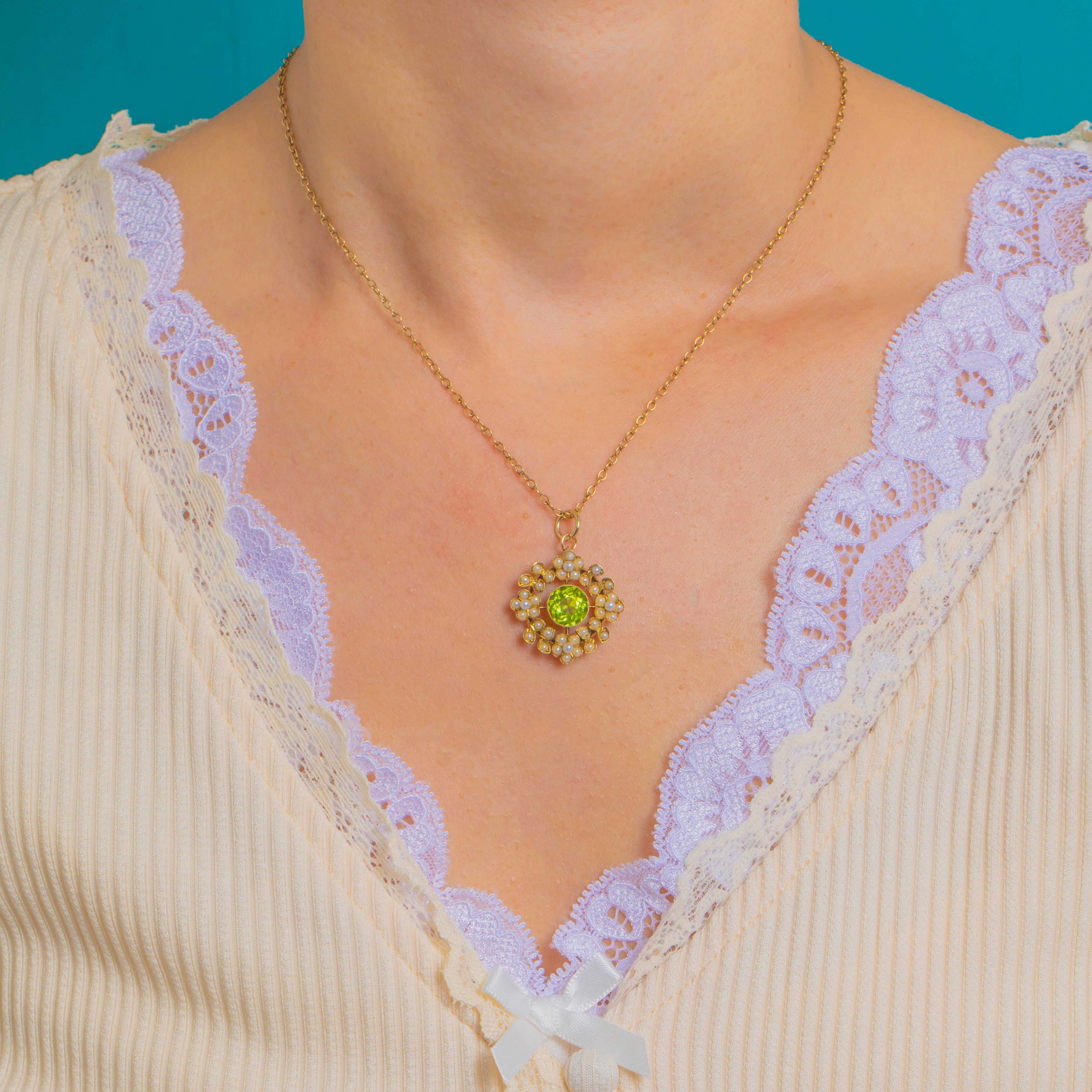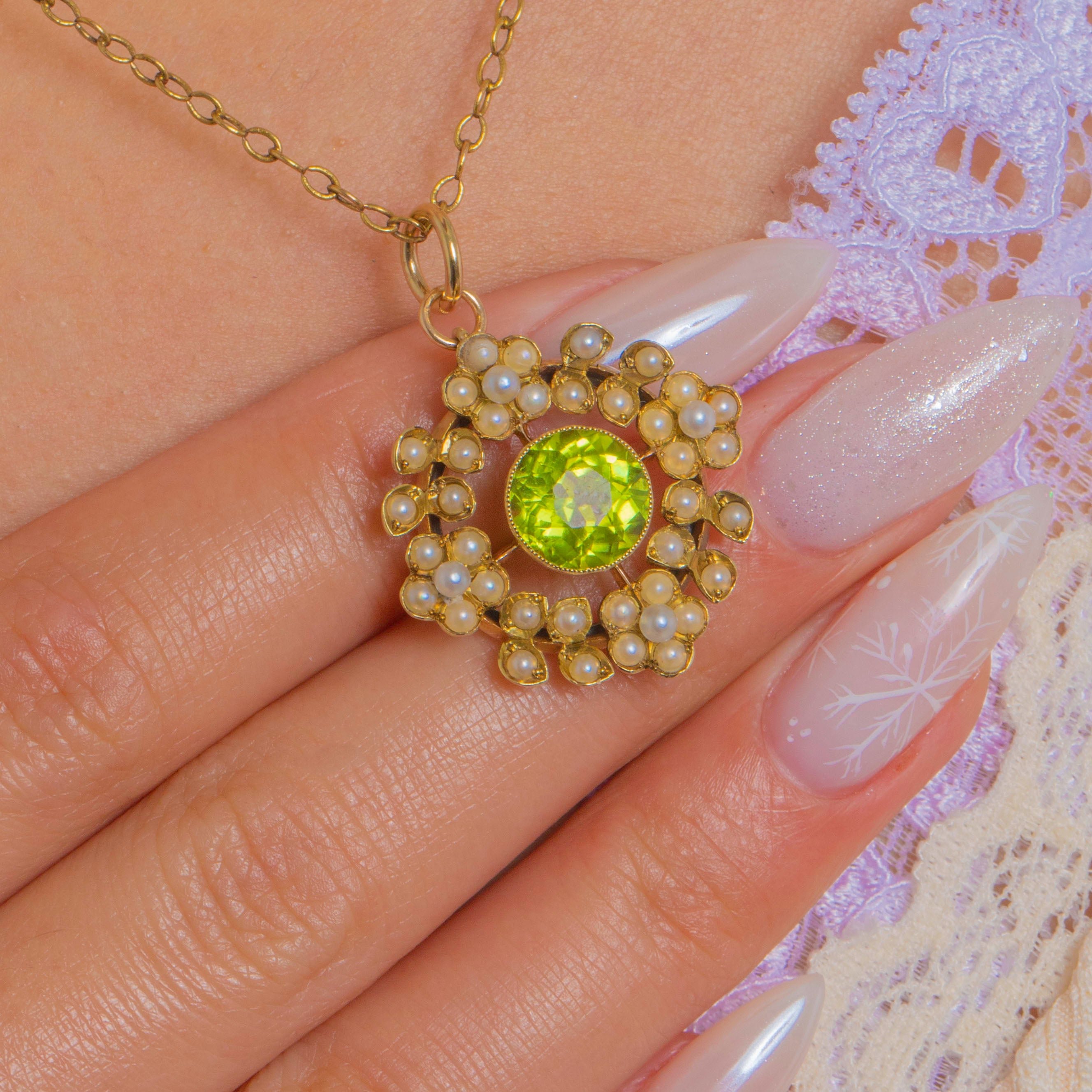 A jewel that blooms with Edwardian grace, this 18ct Gold pendant unfurls a vivid round Peridot within a halo of creamy Seed Pearls. The apple-green Peridot is enlivened by an open-backed setting that allows the light to stream through, while petite Pearls form a refined garland around the centre, lending softness and luminosity.