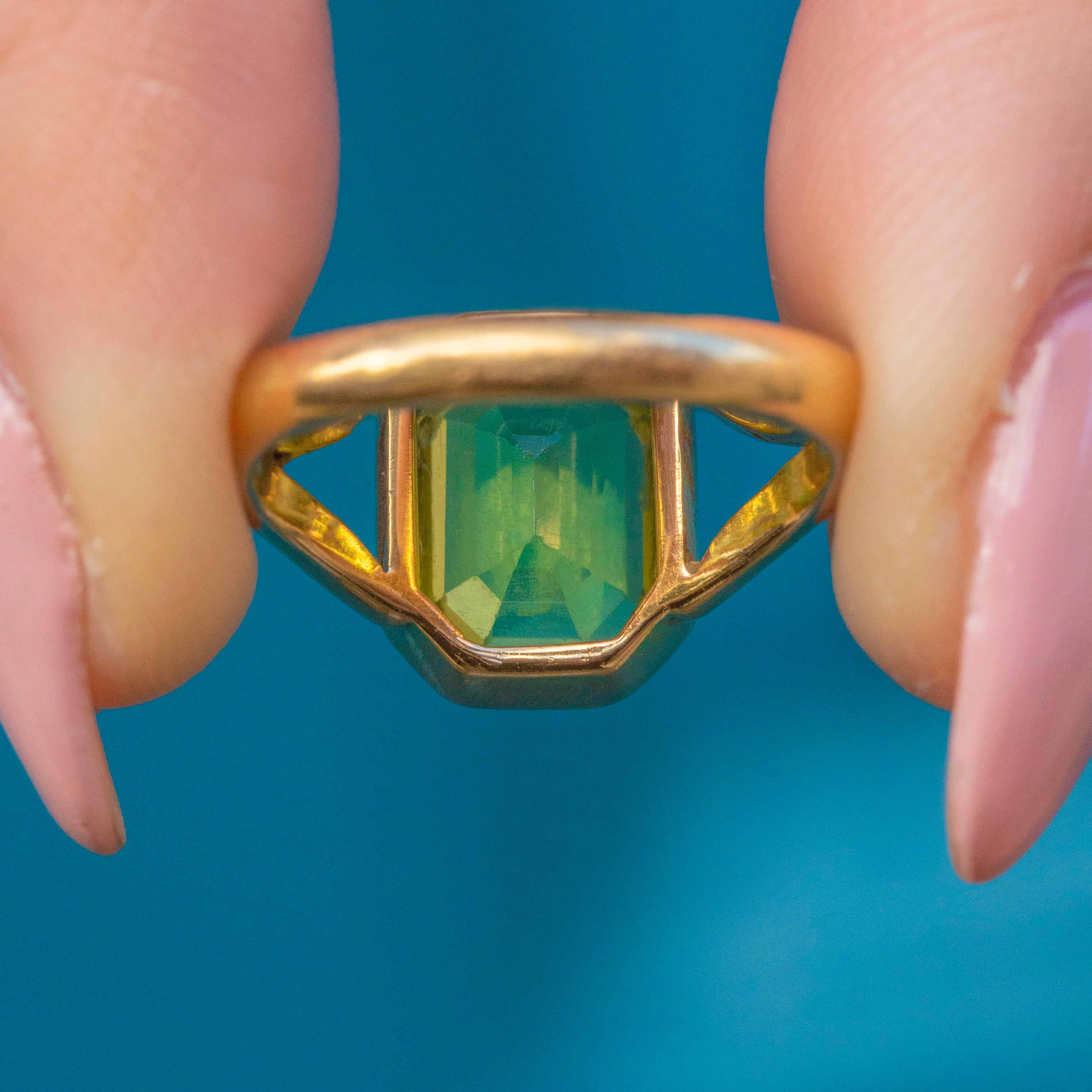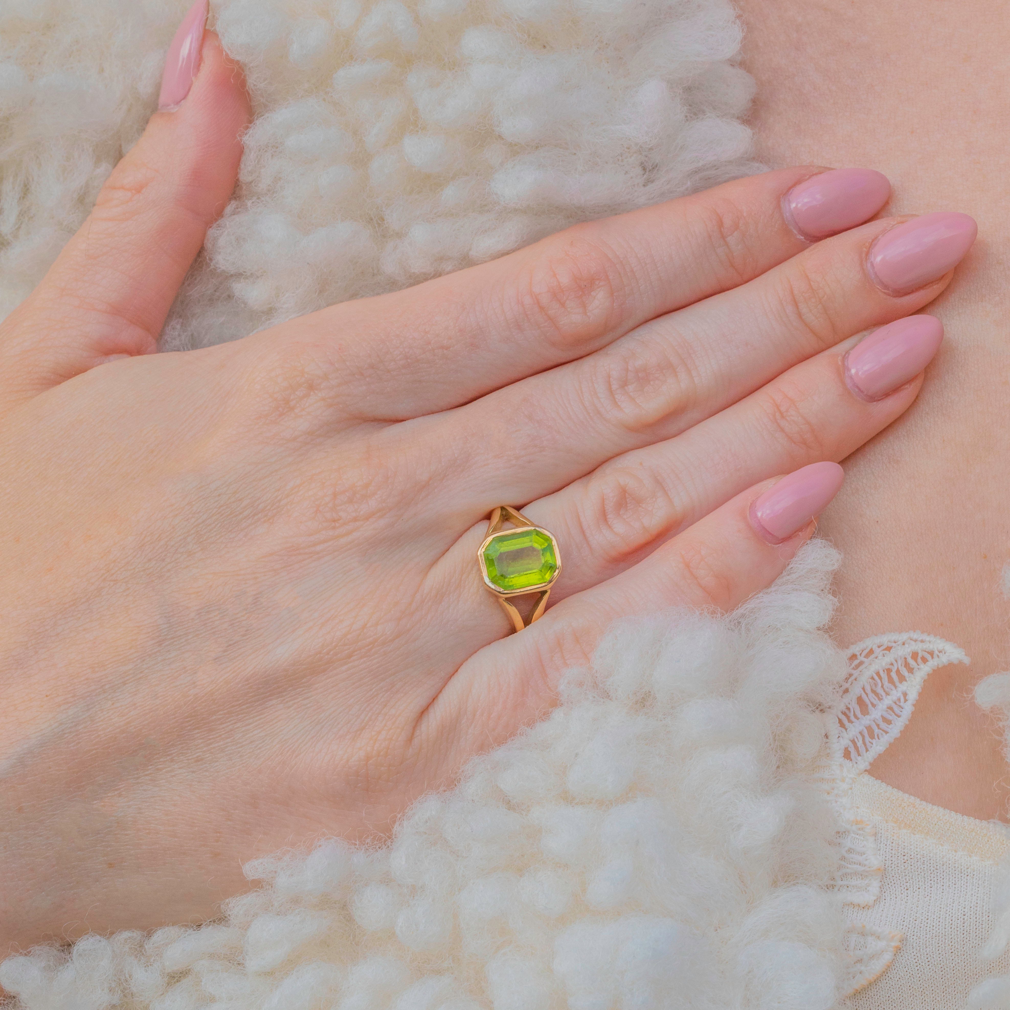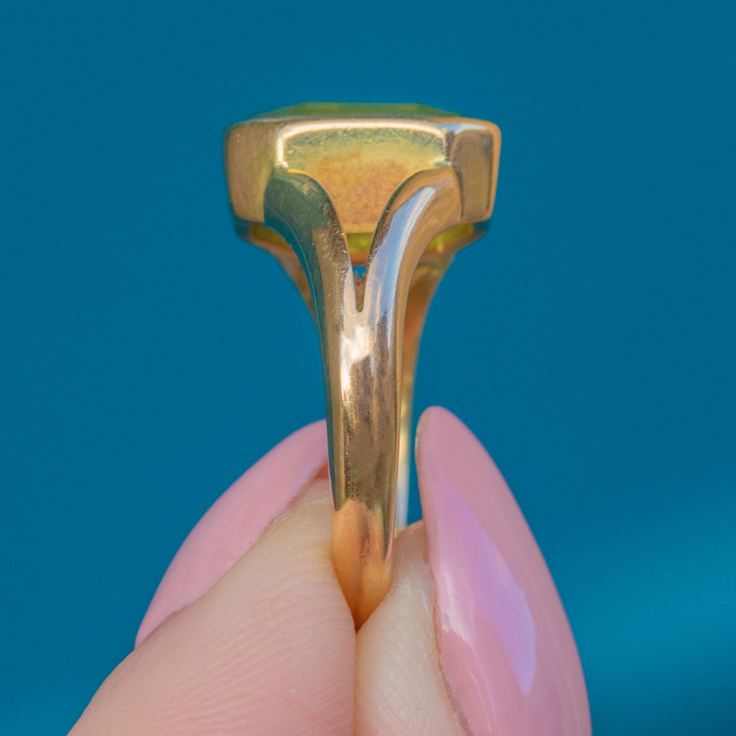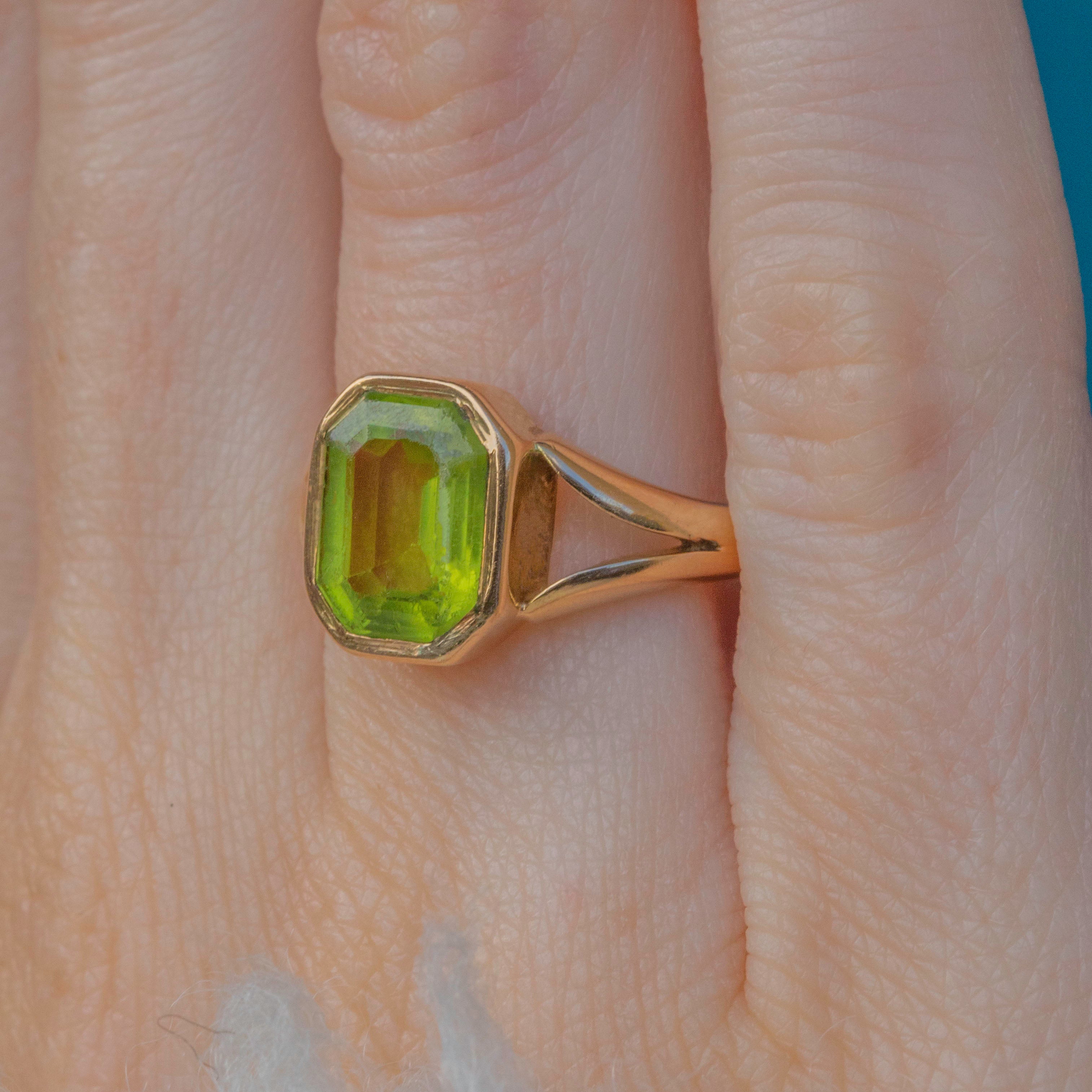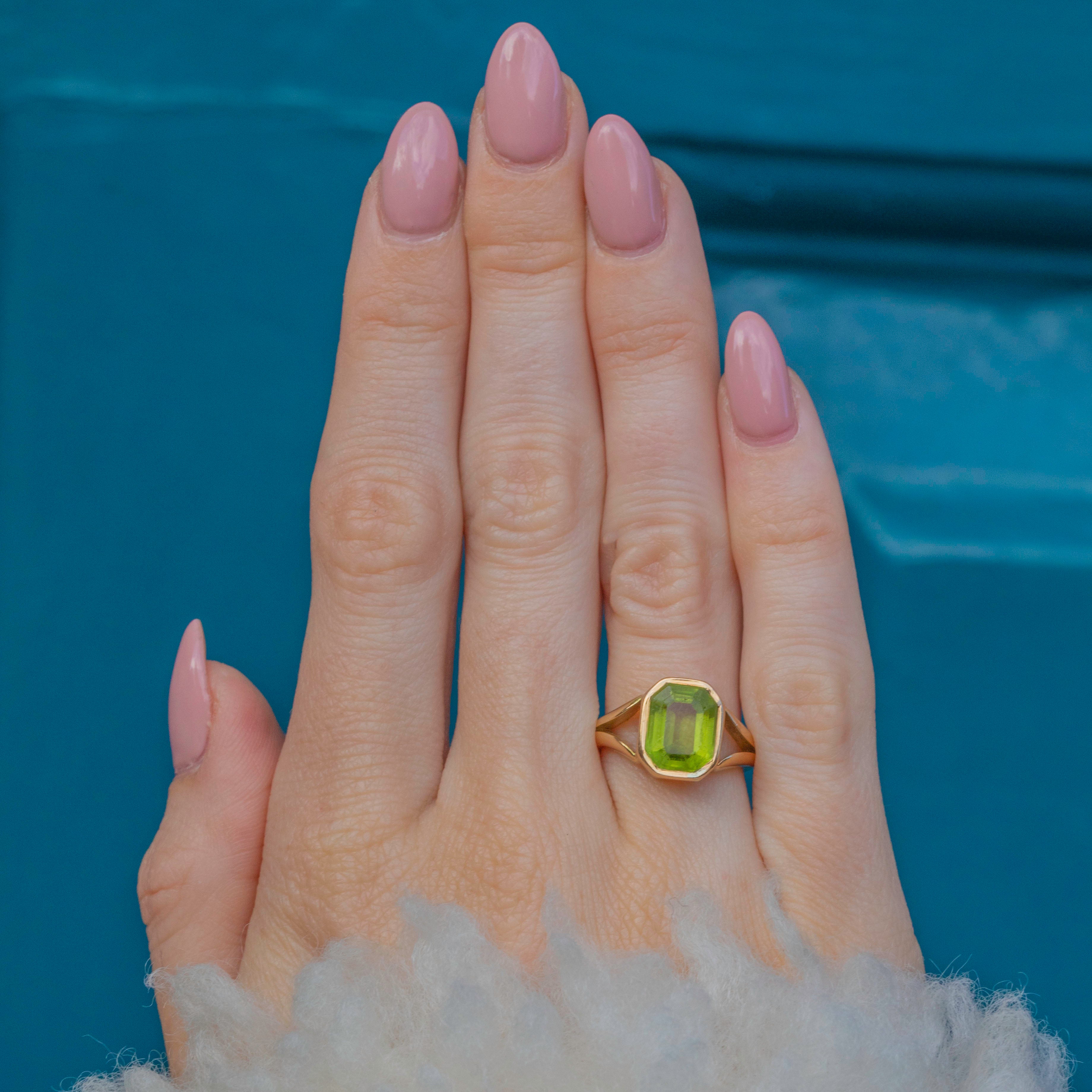 Bring some zest into your ring stack with this Edwardian 18ct Gold Peridot ring! Her 2.10ct Peridot flaunts vivid lime green hues, and with her Emerald cut set into a chunky 18ct Gold bezel setting, this Edwardian ring will perfectly complement any modern jewellery in your collection.