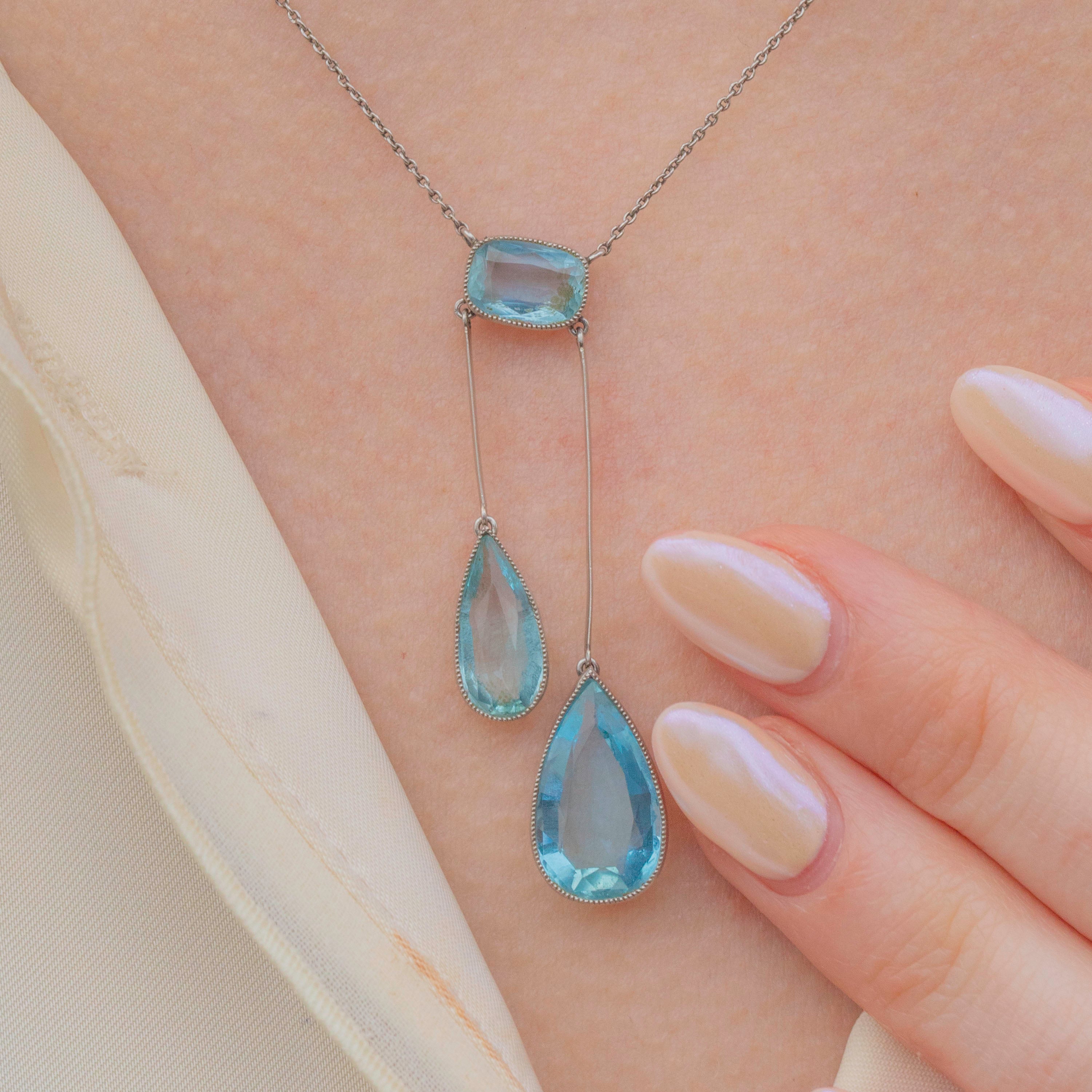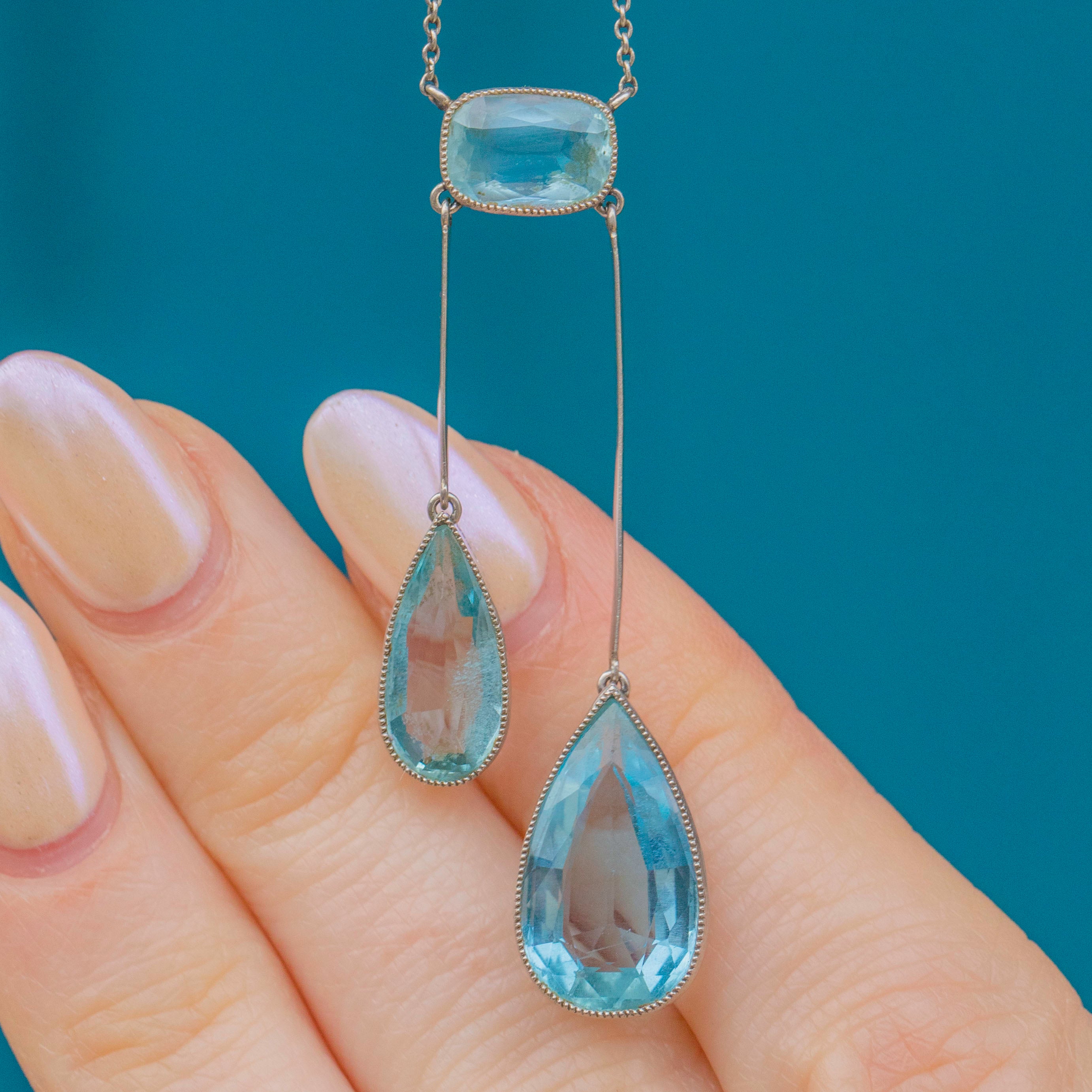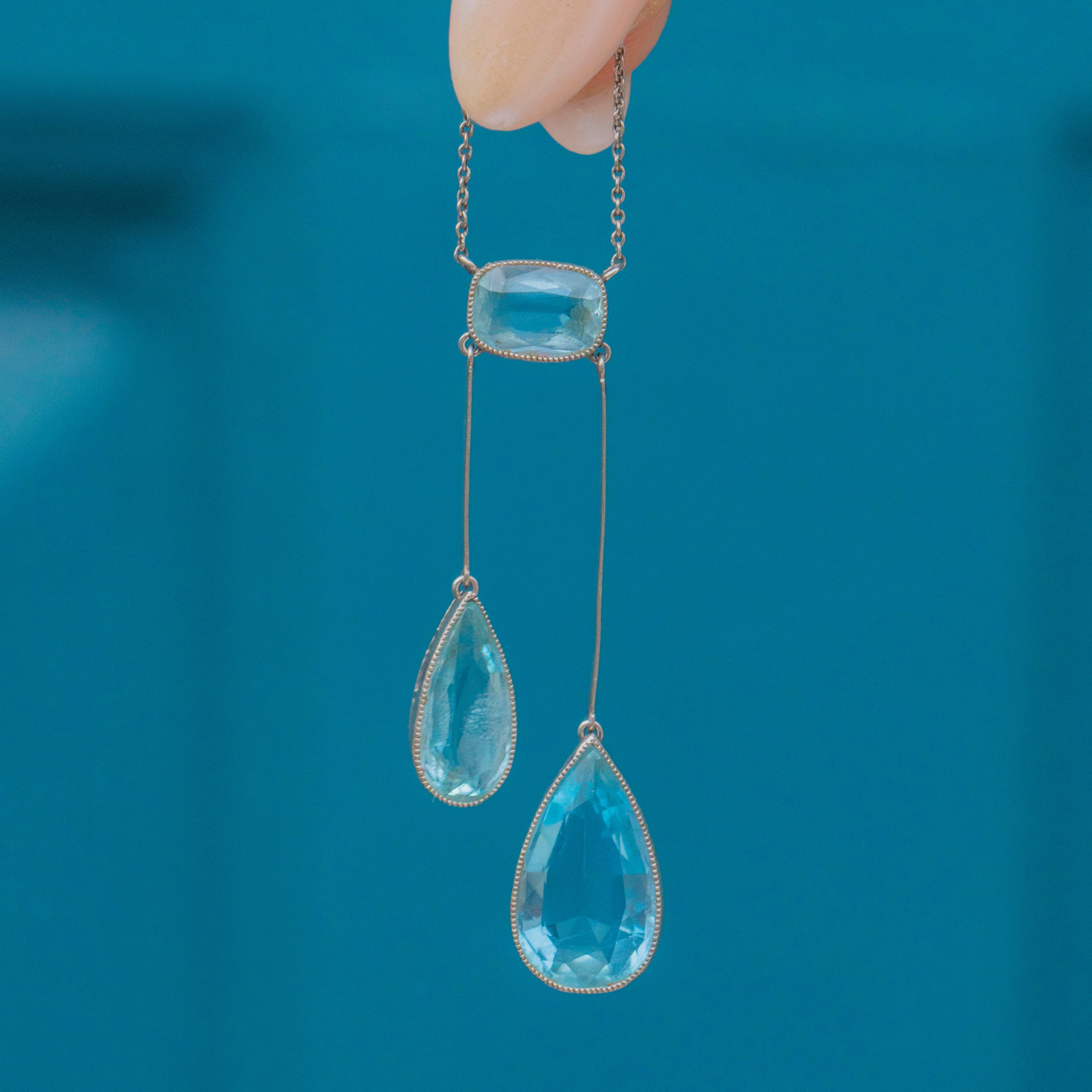 This antique necklaces features three stunning Aquamarine stones, boasting a combined carat weight of 5.40ct, each possessing a frosty pale blue hue. The gemstones are set within lustrous Platinum settings in classic Edwardian negligee style.