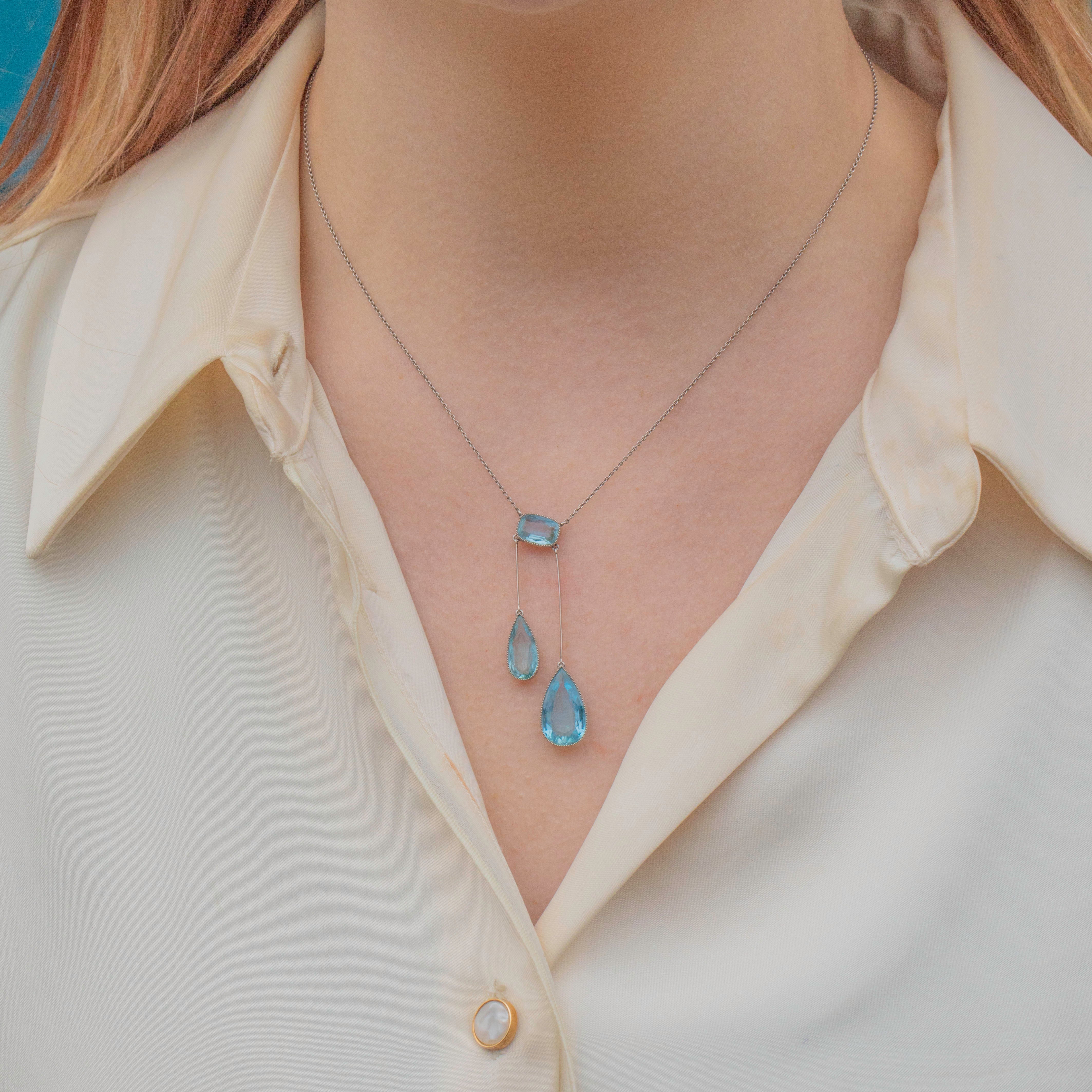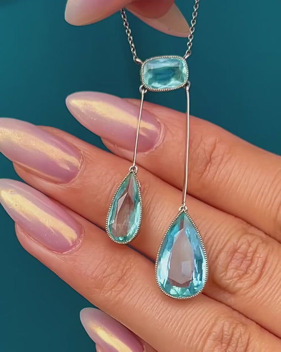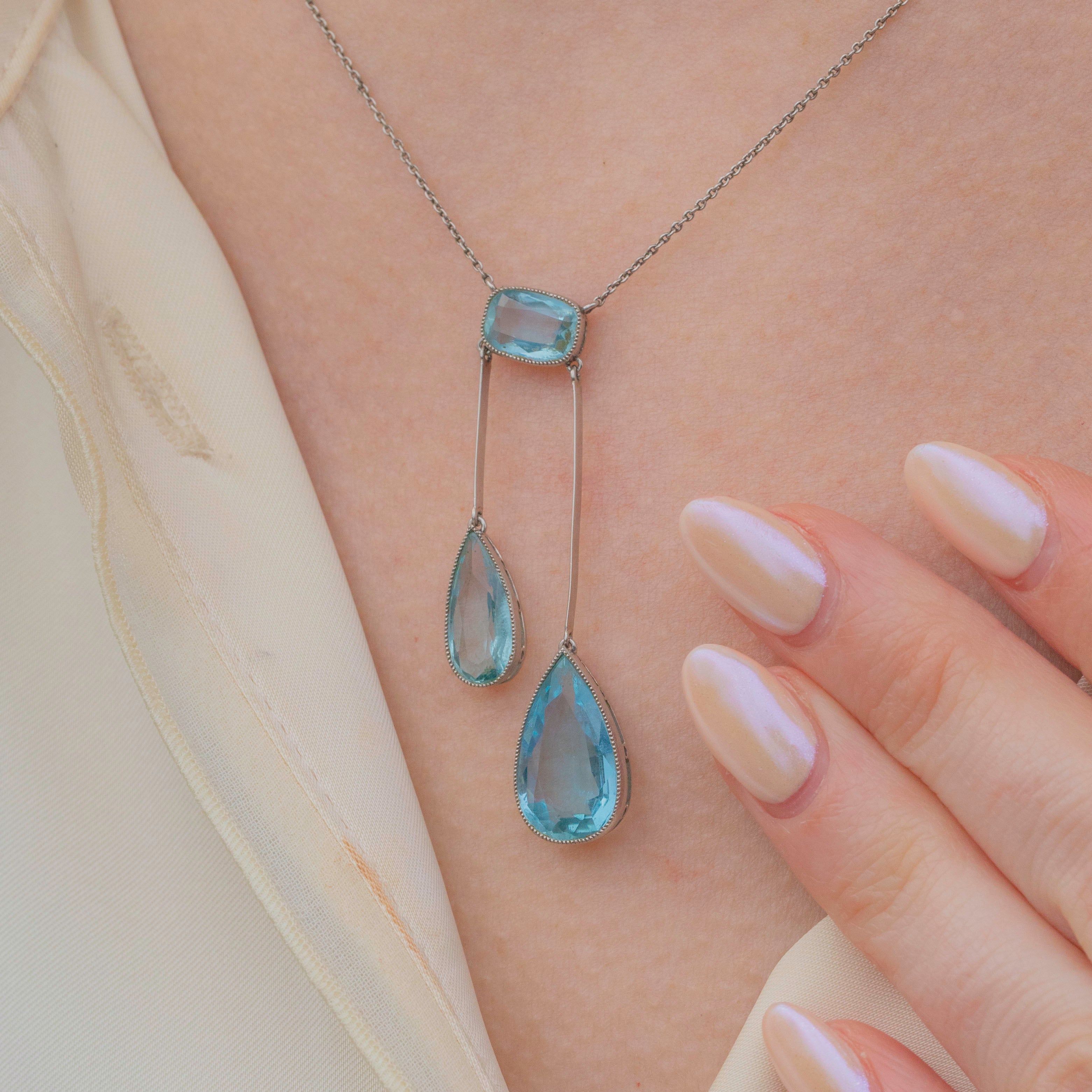 This antique necklaces features three stunning Aquamarine stones, boasting a combined carat weight of 5.40ct, each possessing a frosty pale blue hue. The gemstones are set within lustrous Platinum settings in classic Edwardian negligee style.