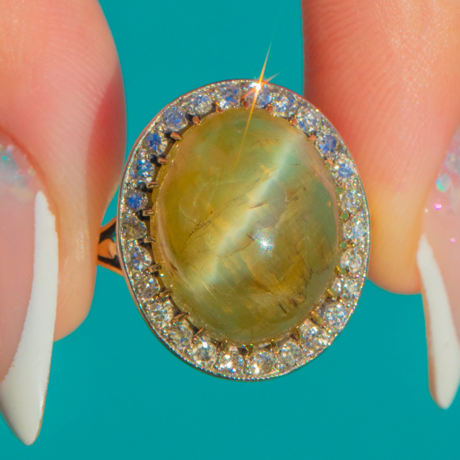 Victorian 18ct Gold & Platinum Cat's Eye Chrysoberyl Diamond Halo Ring