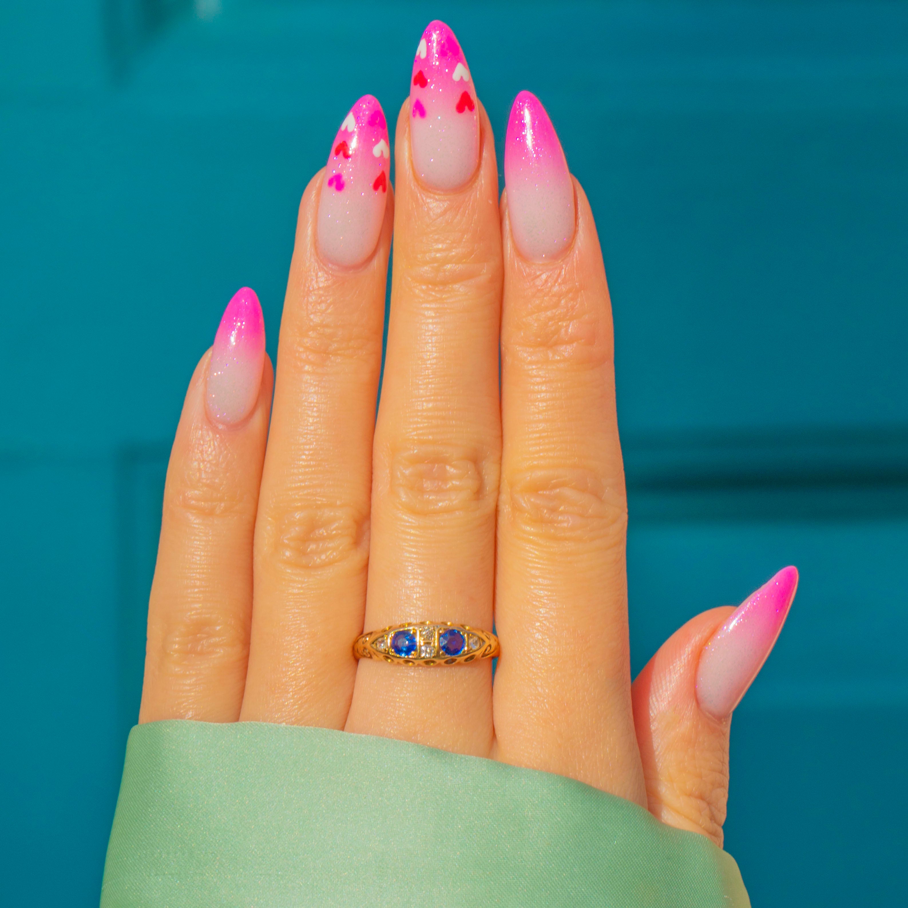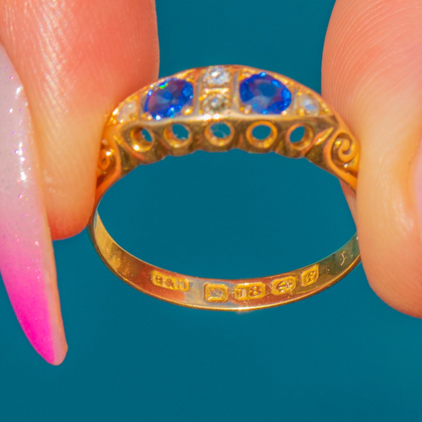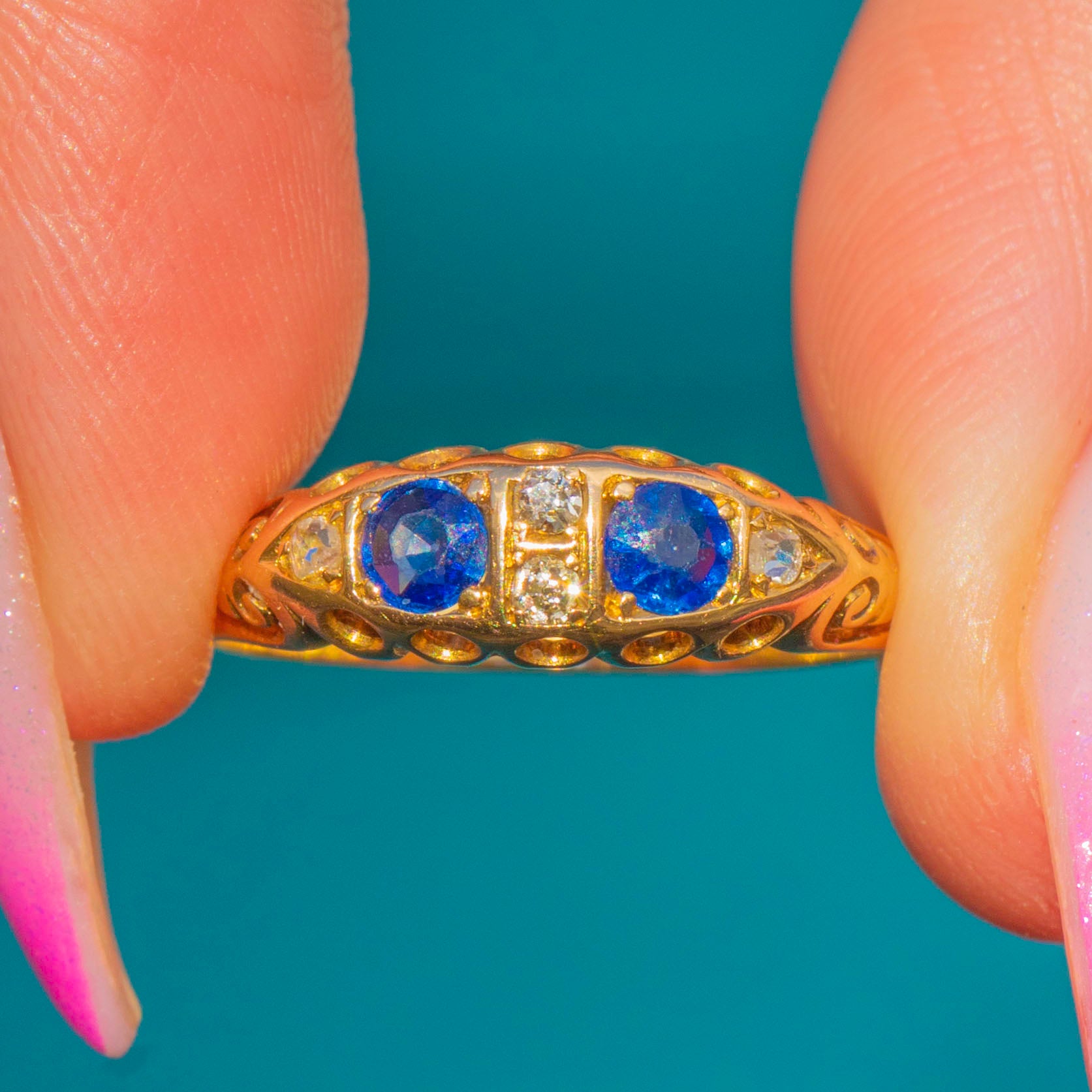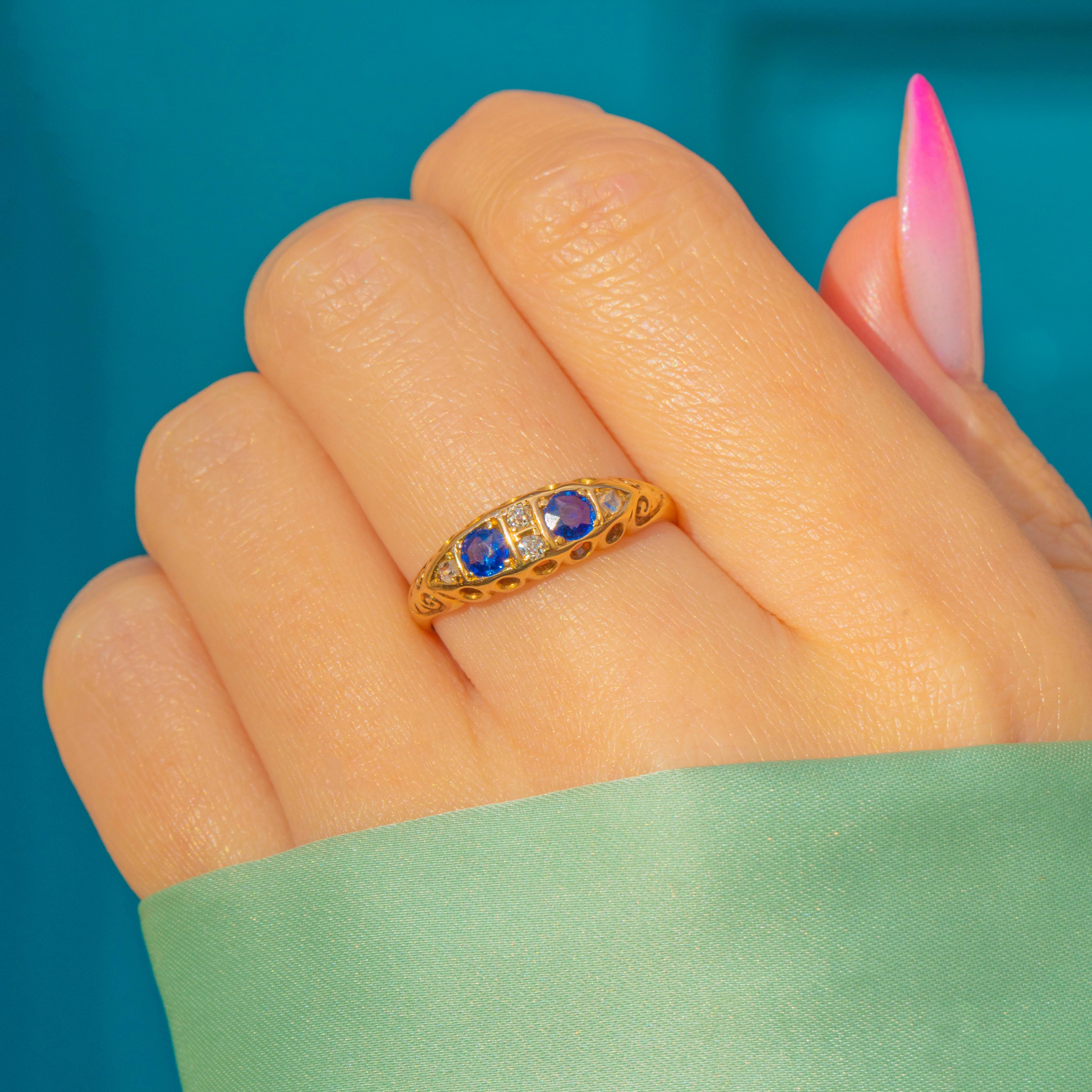 A quintessential Edwardian beauty, this 18ct Gold Sapphire and Diamond boat ring is dated 1905 and brims with period elegance. Two deep, velvety blue Sapphires are nestled between sparkling Diamonds, all set low in a softly tapered boat-head that flows into finely engraved foliate and scroll shoulders.