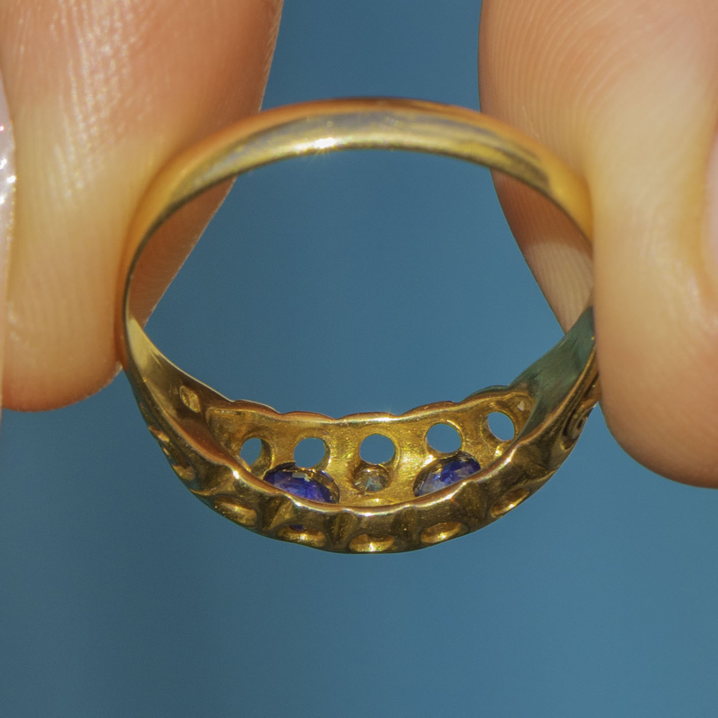 EXCELLENT: The Sapphires and Diamonds are bright with minimal facet wear, all securely set. The 18ct Gold shank and engraved shoulders show only light surface wear consistent with age and remain crisp and well-defined. A beautifully preserved Edwardian ring, ready to wear and enjoy.