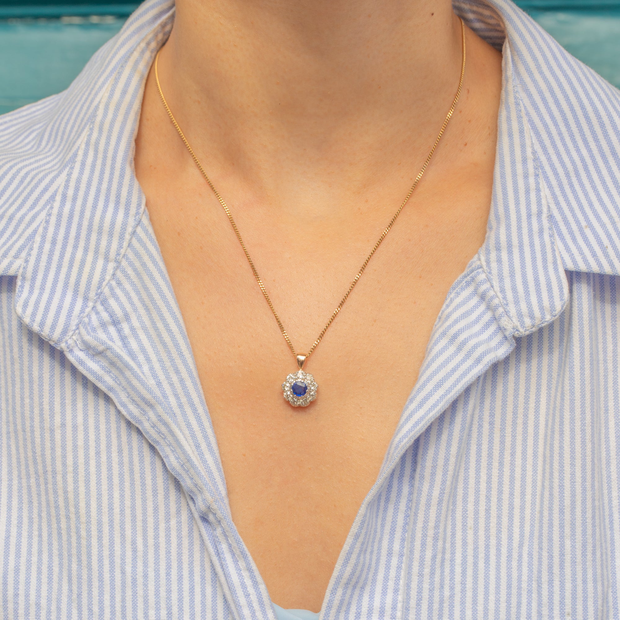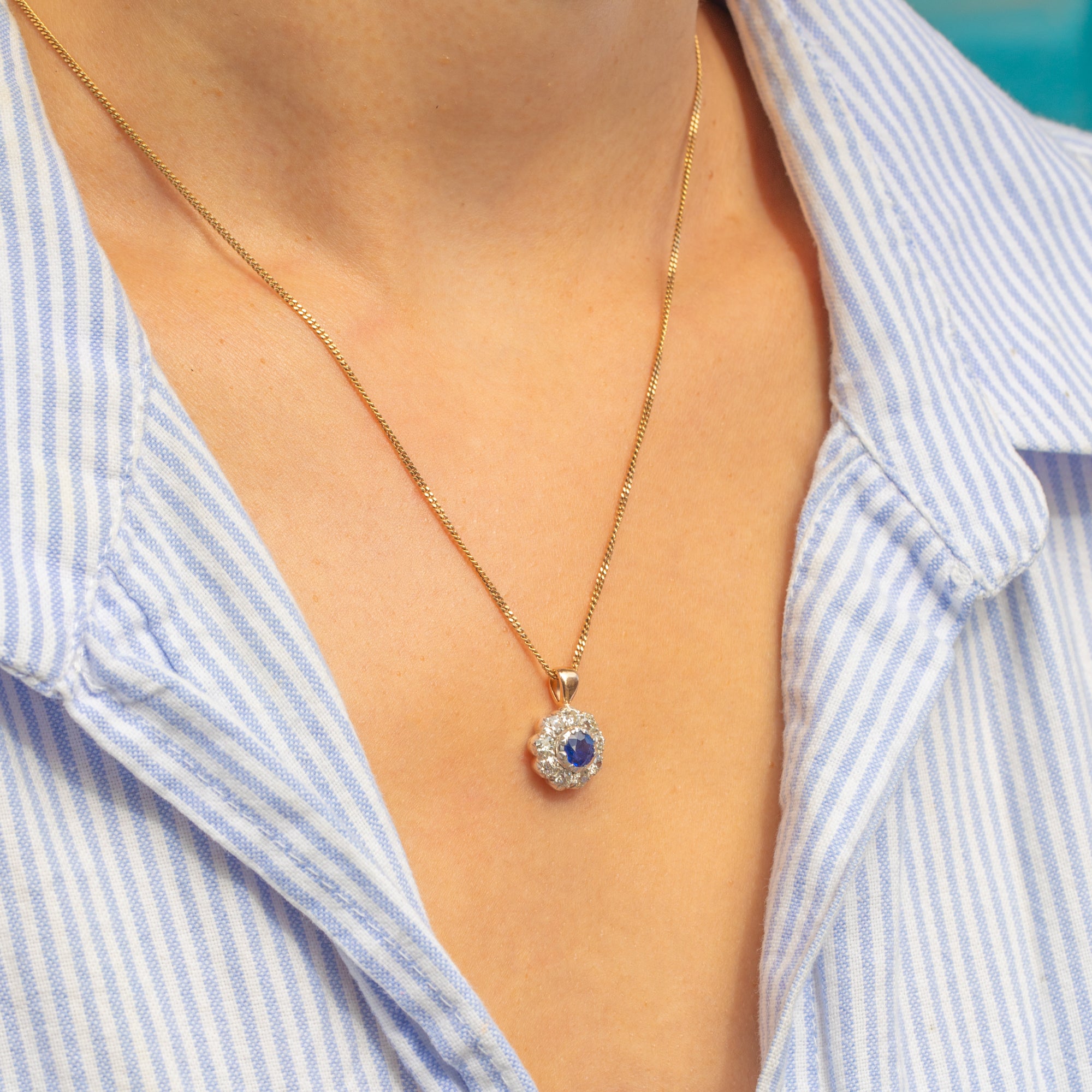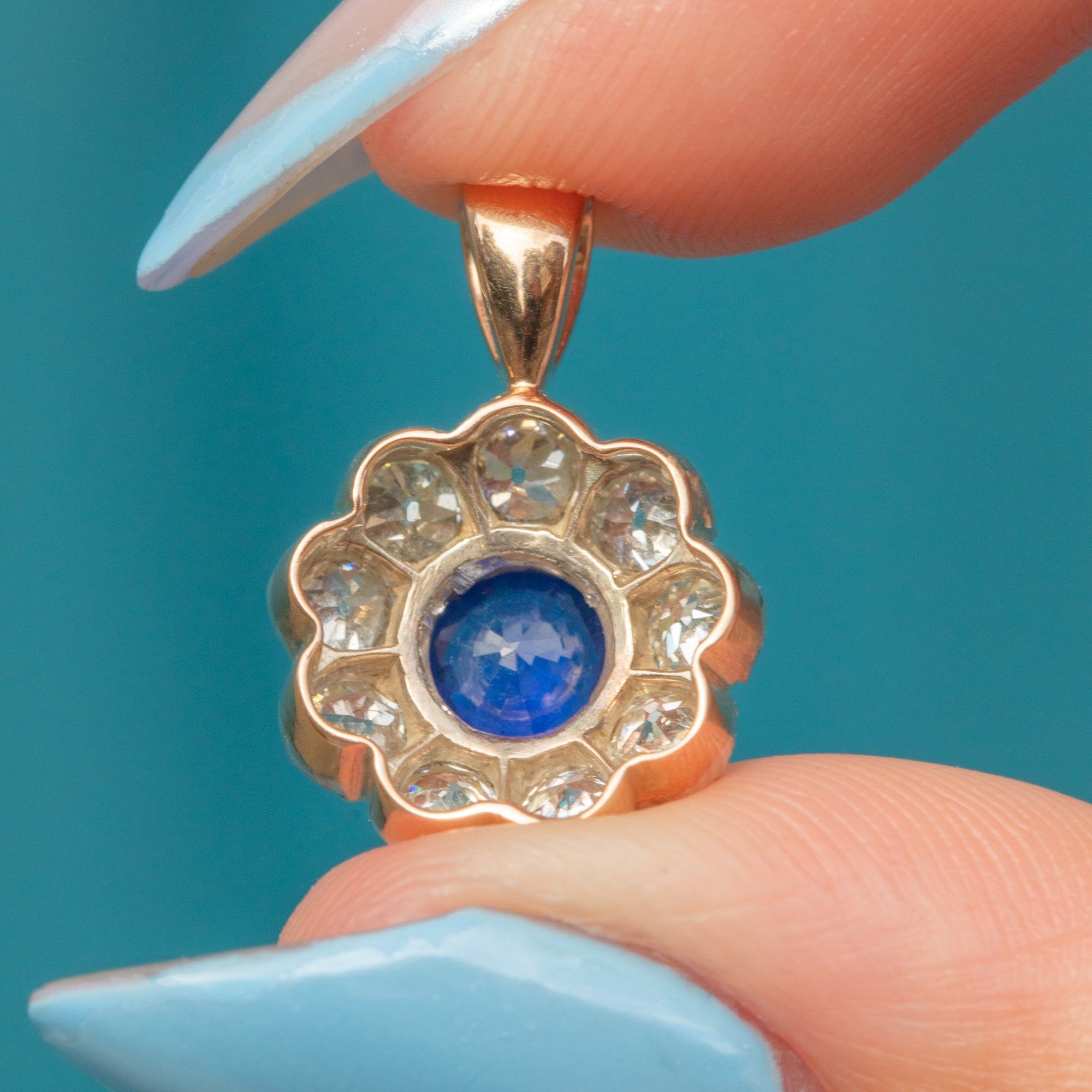 Boasting a resplendent natural royal blue Sapphire encircled by a halo of scintillating old-European-cut Diamonds, this antique 18ct Gold pendant dazzles from all angles!